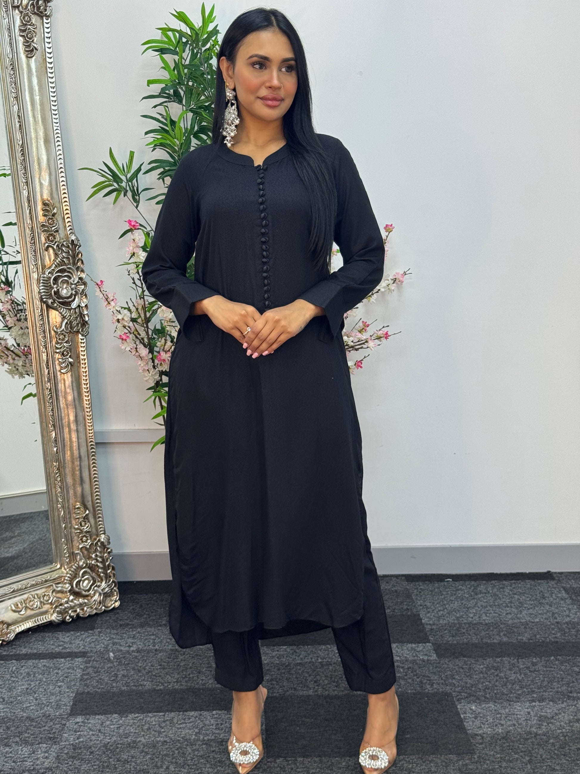 • heavily embroidered shirt with buttons on neckline, heavy detailing on front back daman