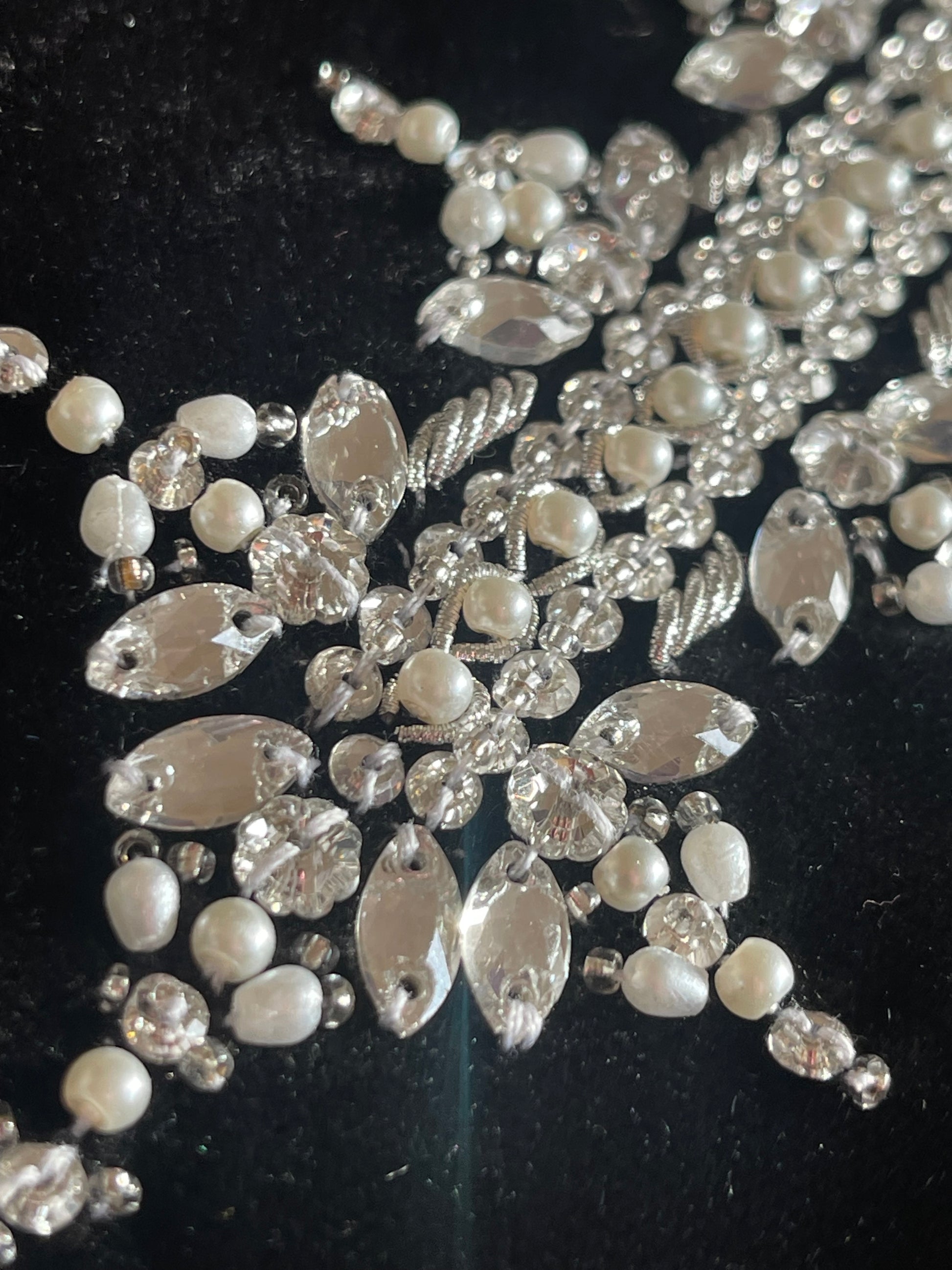 • Comfortable, stylish silk trousers adorned with pearl detailing on the edges.
