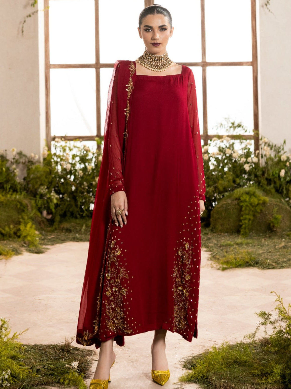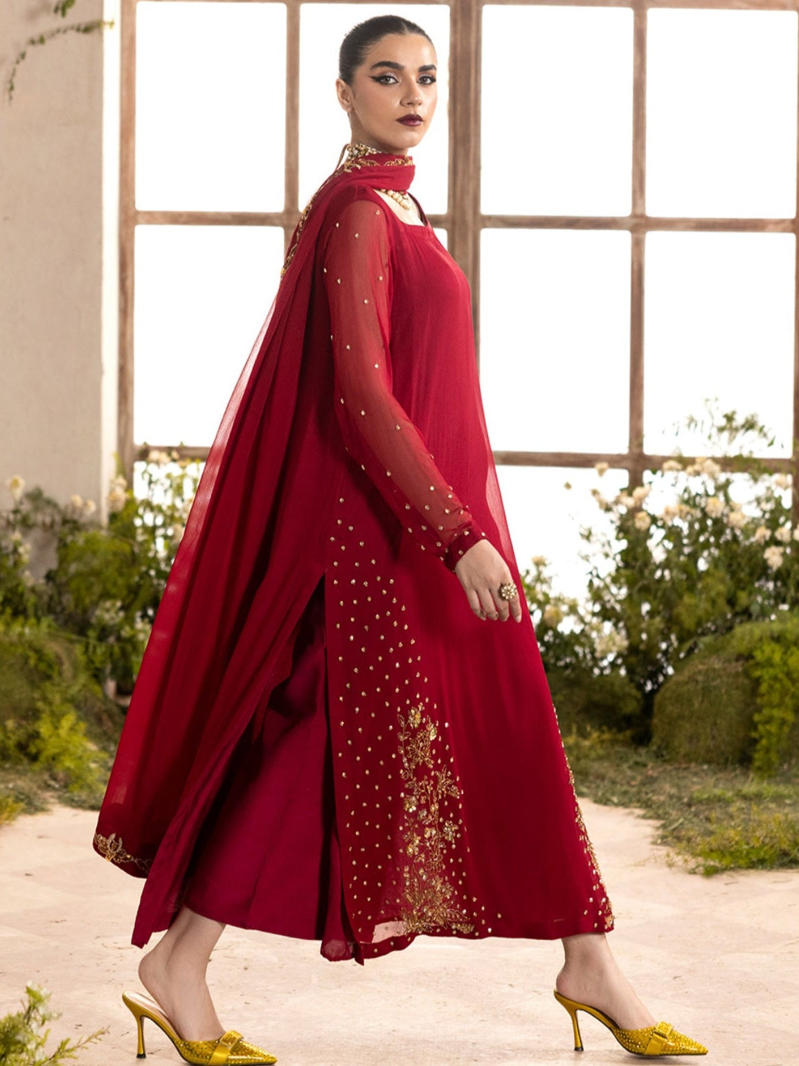 The look is completed with a beautiful extra-long dupatta adorned with embriodery, making it the perfect choice for any special occasion.