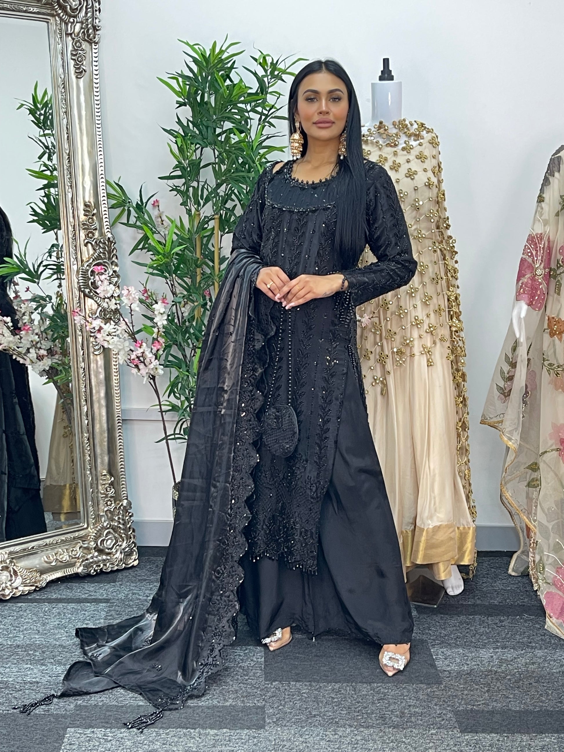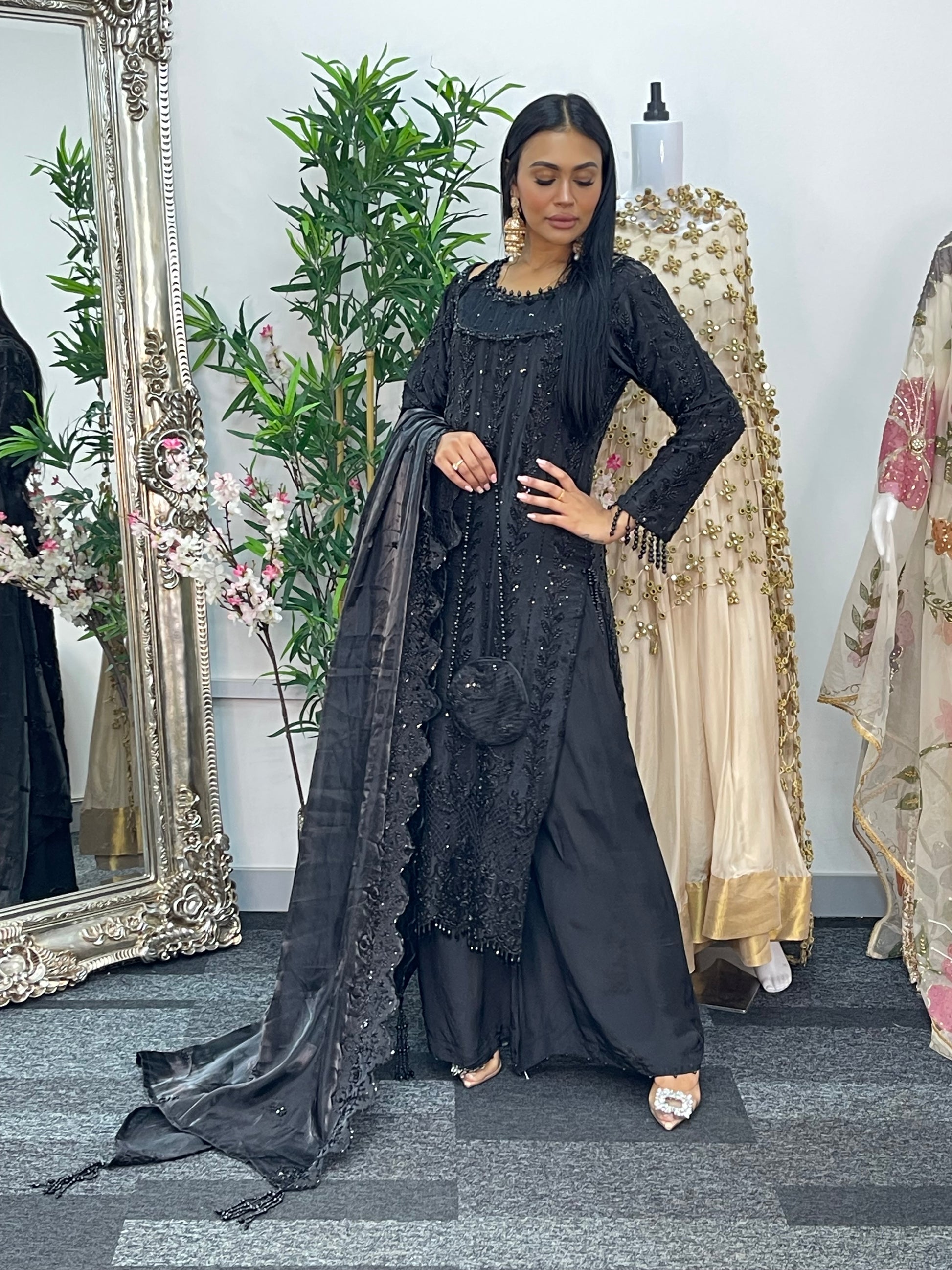 Accompanying the shirt, plazo pants are designed with exquisite pearl, adding a touch of luxury.