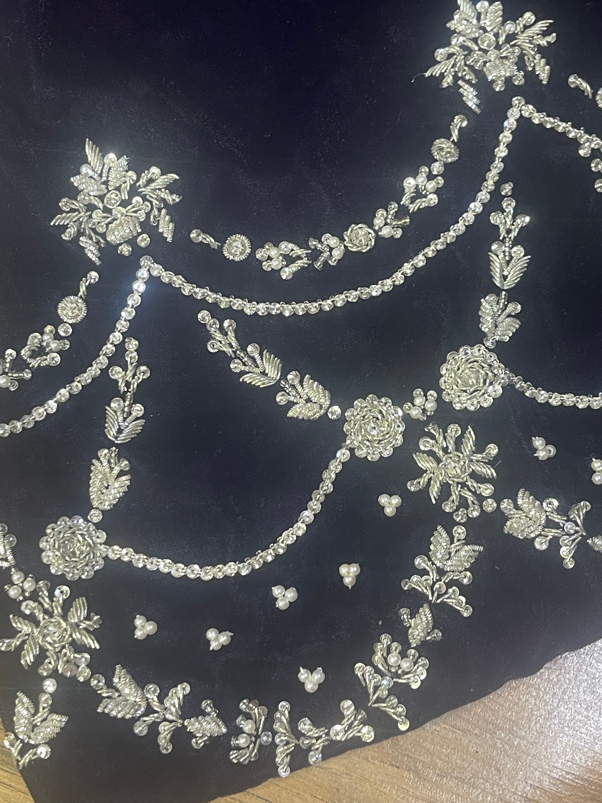 The ensemble is complemented by a beautifully draped chiffon dupatta, adorned with sequin sprays and delicate goti detailing on all four sides, ensuring a perfect blend of style and sophistication.