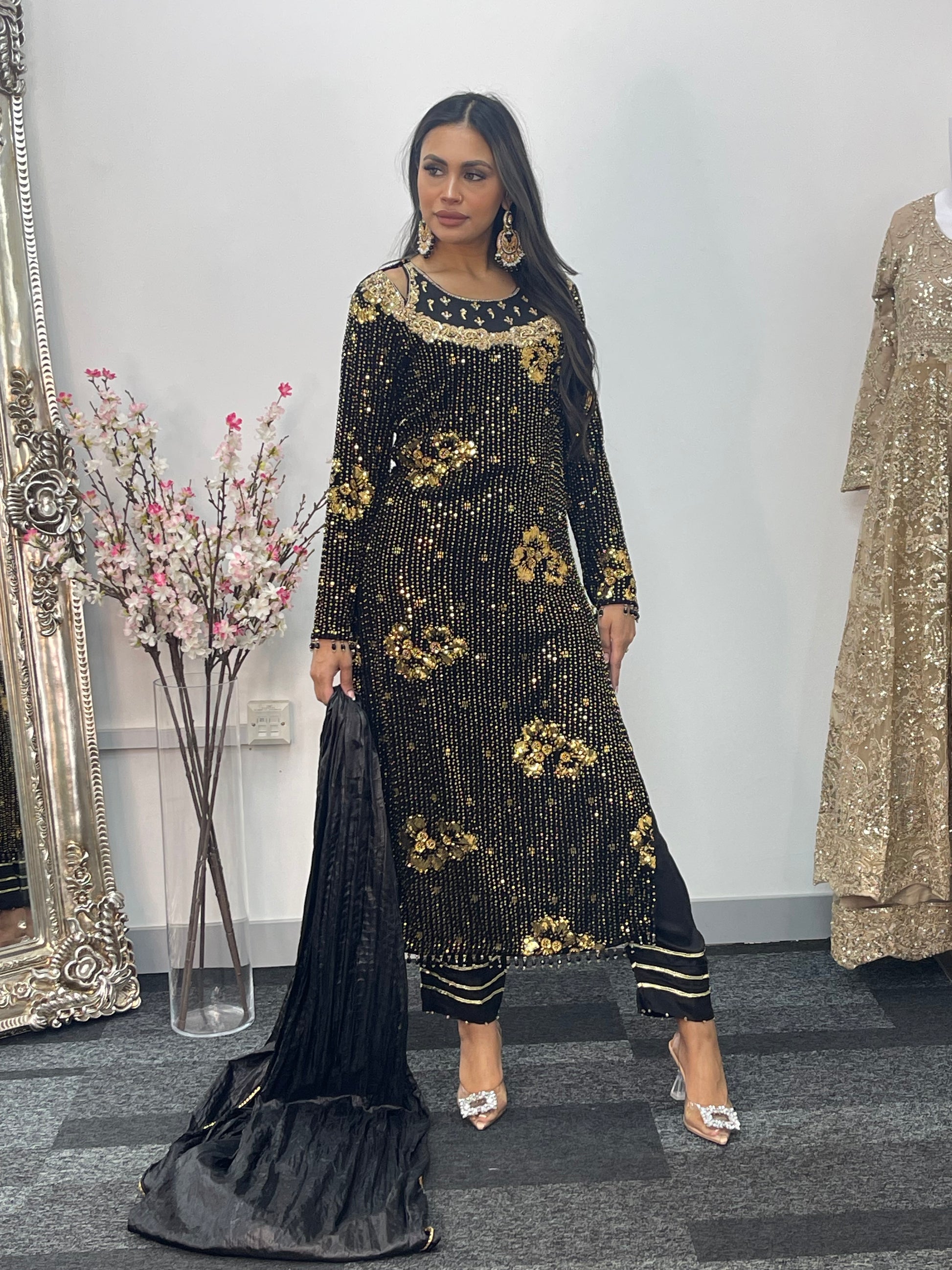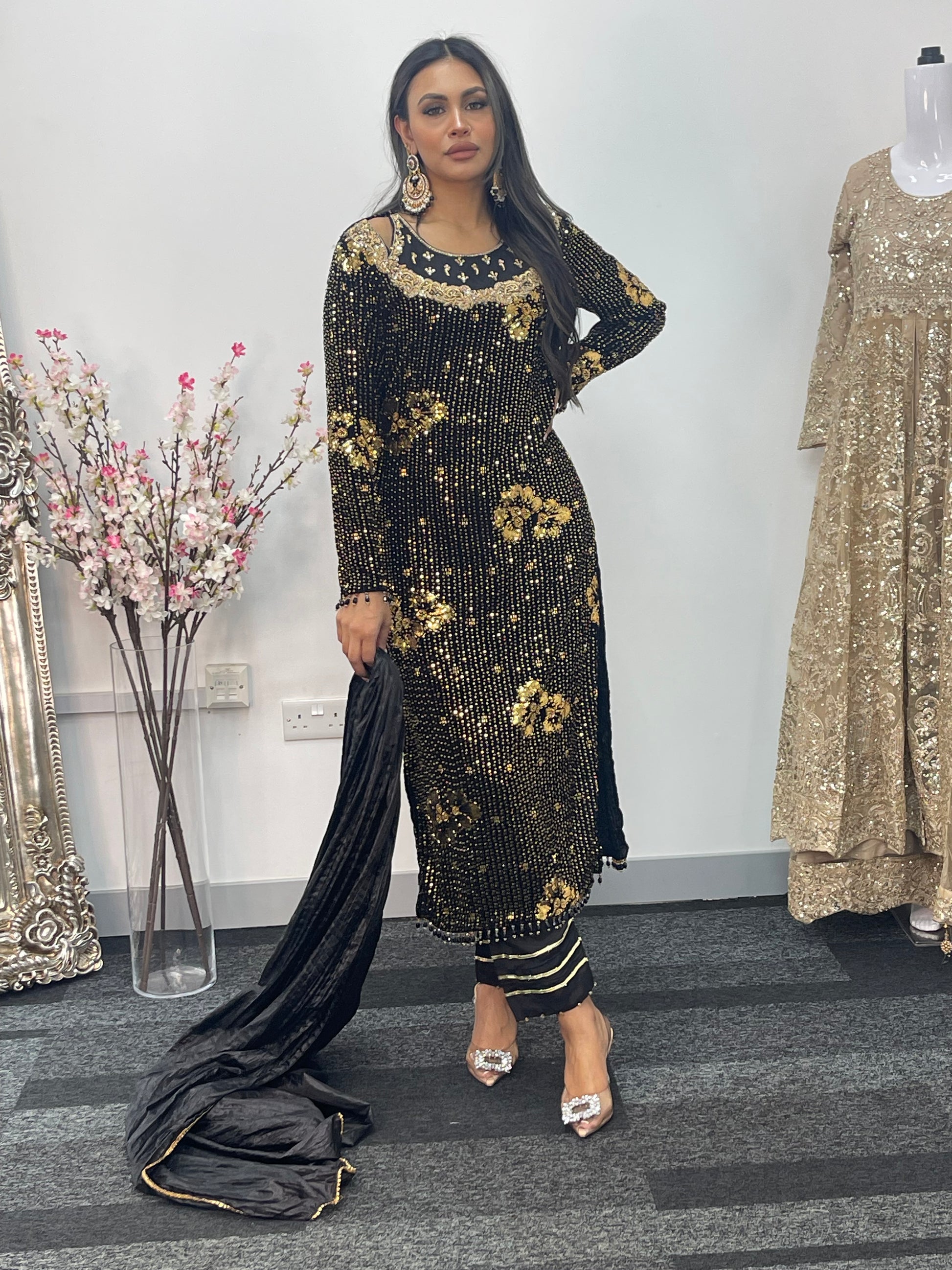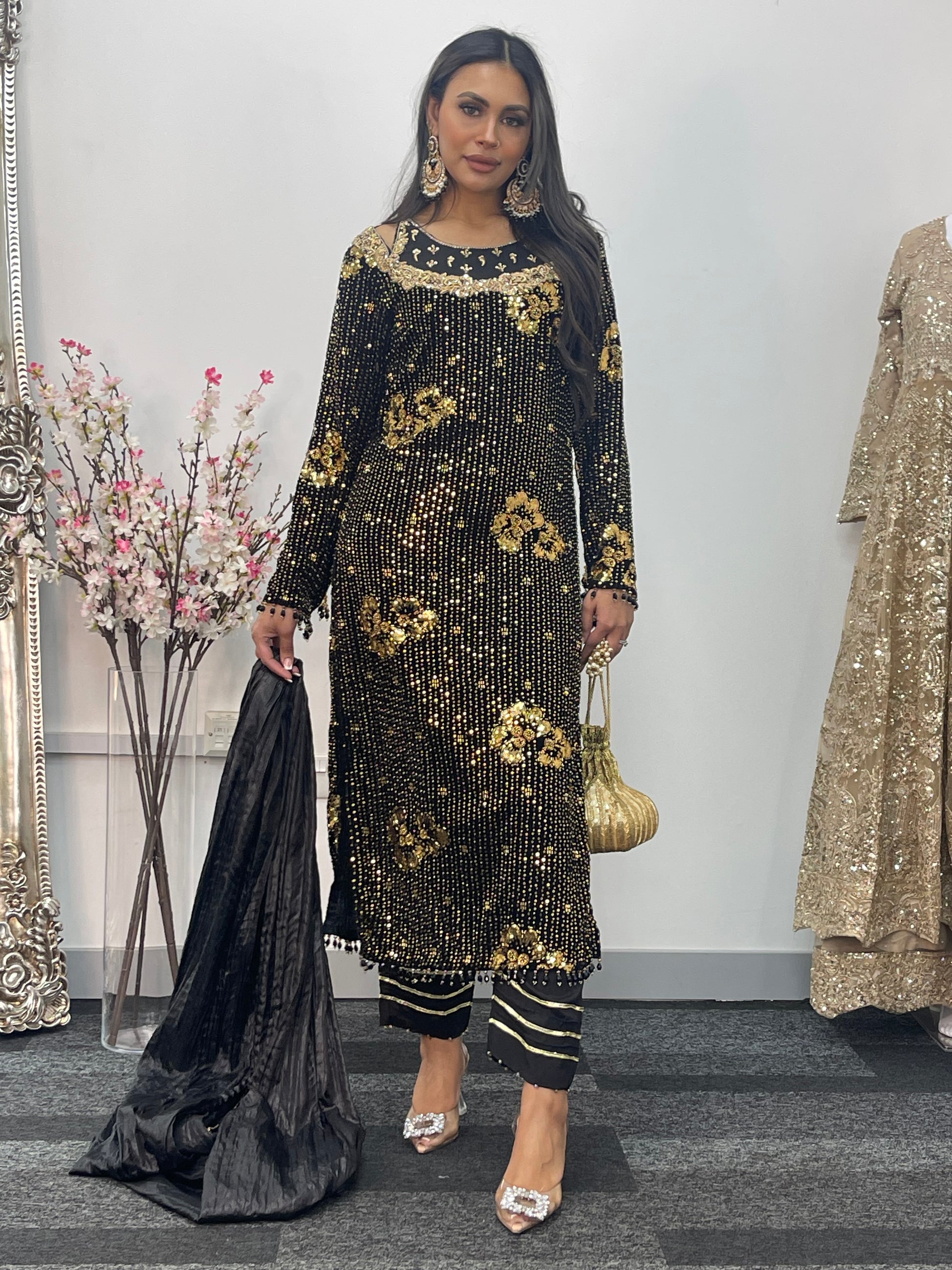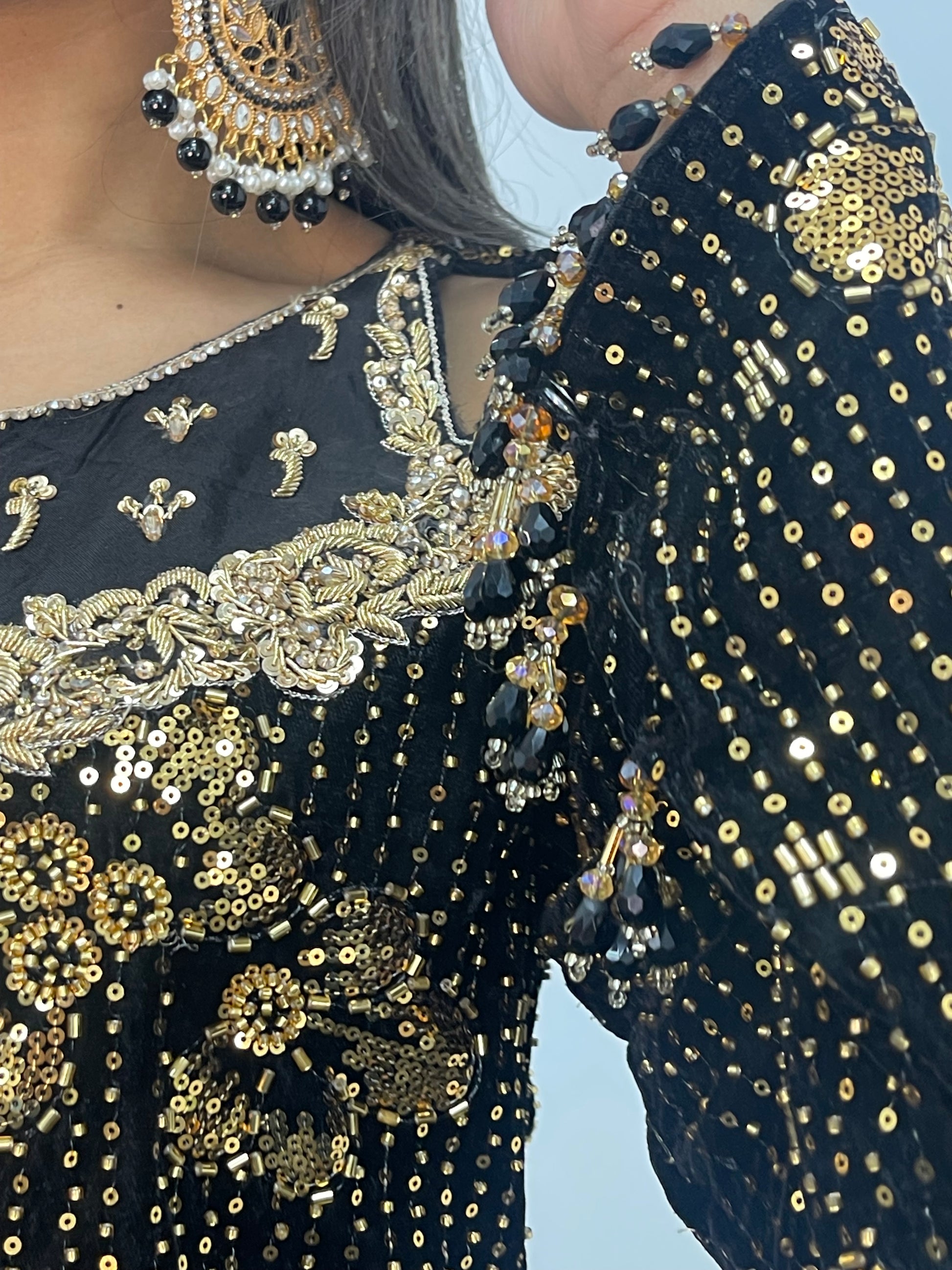 Elevate your style with this stunning Velvet Cutdana ensemble, expertly crafted to make a lasting impression. The intricately embroidered front and back of this beautiful attire are adorned with crystal details, adding a touch of opulence and sophistication.