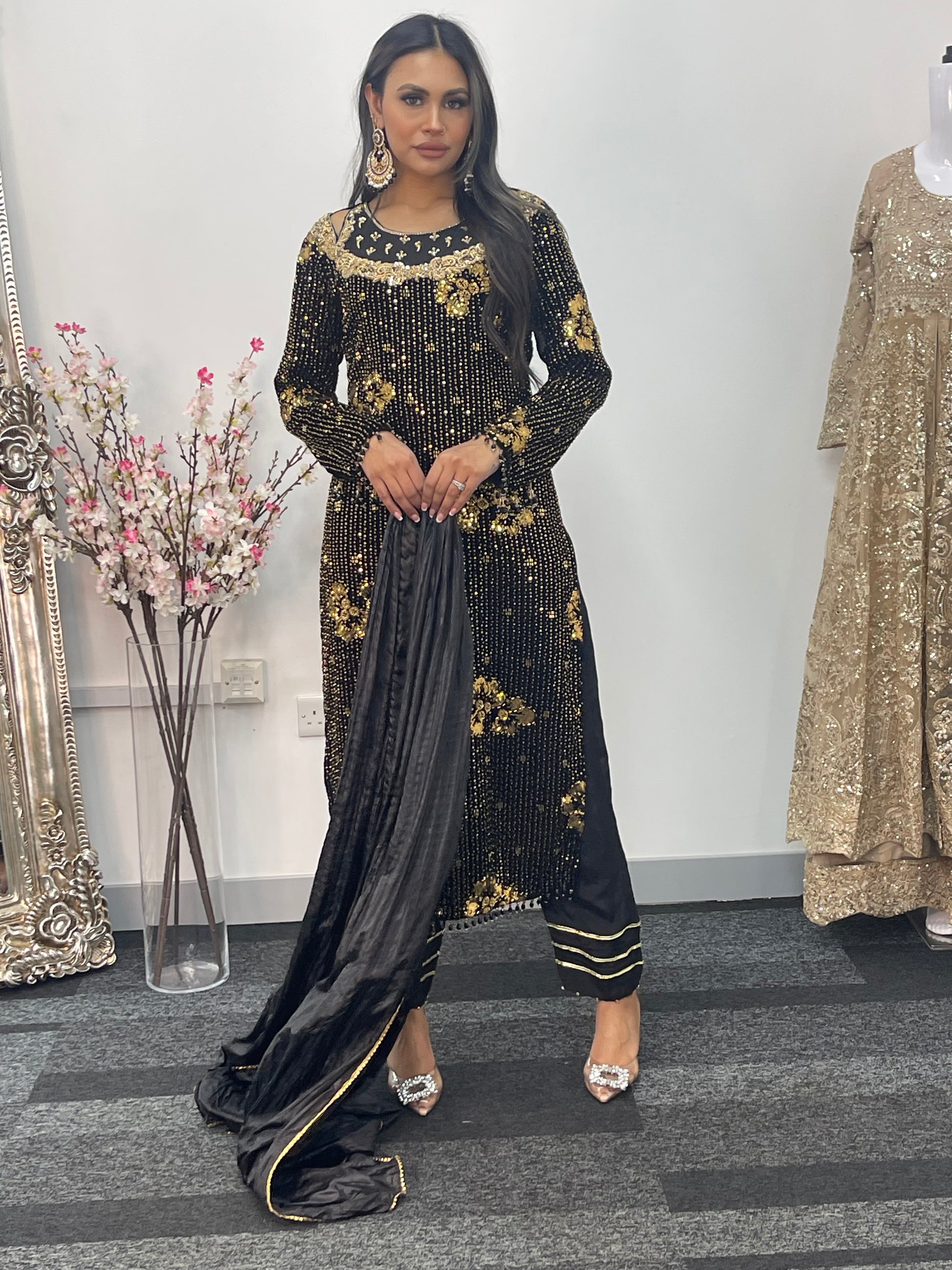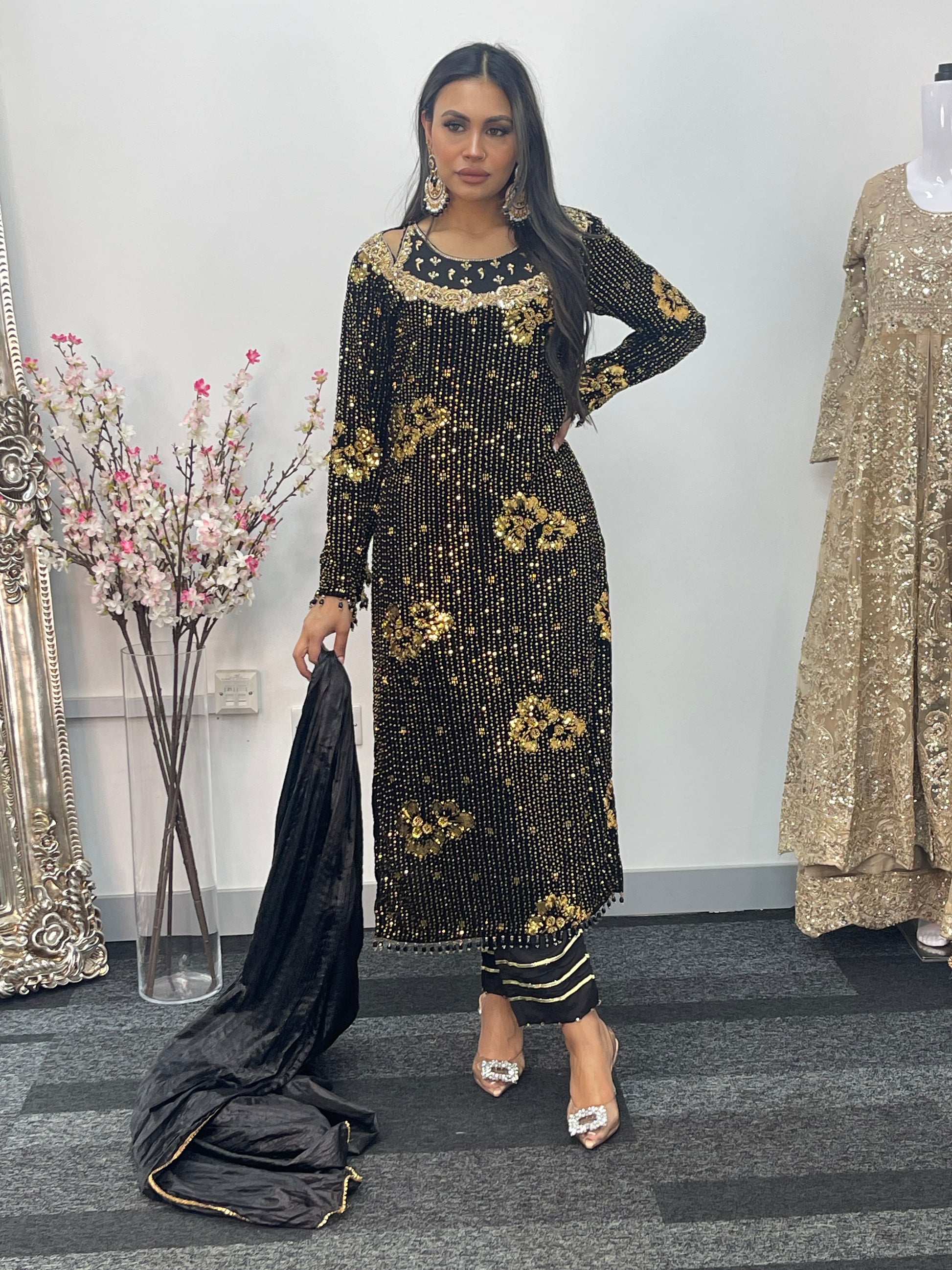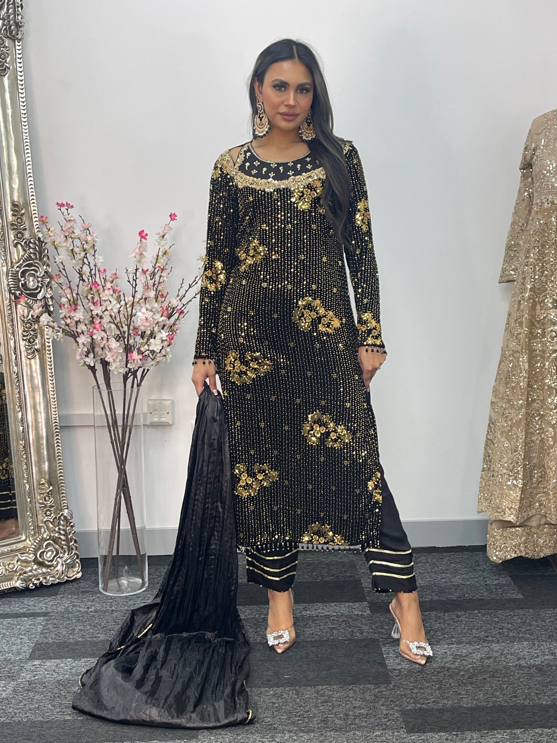 Elevate your style with this stunning Velvet Cutdana ensemble, expertly crafted to make a lasting impression. The intricately embroidered front and back of this beautiful attire are adorned with crystal details, adding a touch of opulence and sophistication.