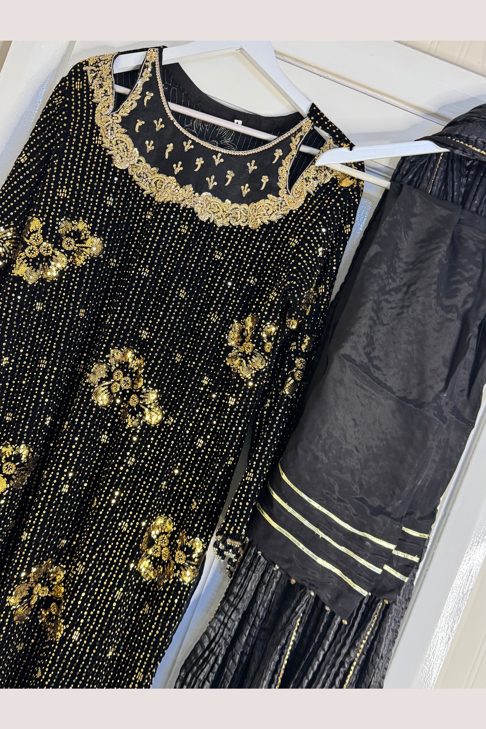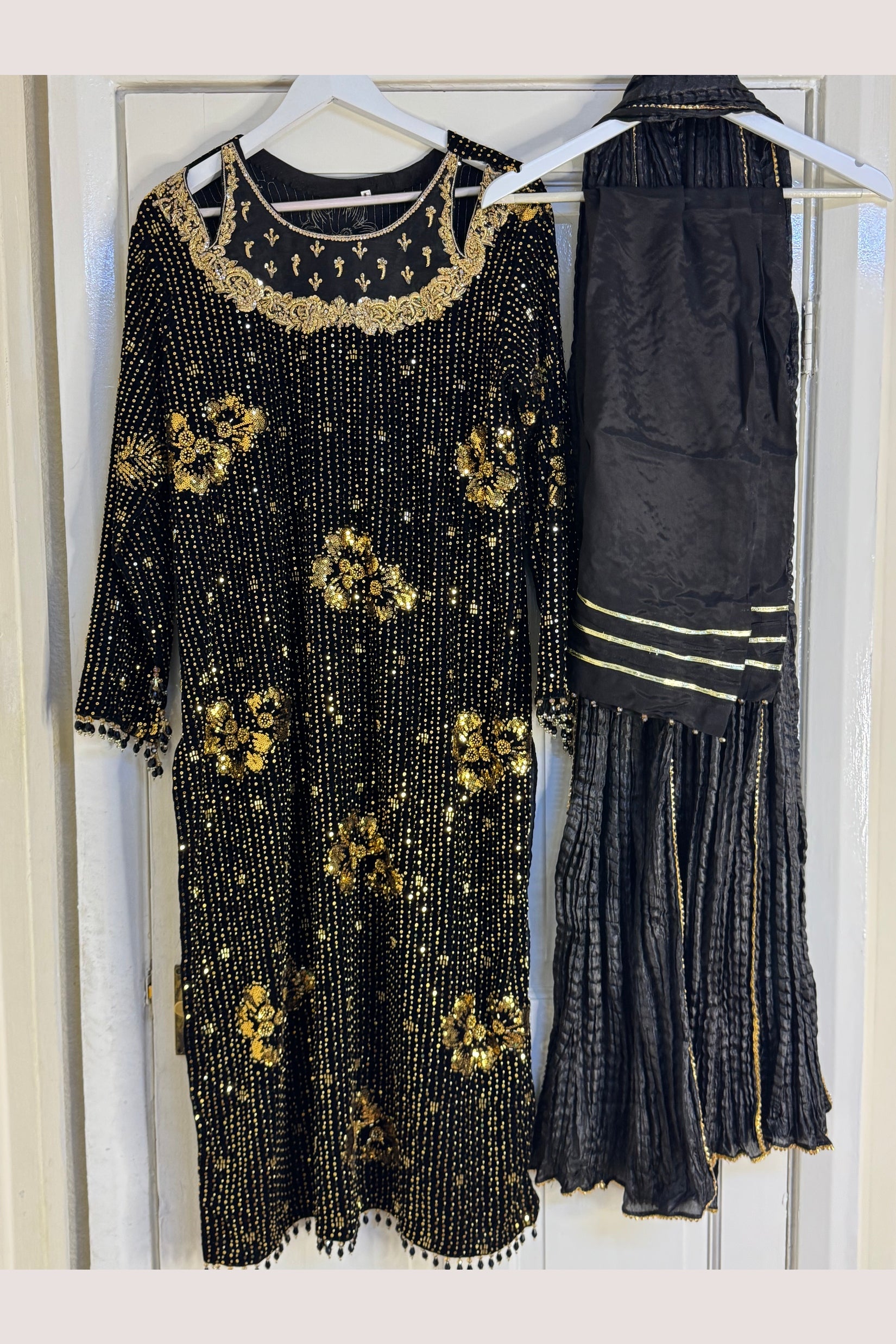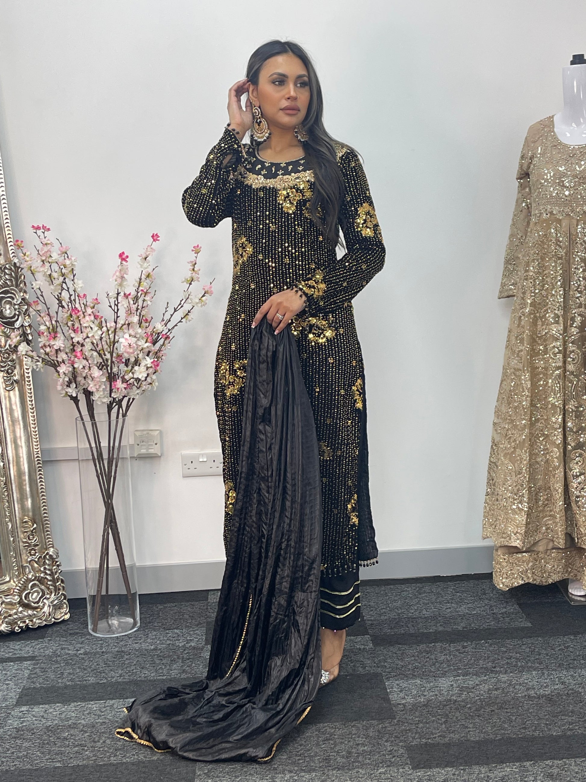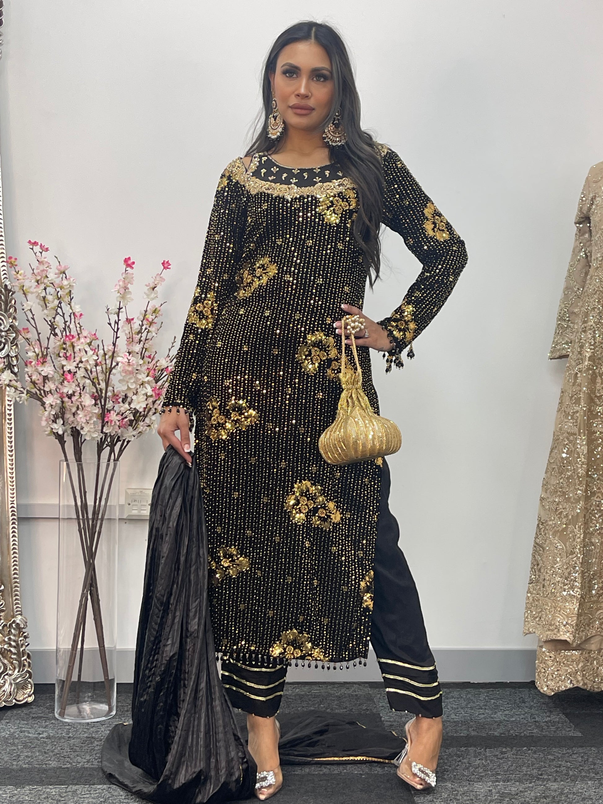 Elevate your style with this stunning Velvet Cutdana ensemble, expertly crafted to make a lasting impression. The intricately embroidered front and back of this beautiful attire are adorned with crystal details, adding a touch of opulence and sophistication.