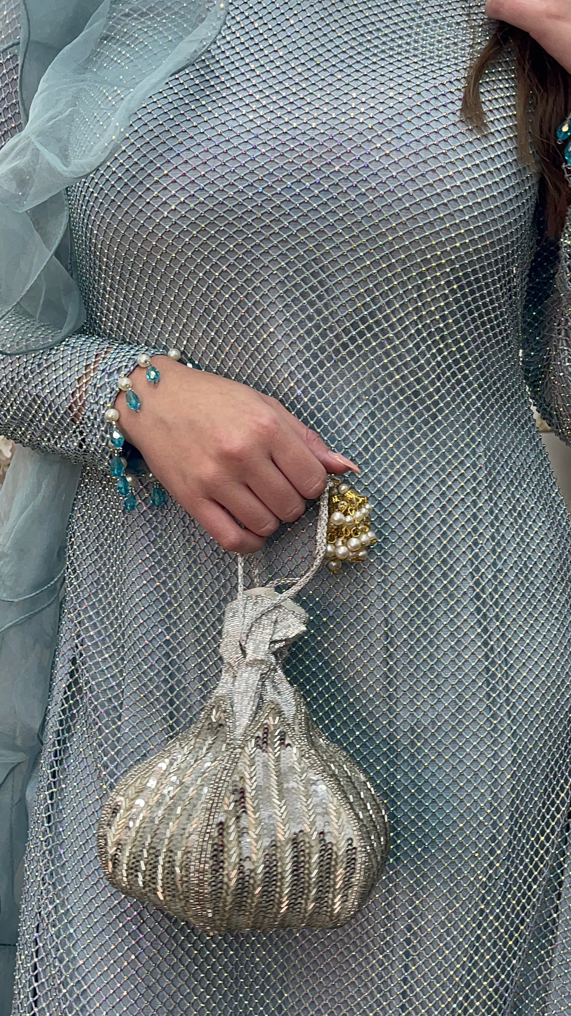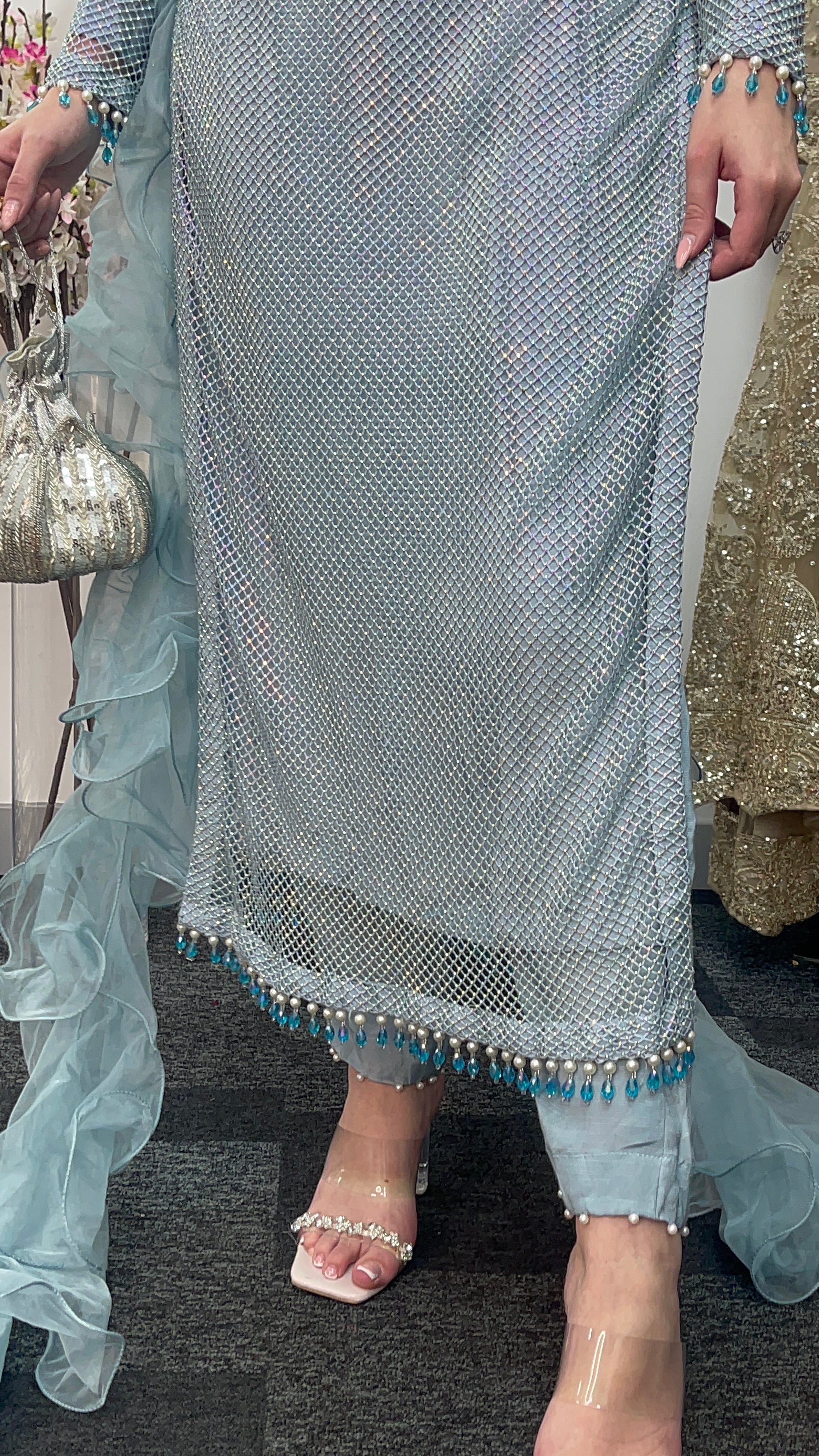 • Pearl Detailing: The front and back daman (hemline) are adorned with high-quality pearl detailing, adding a touch of classic sophistication. The sleeves are also richly embellished with pearl accents for a cohesive and luxurious look.