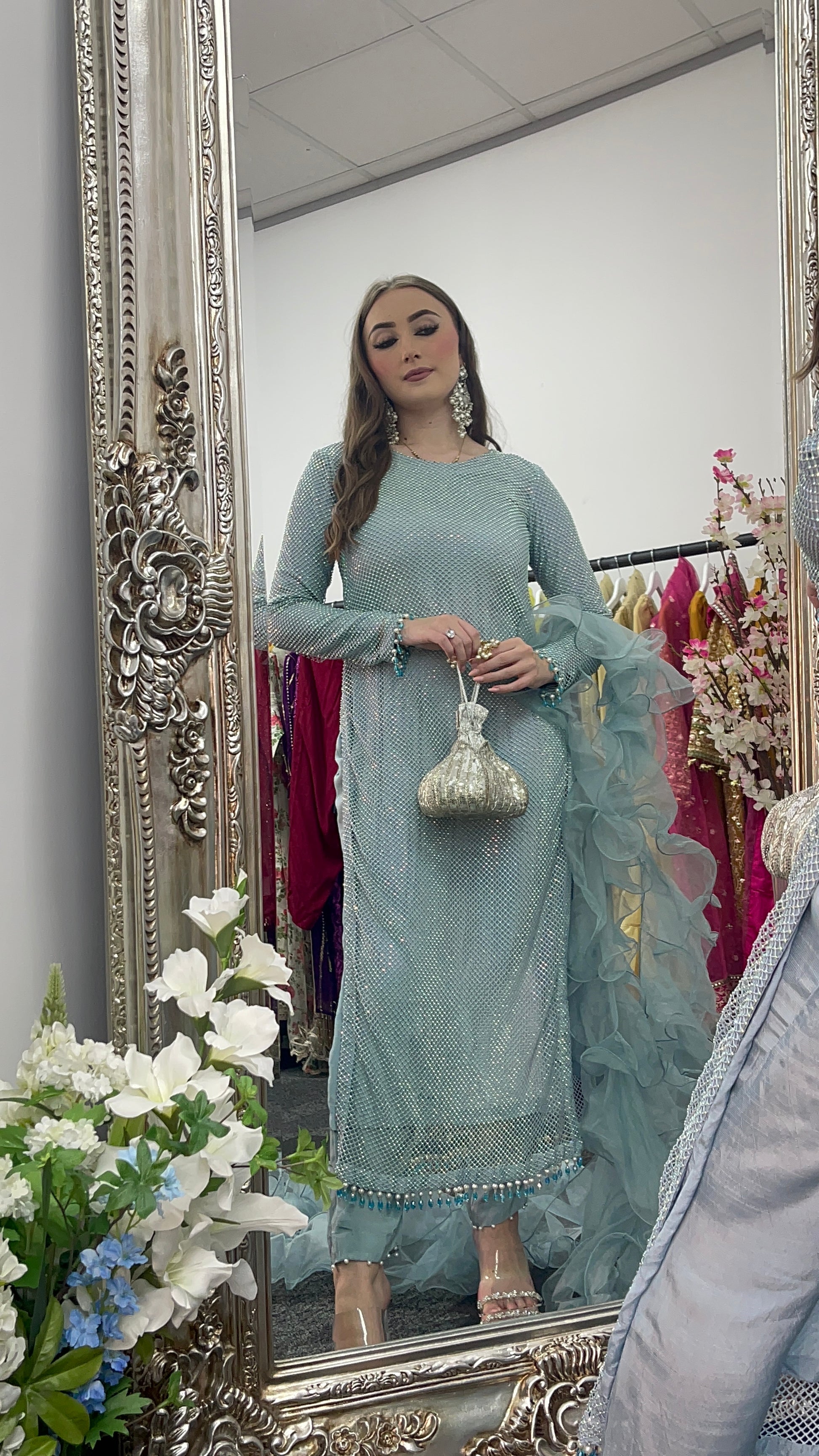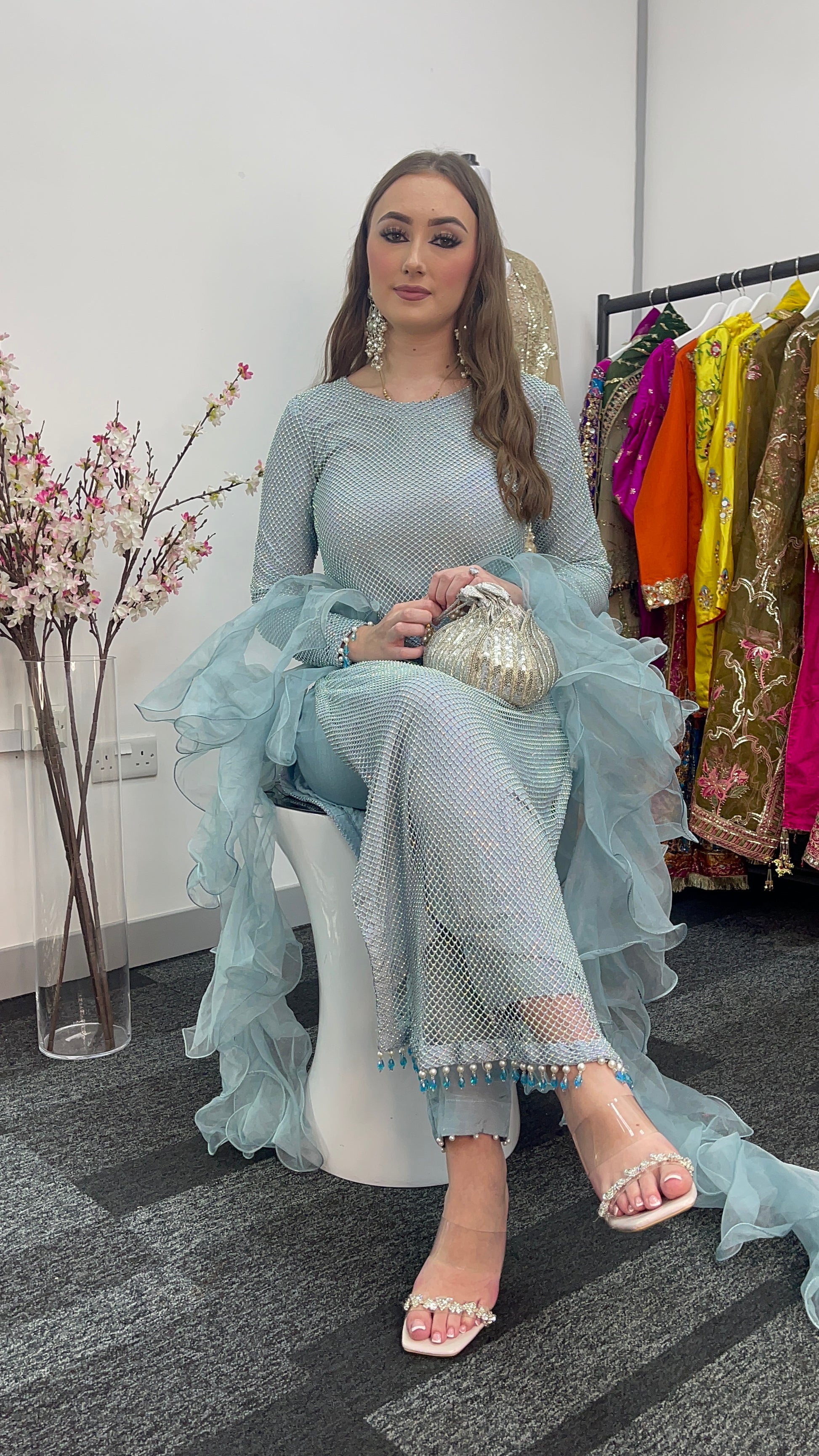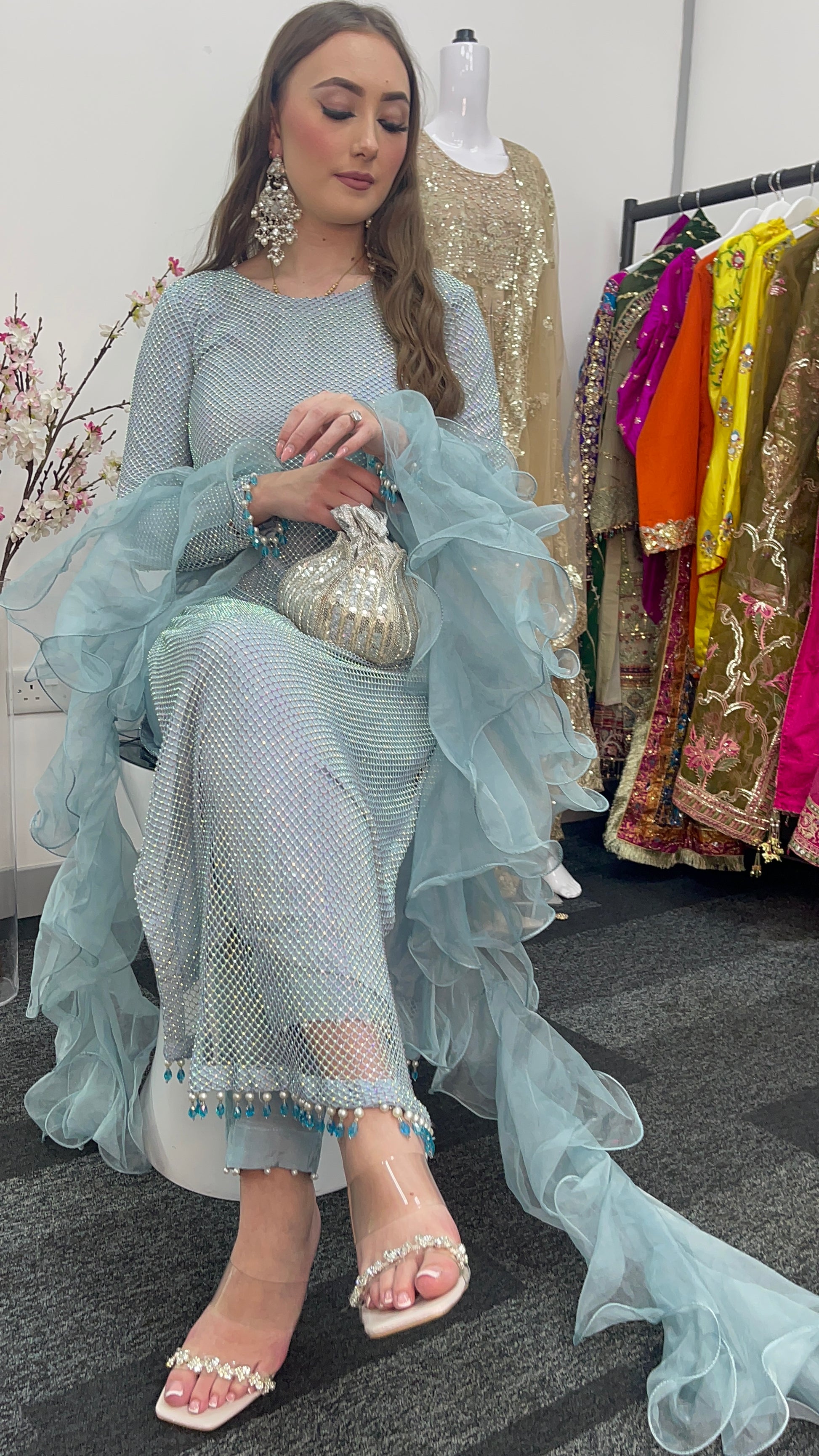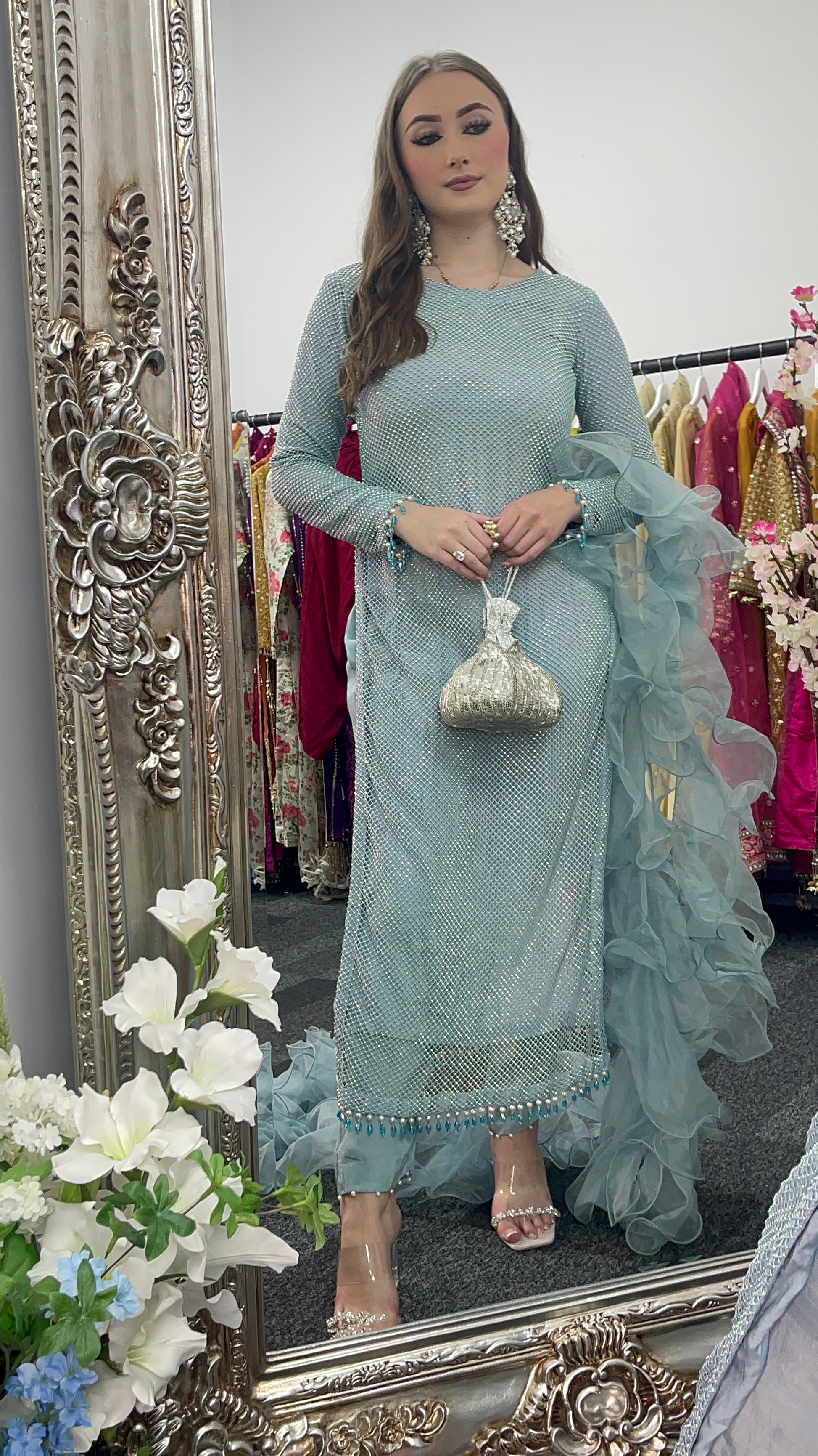 • Romantic Ruffled Dupatta: A flowing, ruffled dupatta (scarf) completes the look, adding a touch of ethereal beauty.