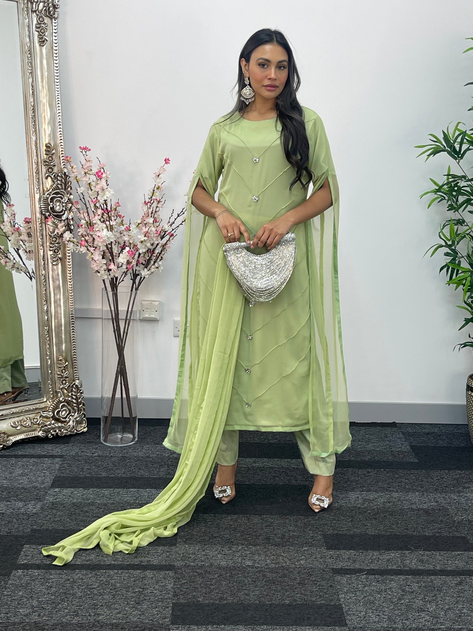 Green - Floor Length Sleeves - Chiffon Outfit - T
