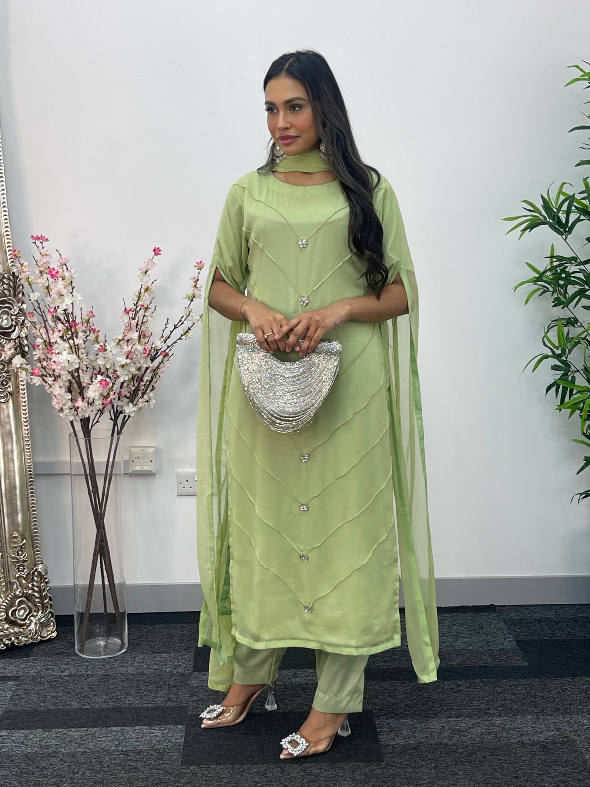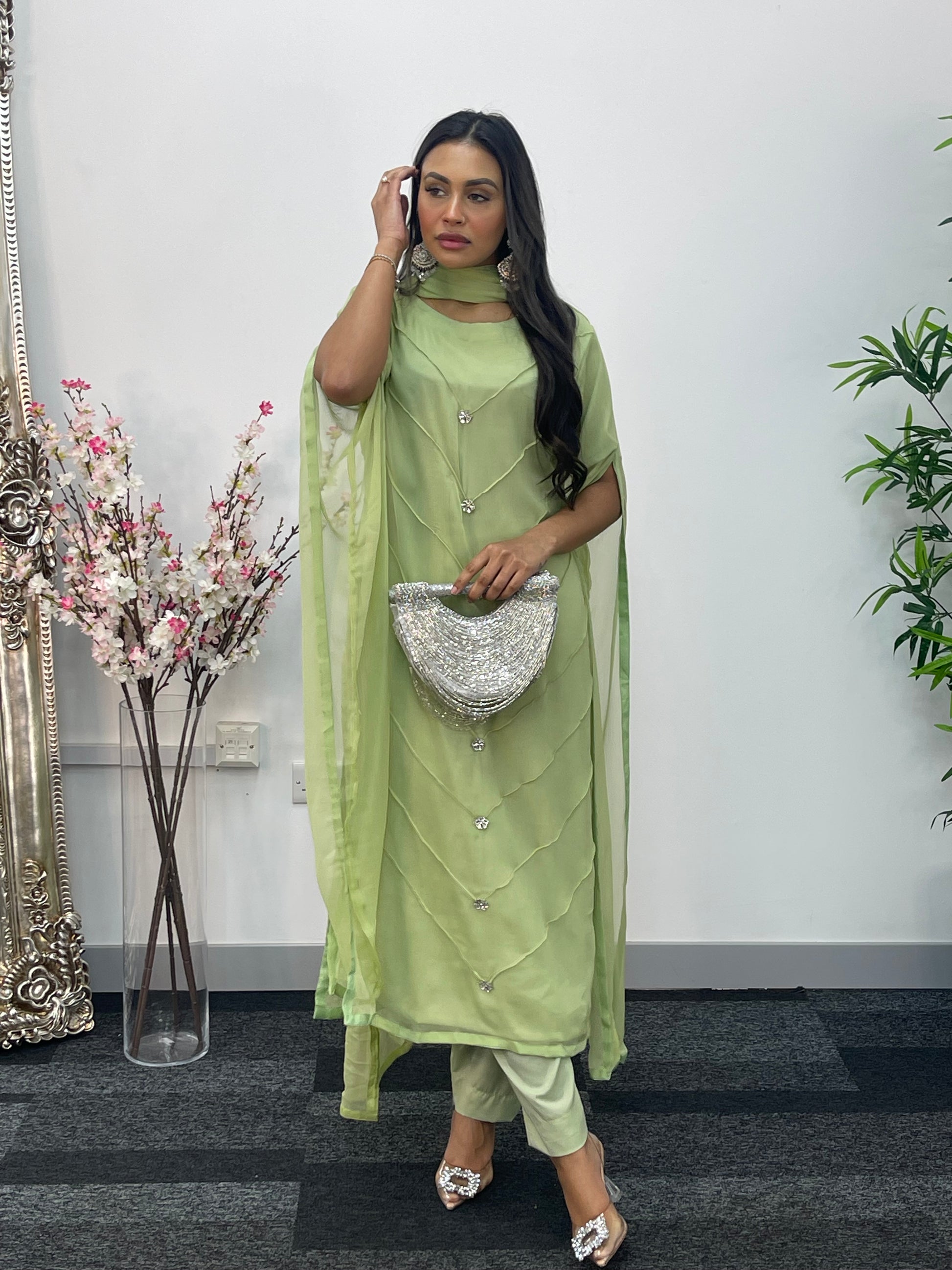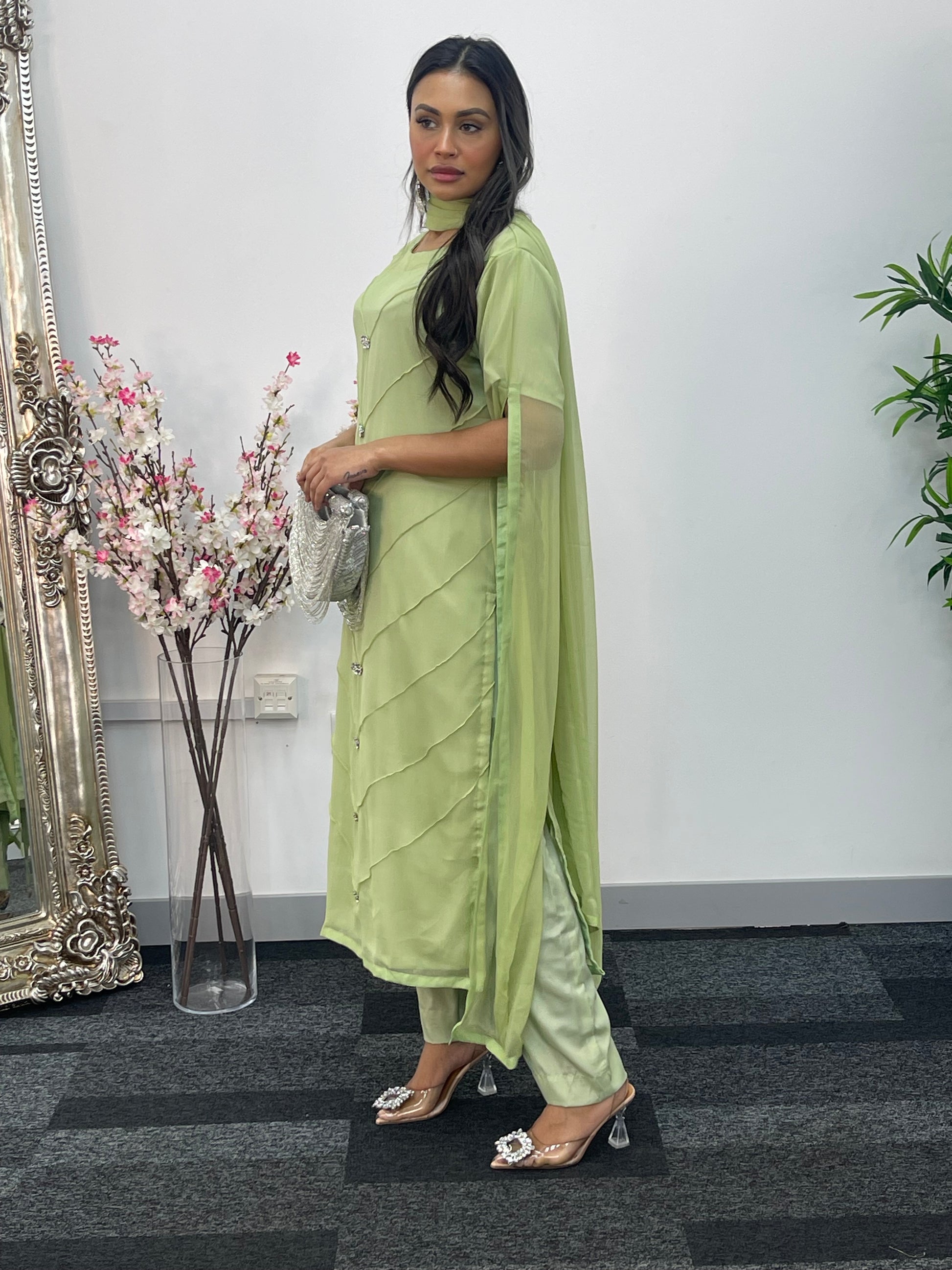 We are excited to present our latest Eid collection, featuring five exquisite colors. This elegant ensemble is crafted from lightweight chiffon, providing a simple yet stylish silhouette. The outfit includes straight trousers and a coordinating chiffon dupatta, enhanced by tasteful pin tuck detailing and decorative buttons at the front.