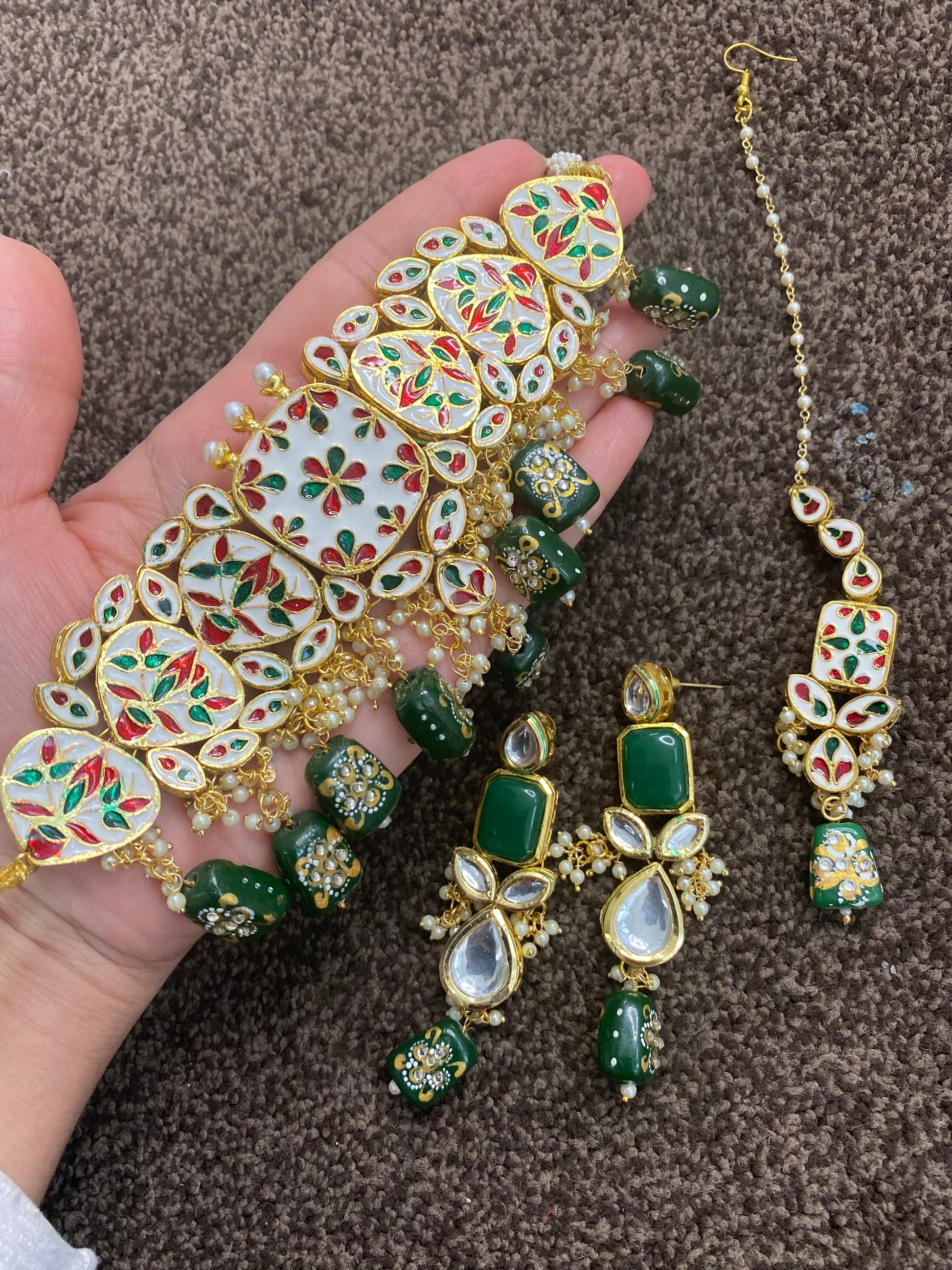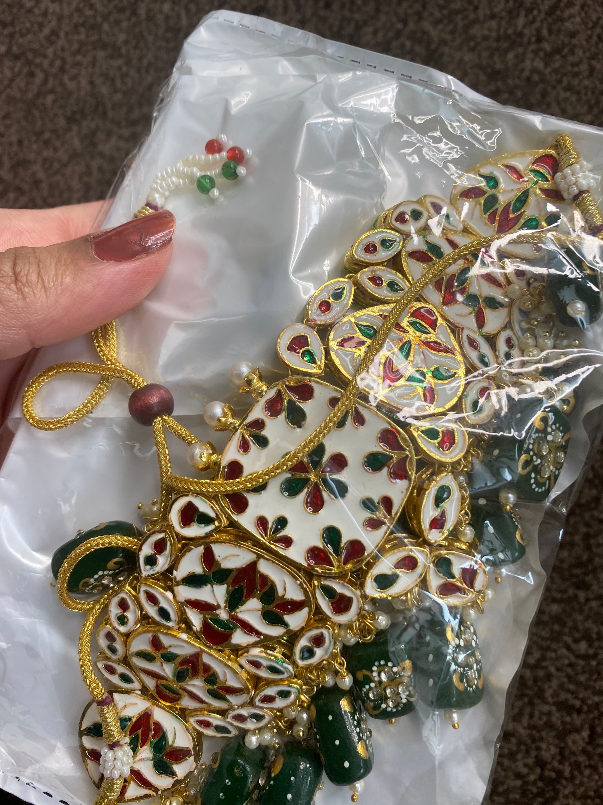 Beautiful necklace with jhumka and bindi.