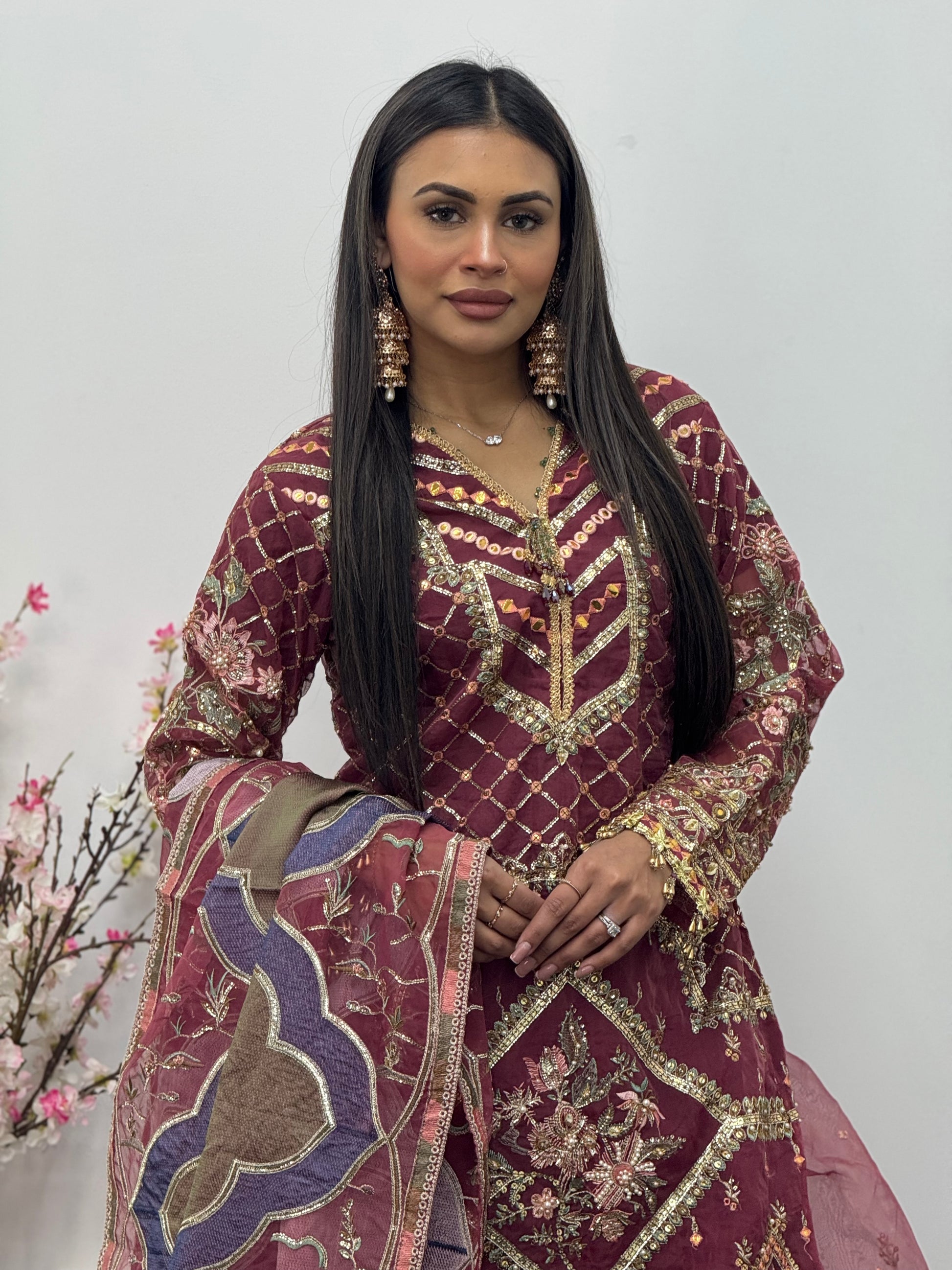 • Heavily Embroidered Organza Sharara: Crafted from premium organza, the sharara is heavily embroidered, providing a luxurious flow and unmatched elegance.