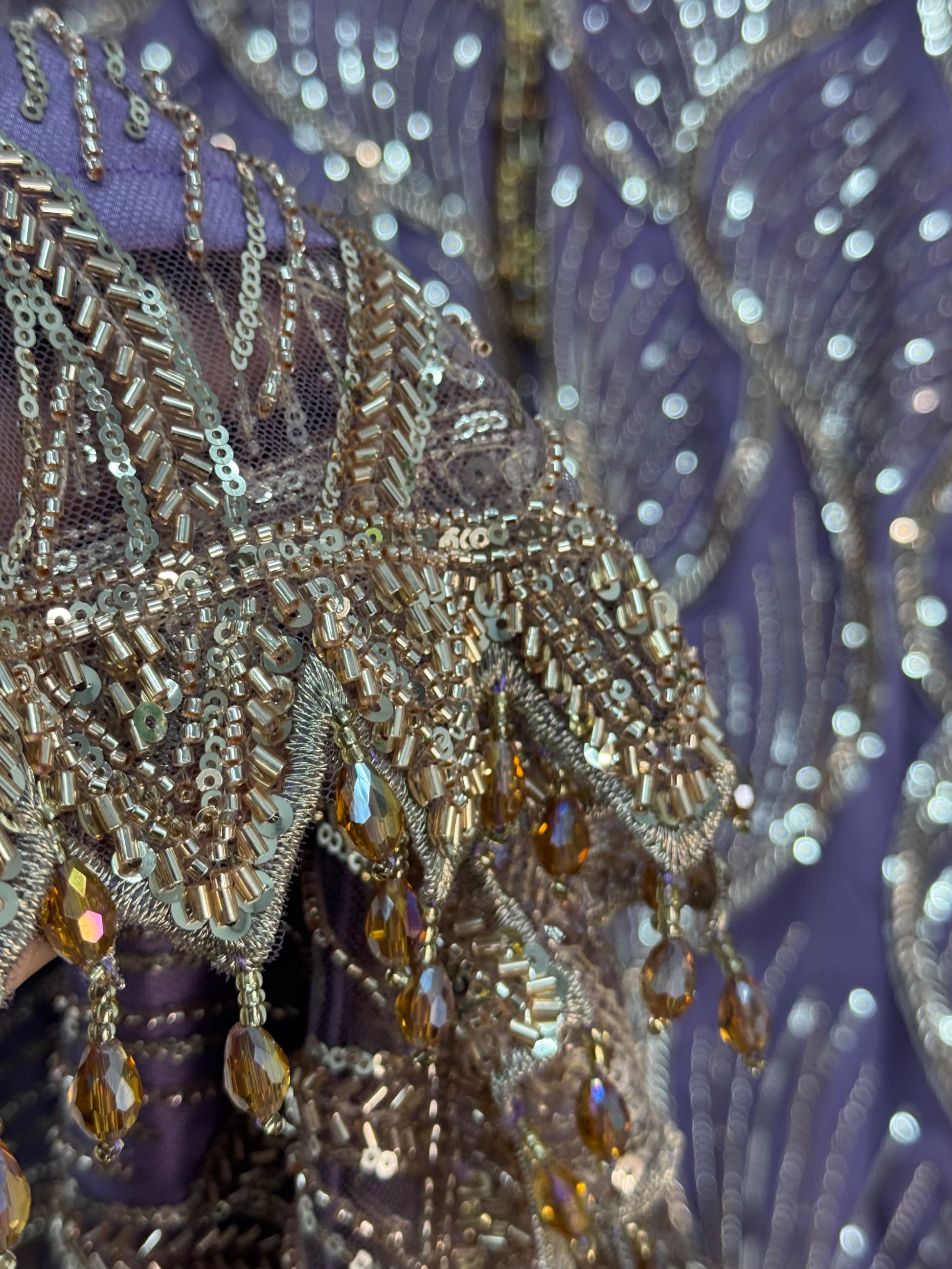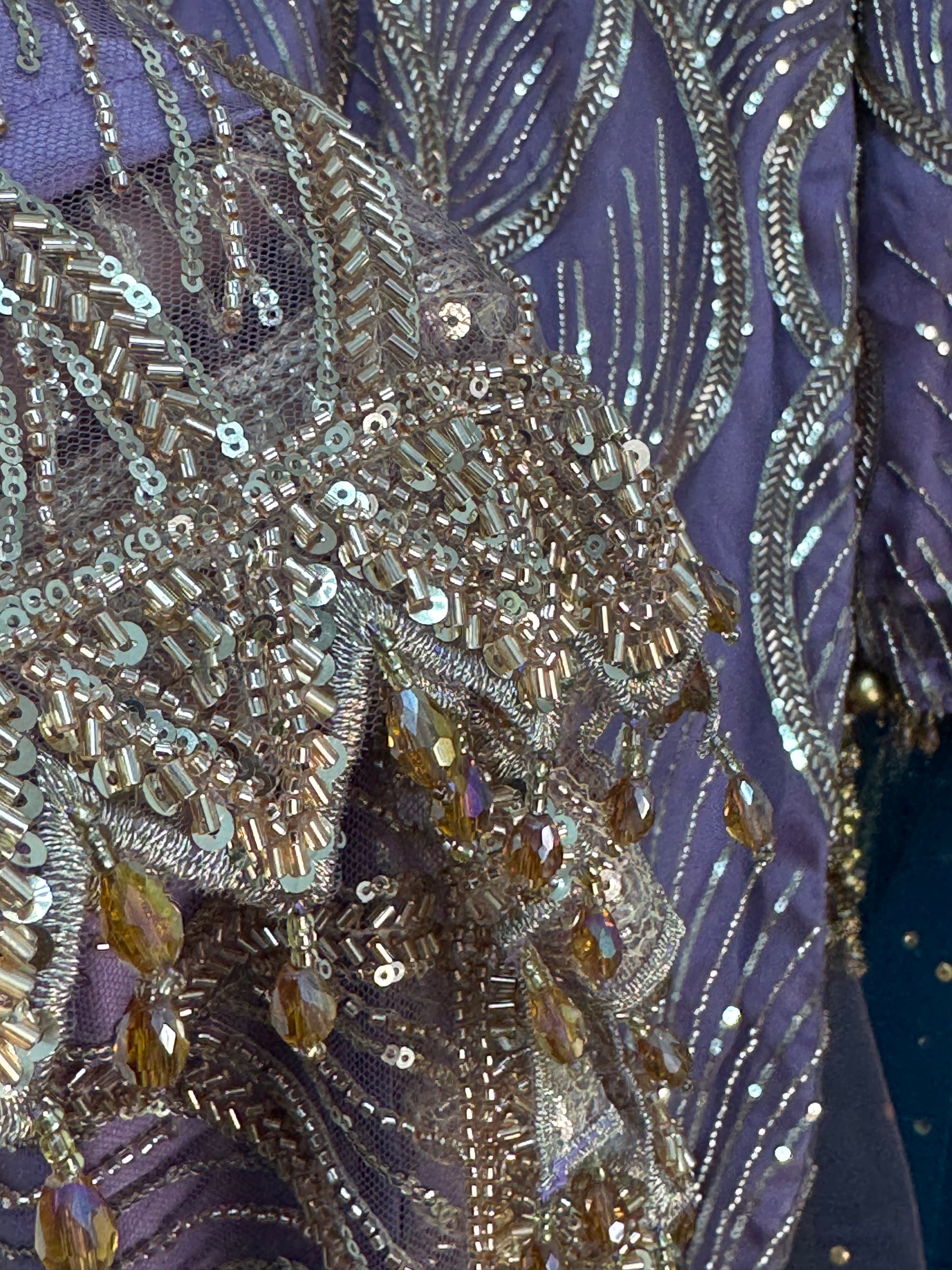 This elegant piece features sleeves with crystal detailing and charming latkans.