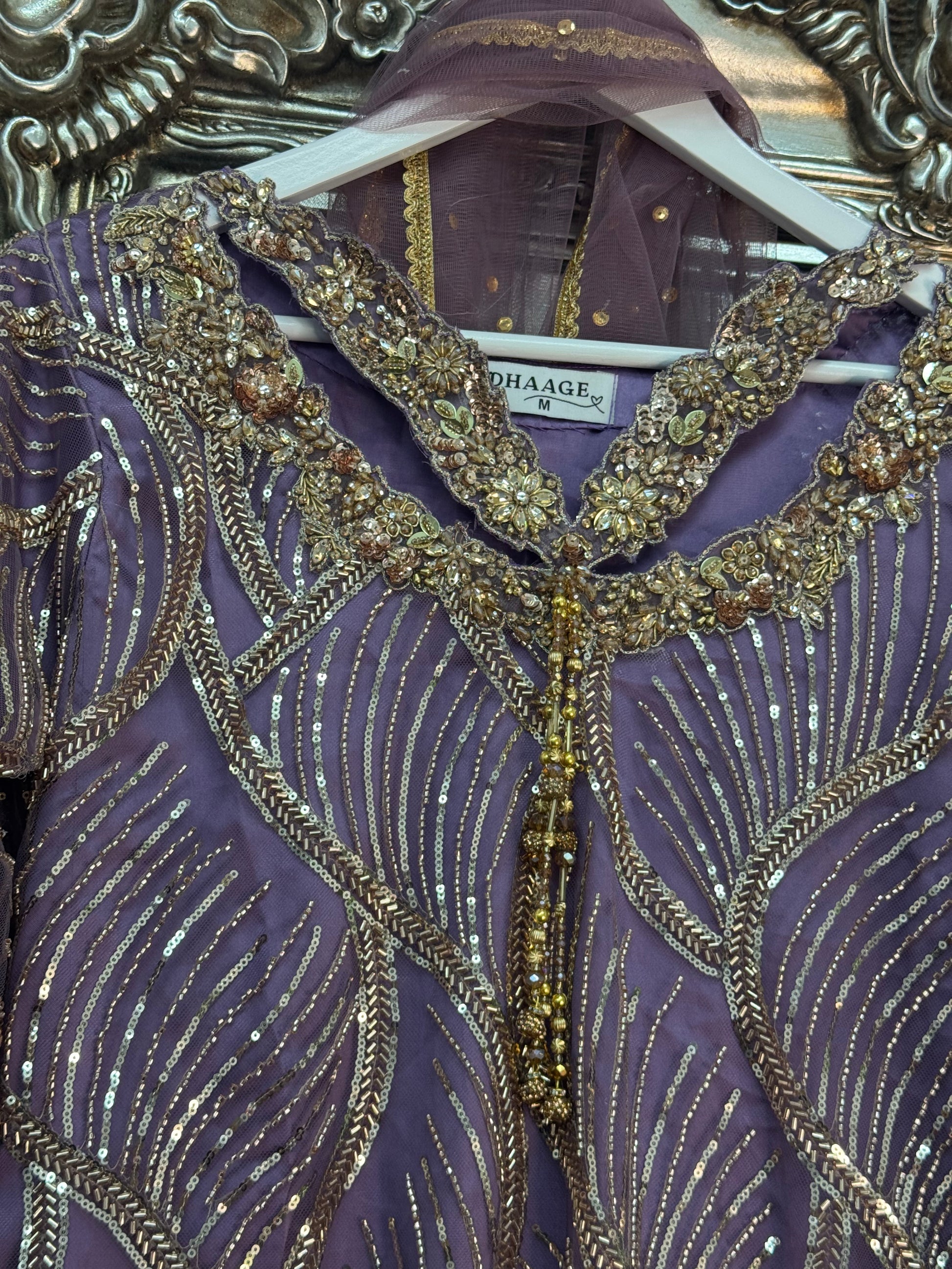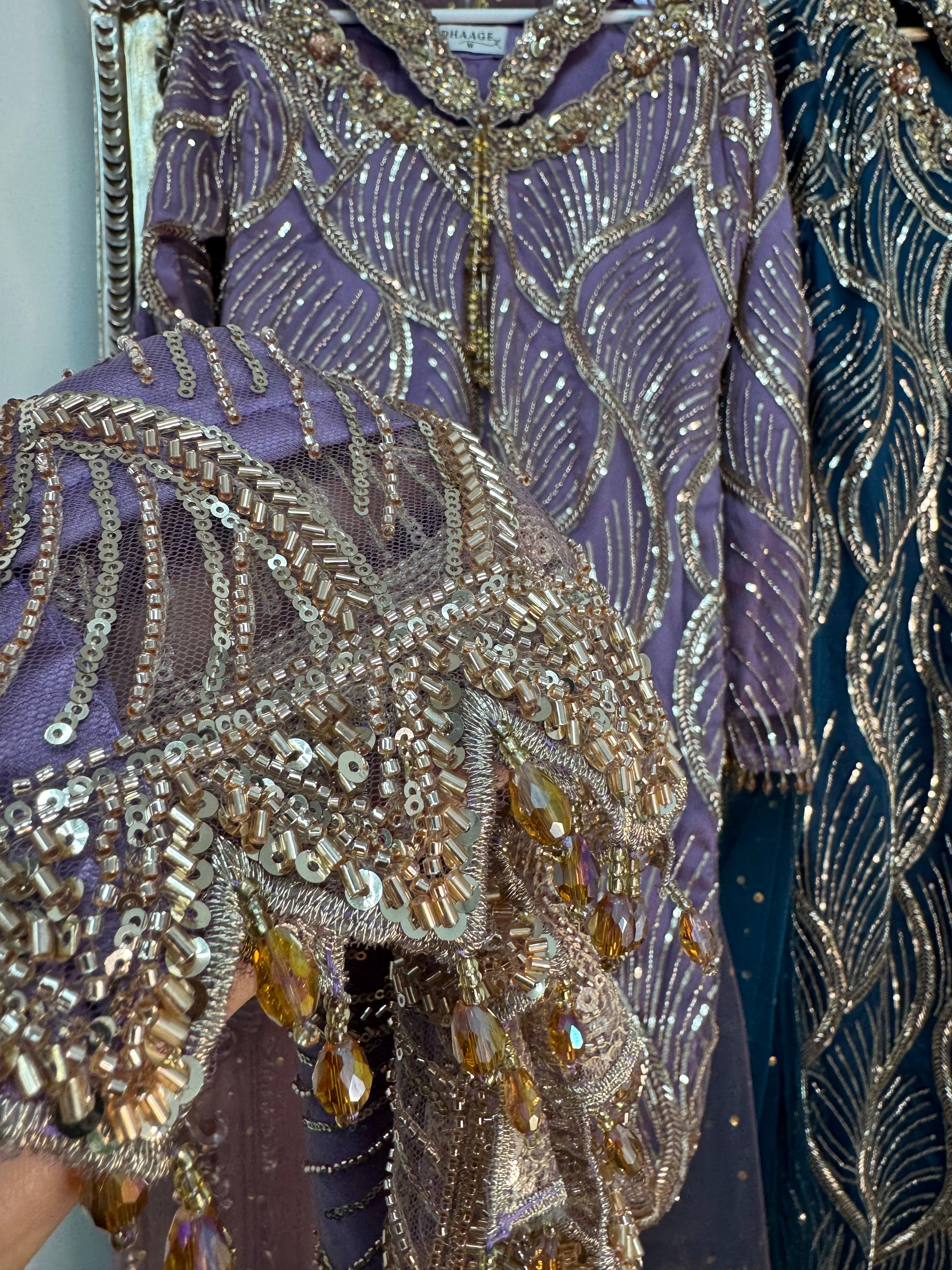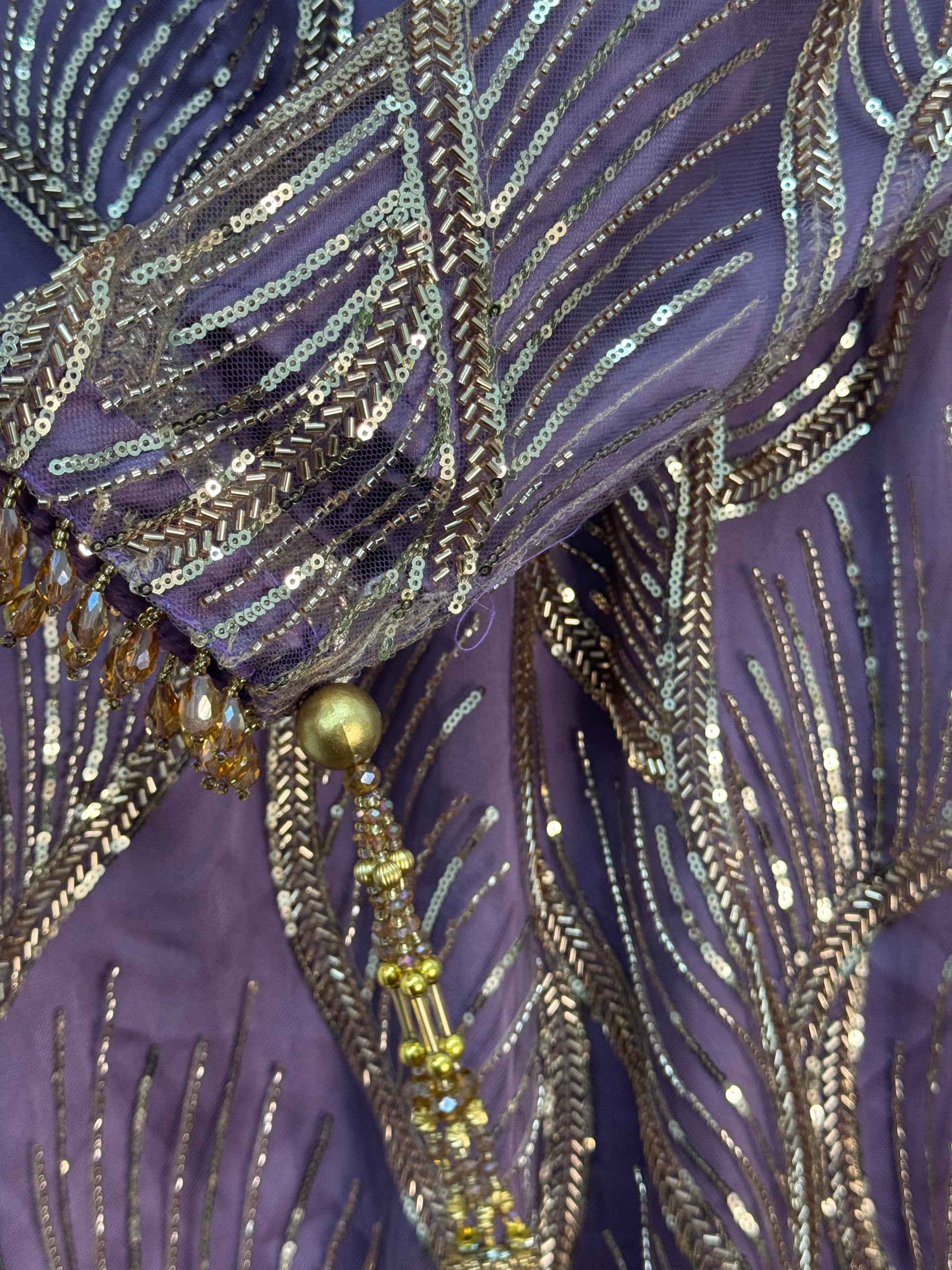 To enhance its allure, the garment showcases hanging tassels on both the front and back daman, creating a graceful silhouette.