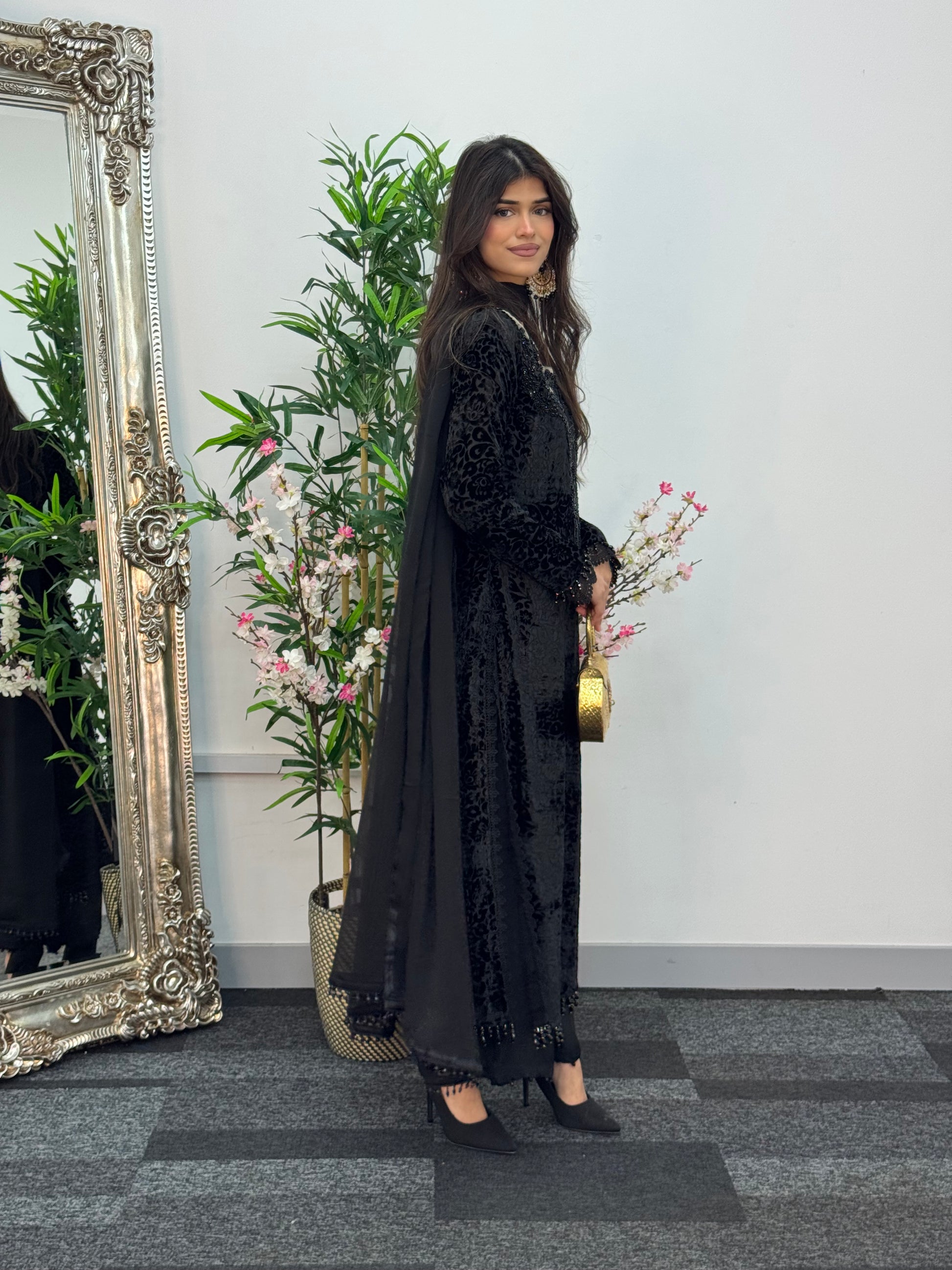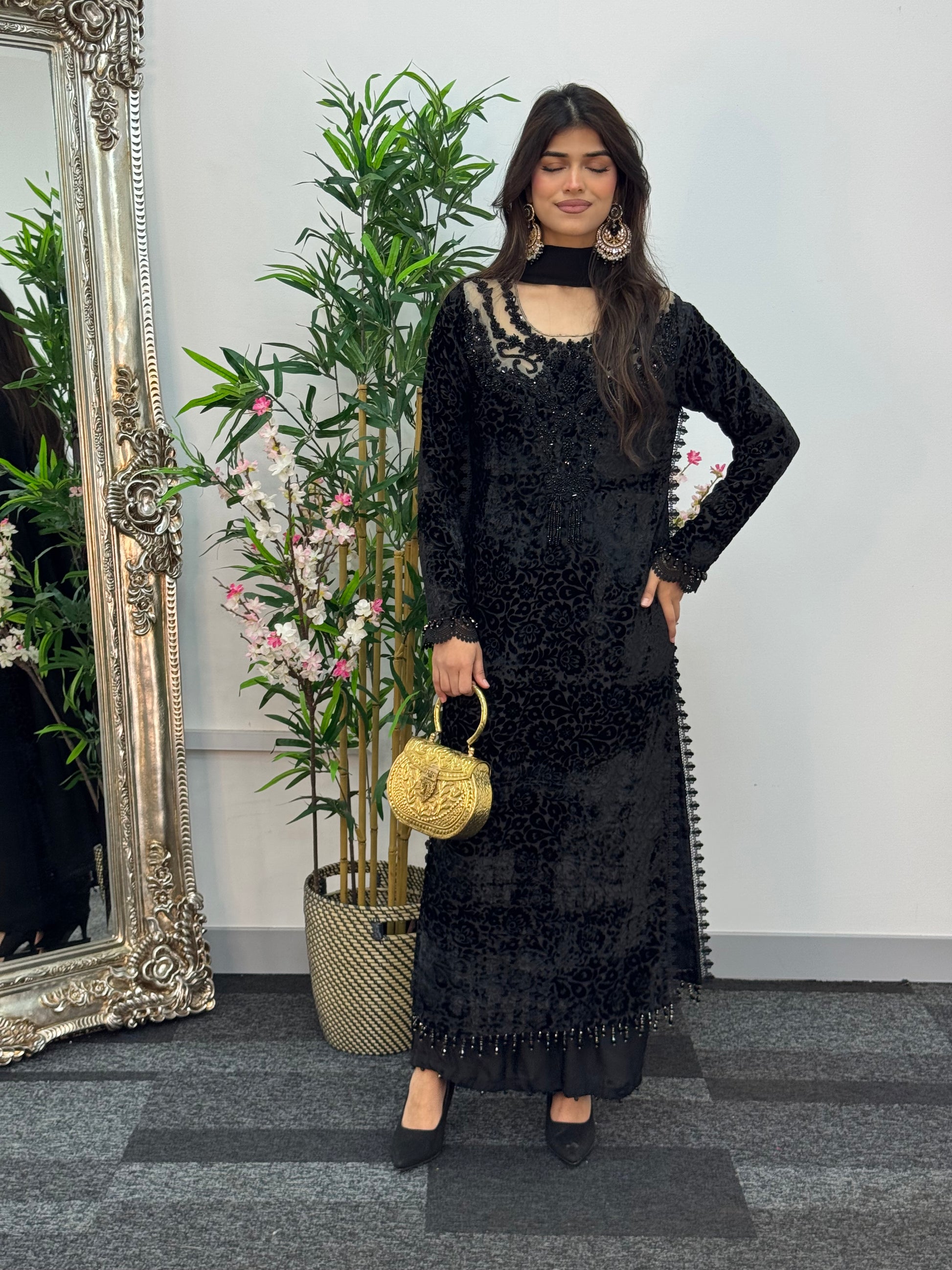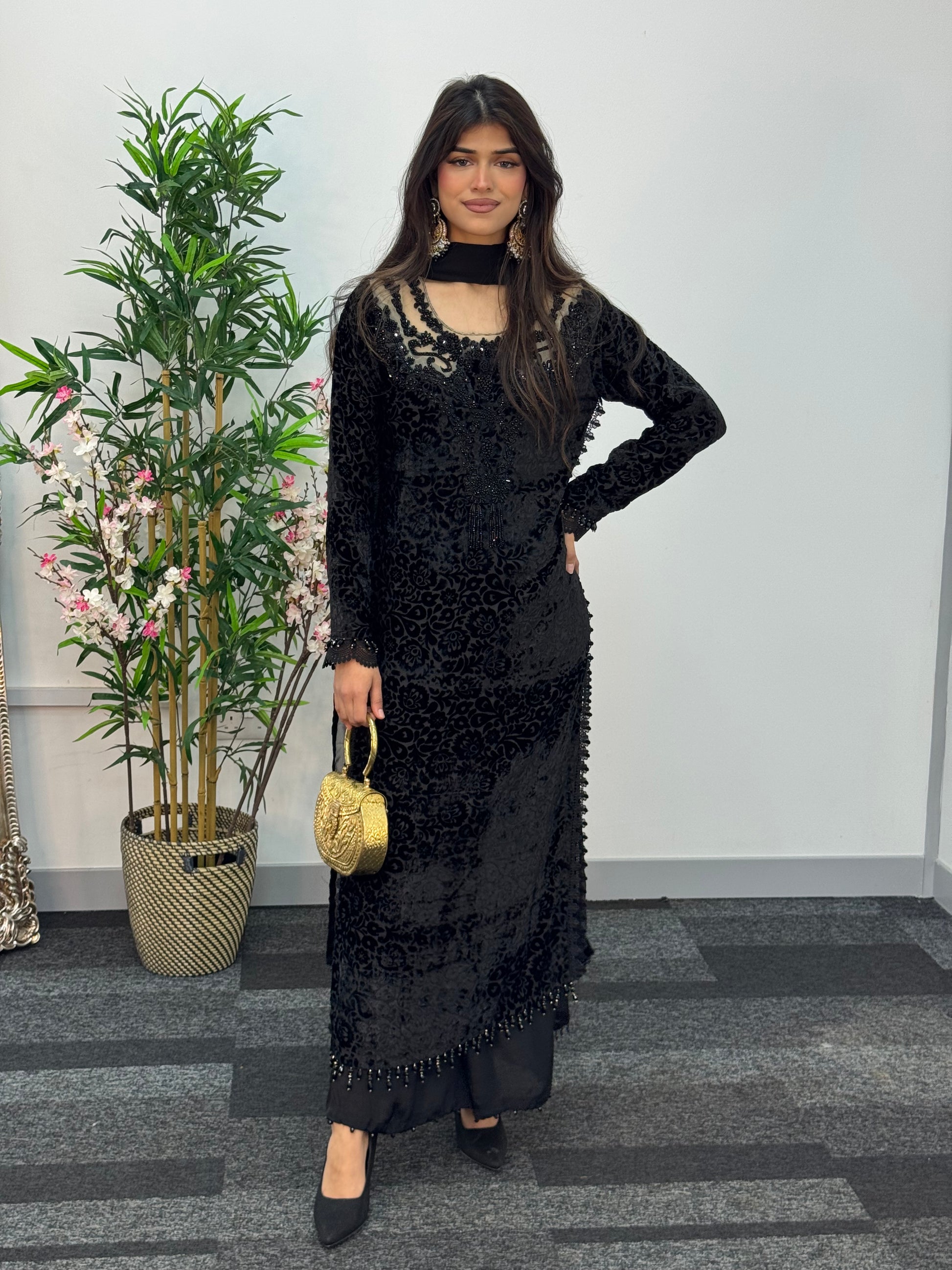 This stunning ensemble is crafted from premium plachi velvet and features exquisite high-quality adda work.