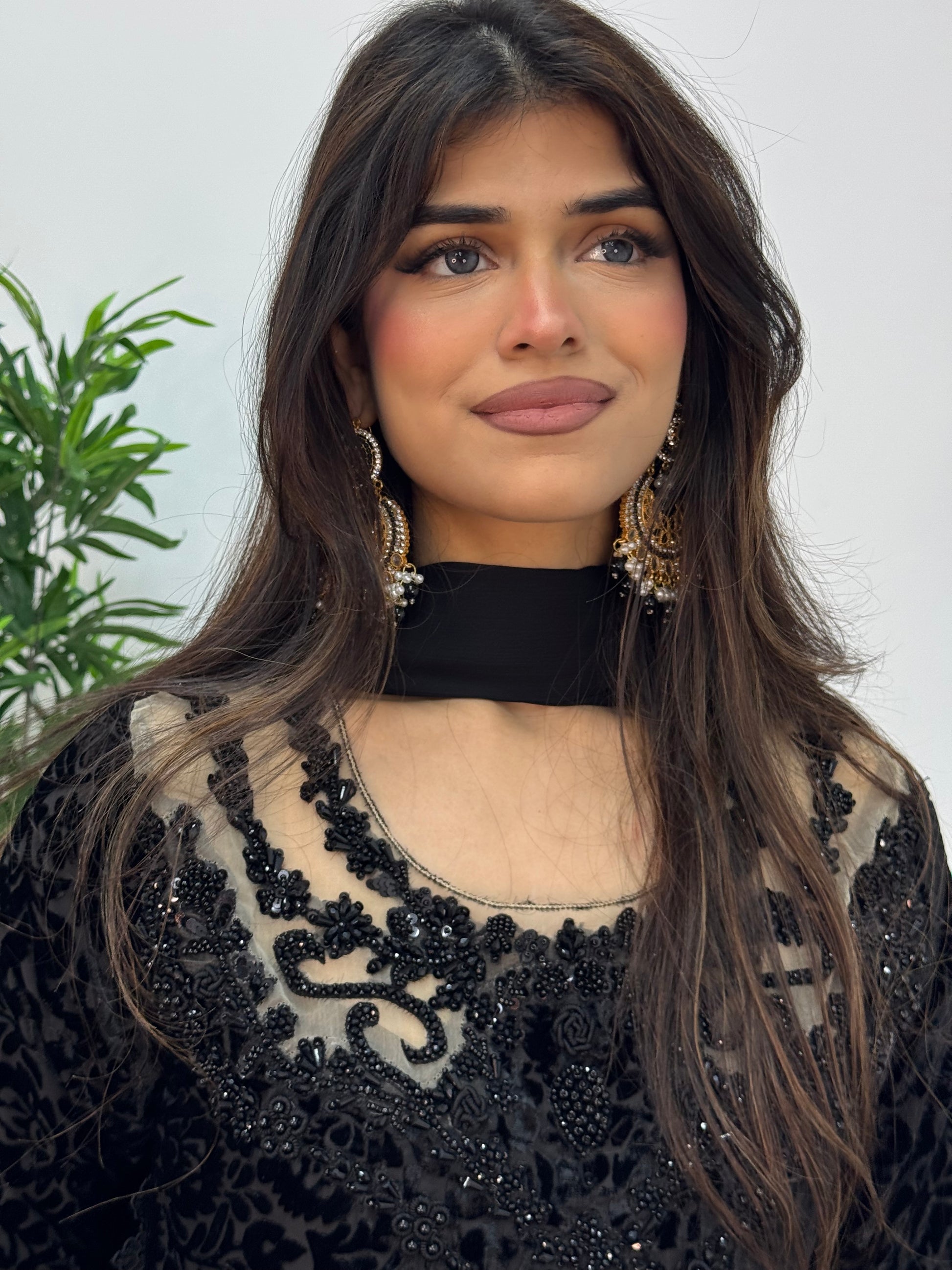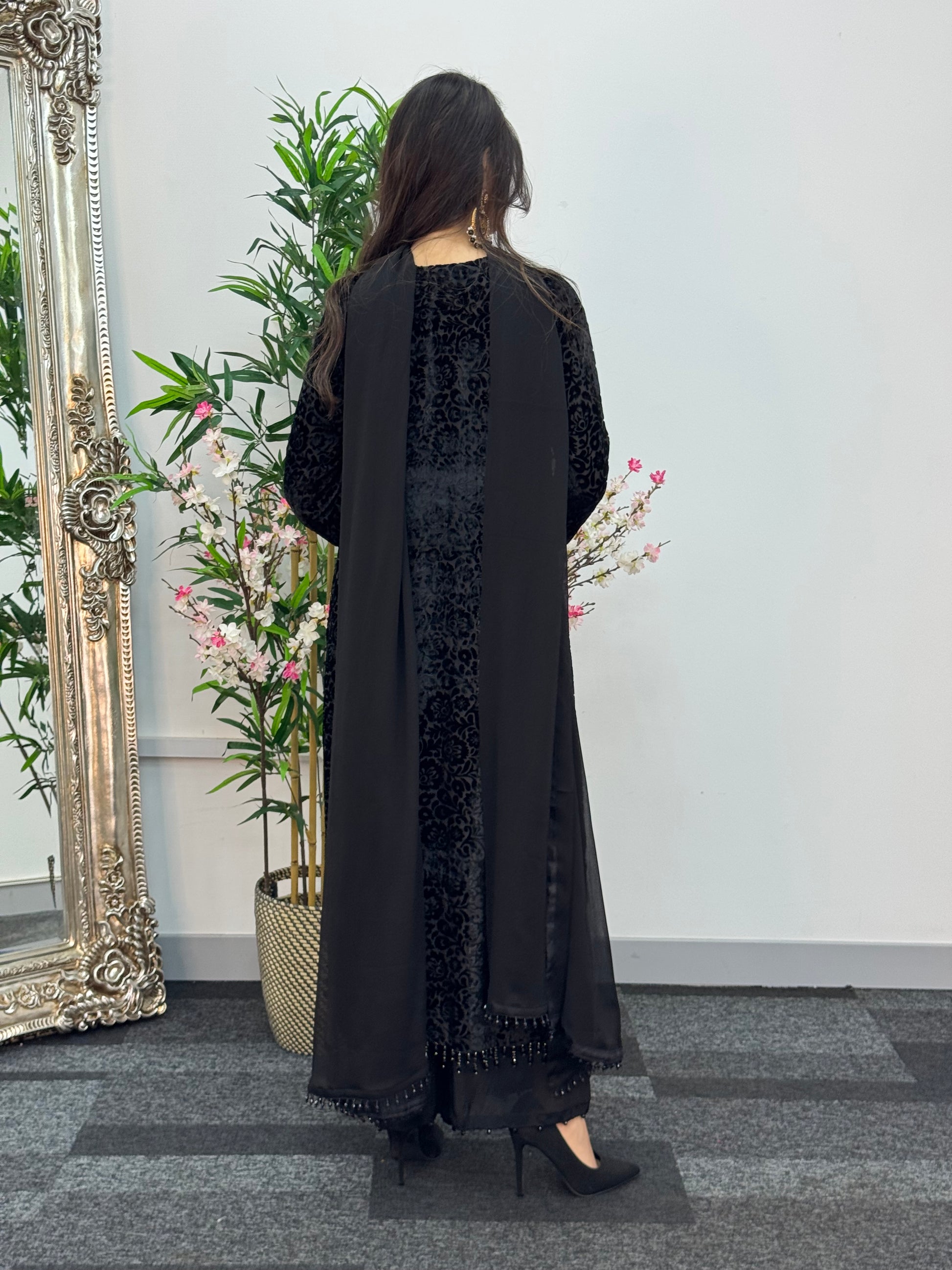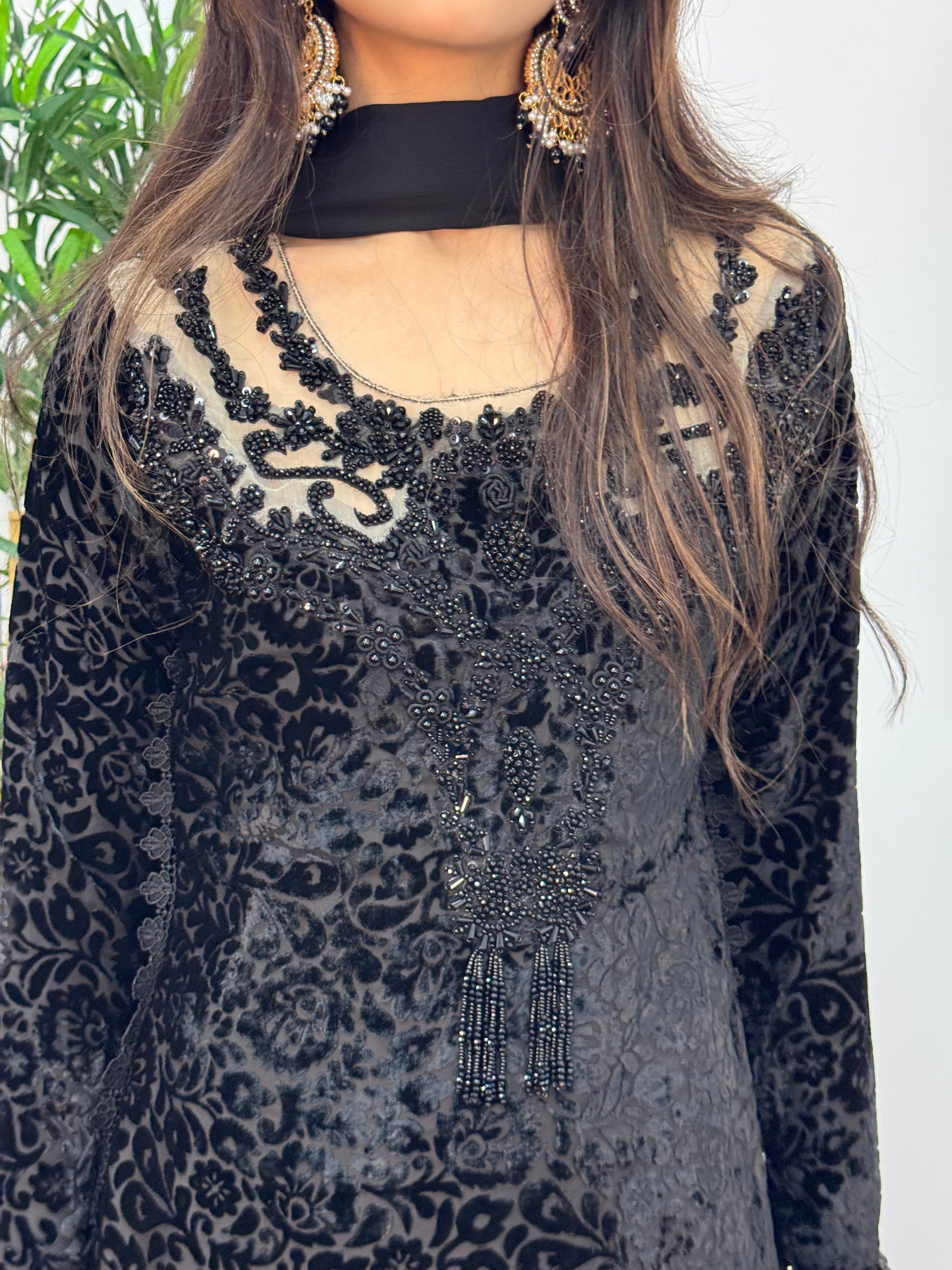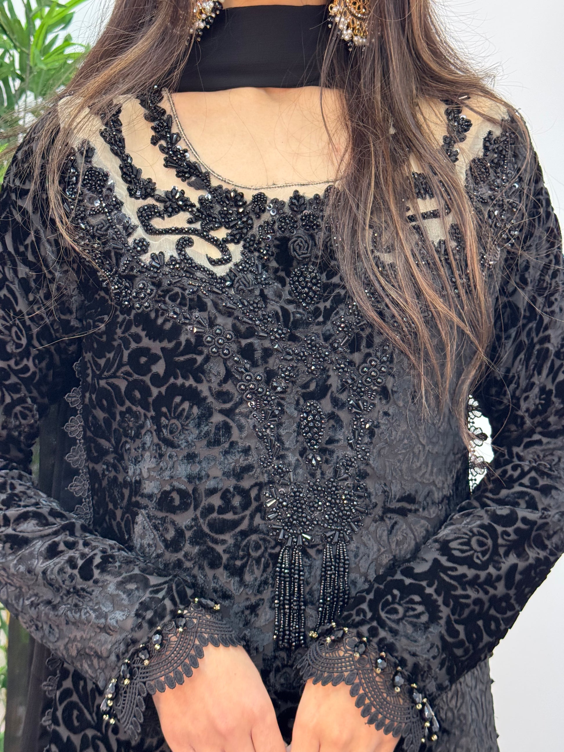 This stunning ensemble is crafted from premium plachi velvet and features exquisite high-quality adda work.