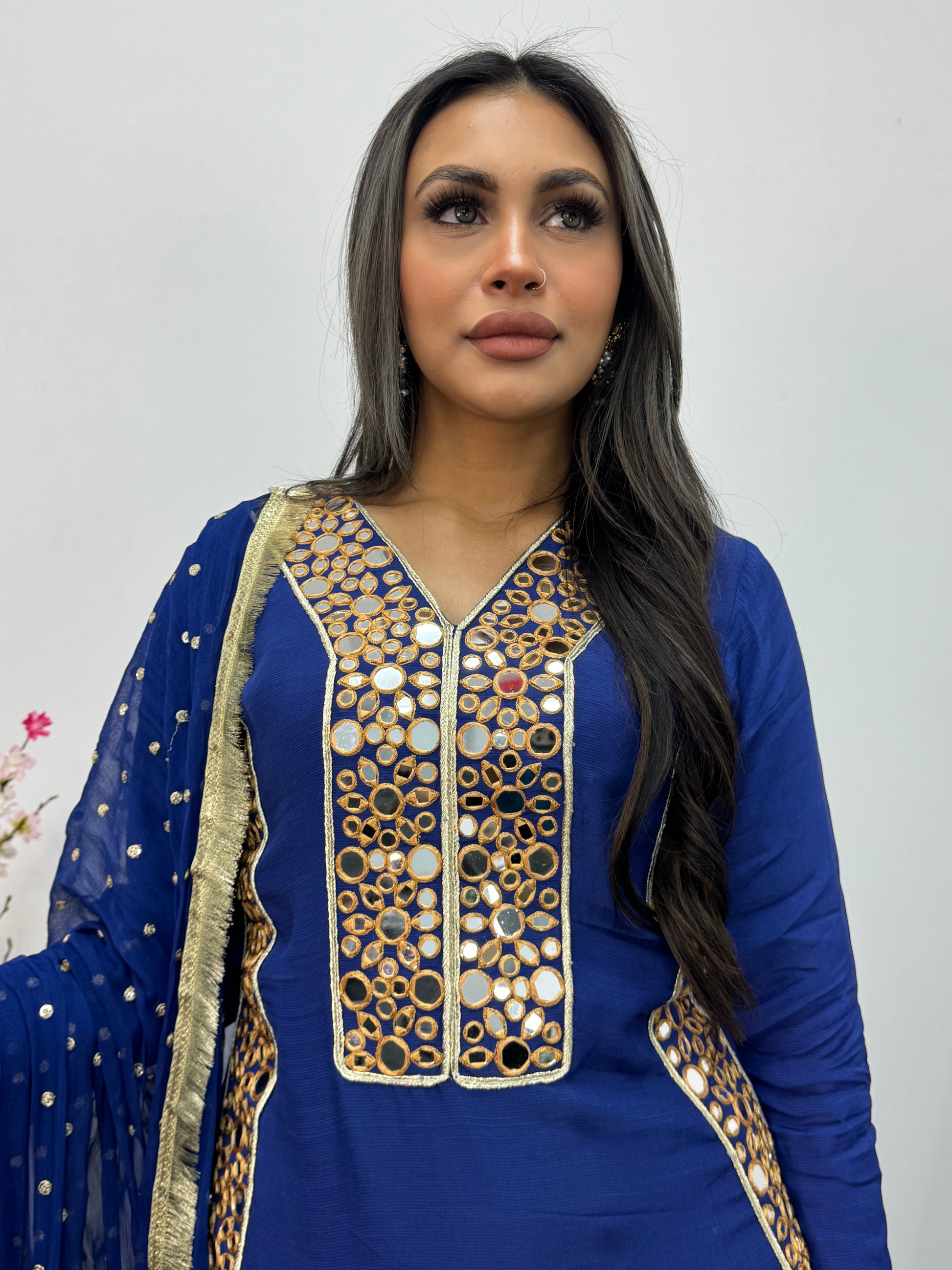 This stunning outfit is perfect for any occasion, radiating elegance and sparkle with its shimmering mirror embellishments.