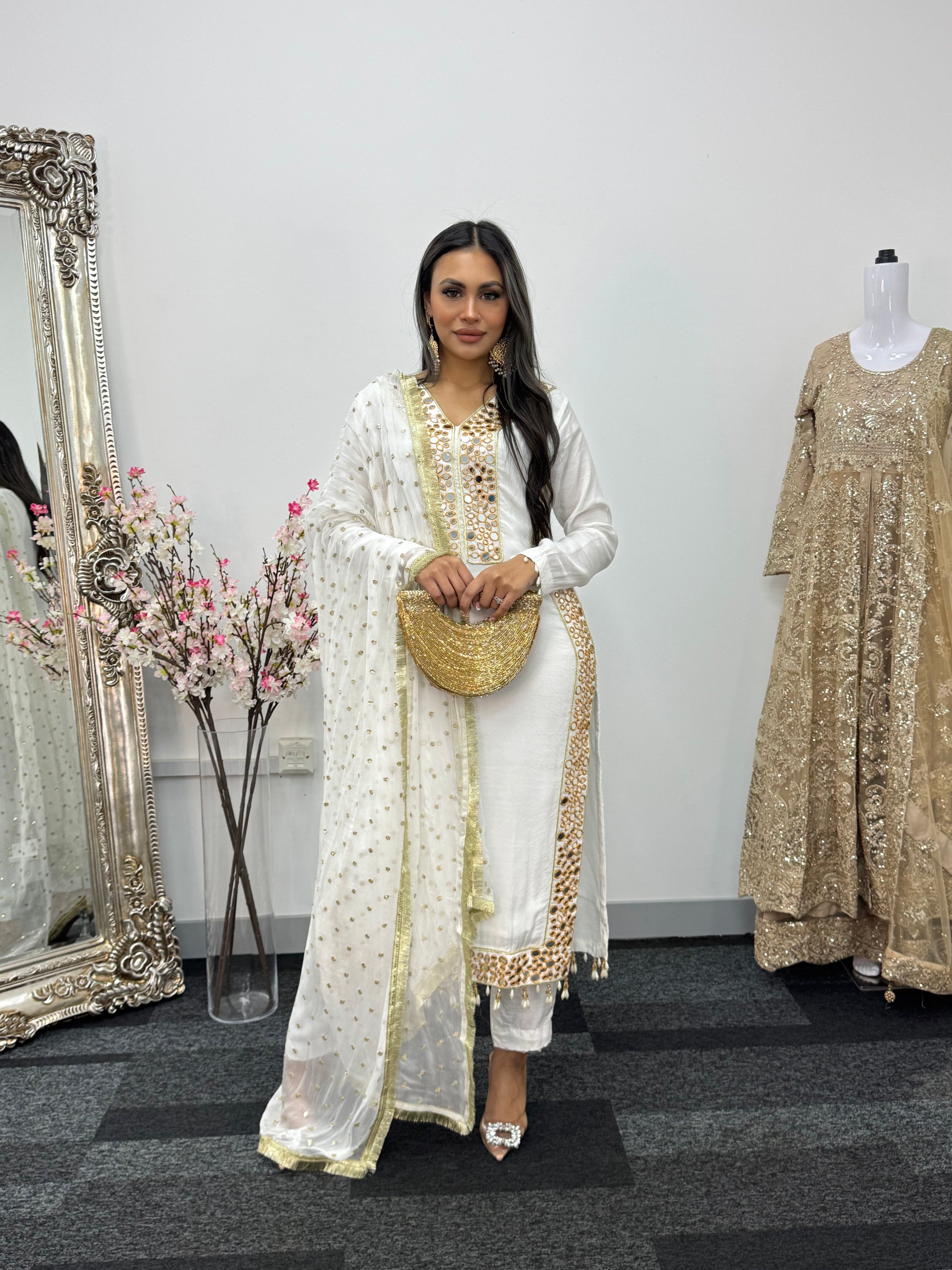 This stunning outfit is perfect for any occasion, radiating elegance and sparkle with its shimmering mirror embellishments.