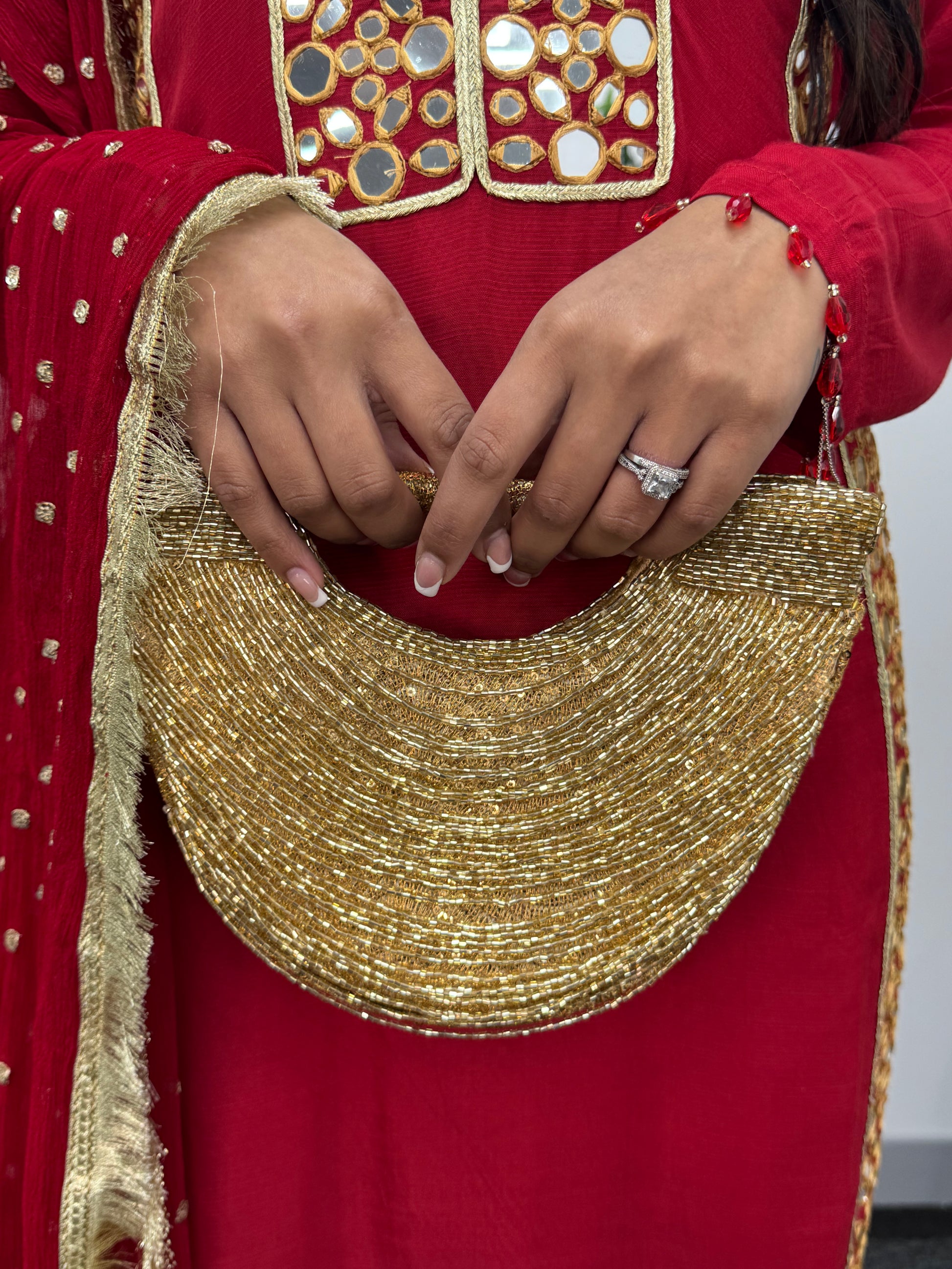 This stunning outfit is perfect for any occasion, radiating elegance and sparkle with its shimmering mirror embellishments.
