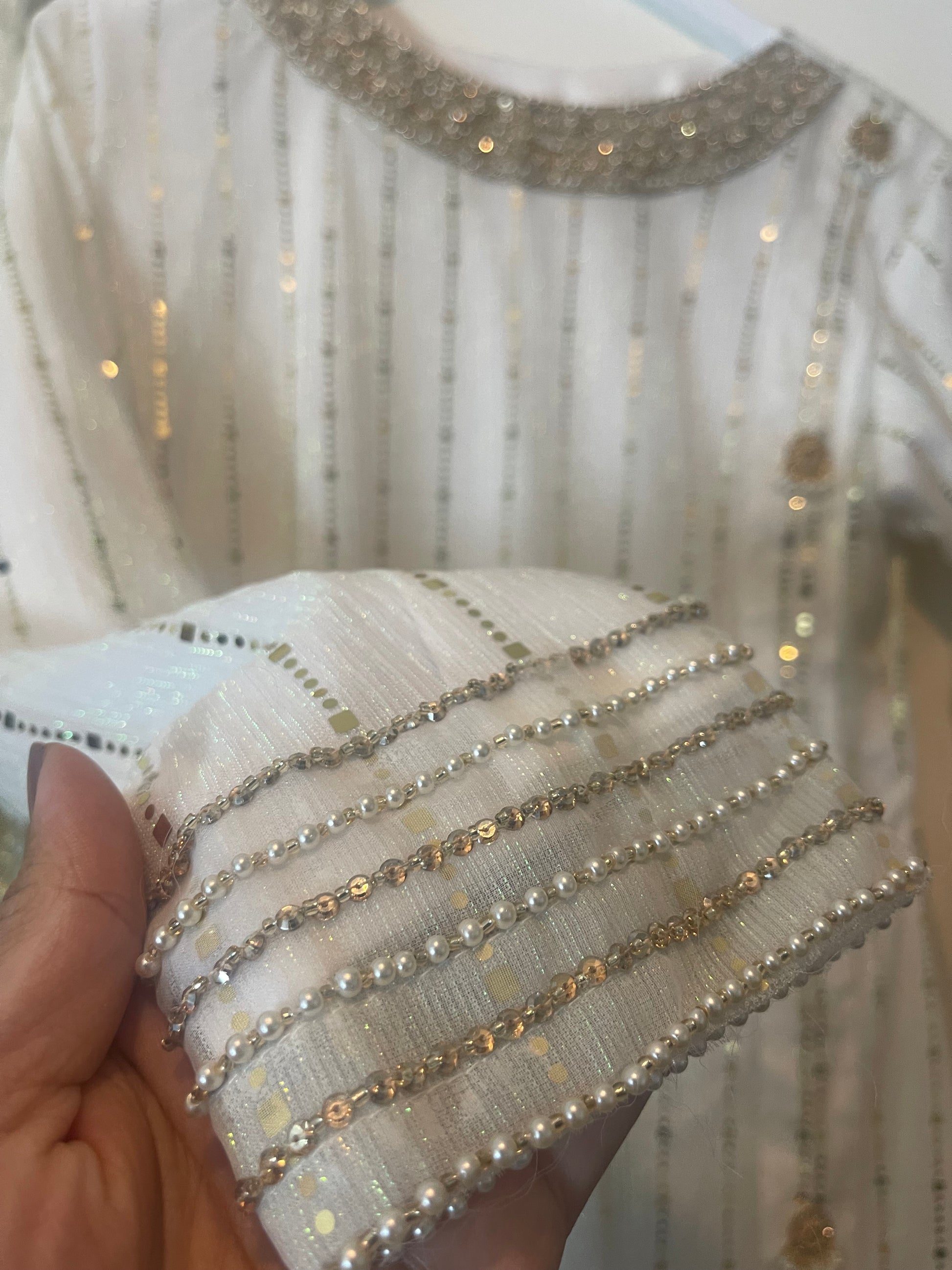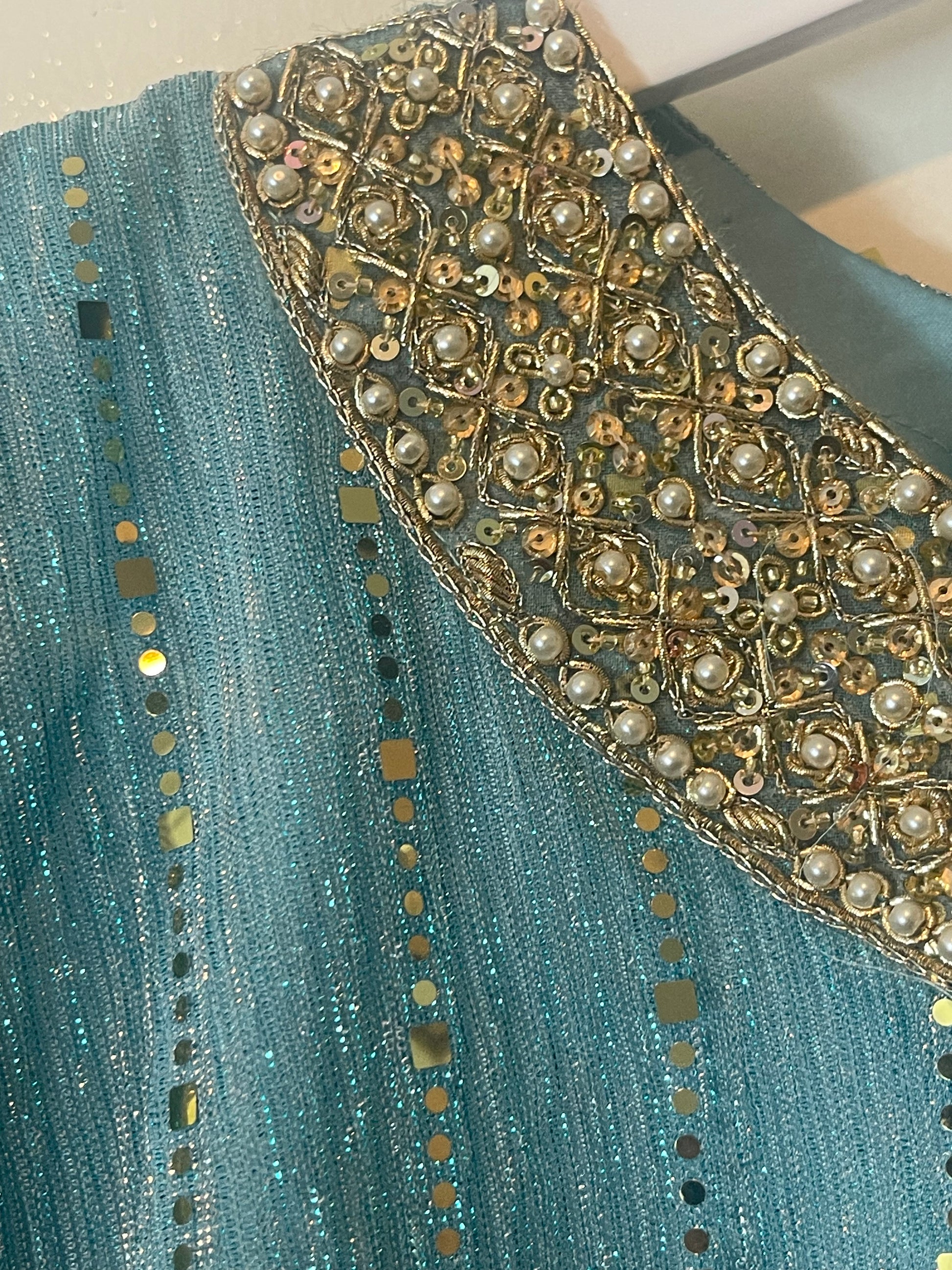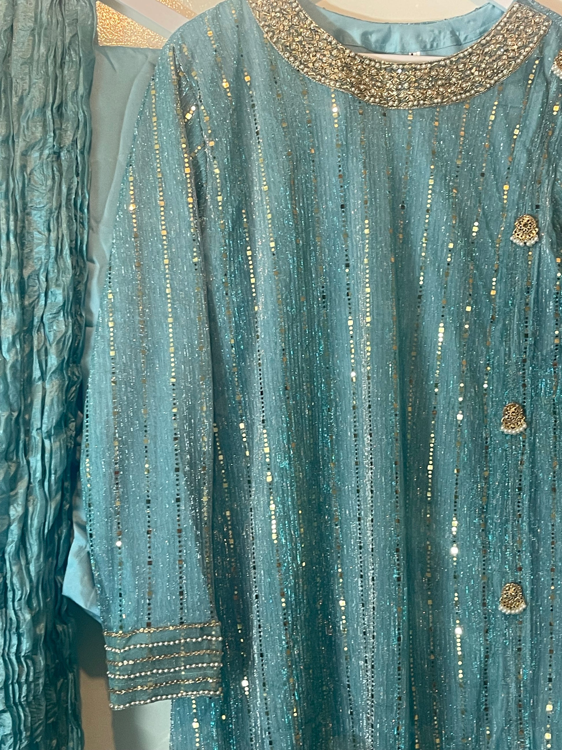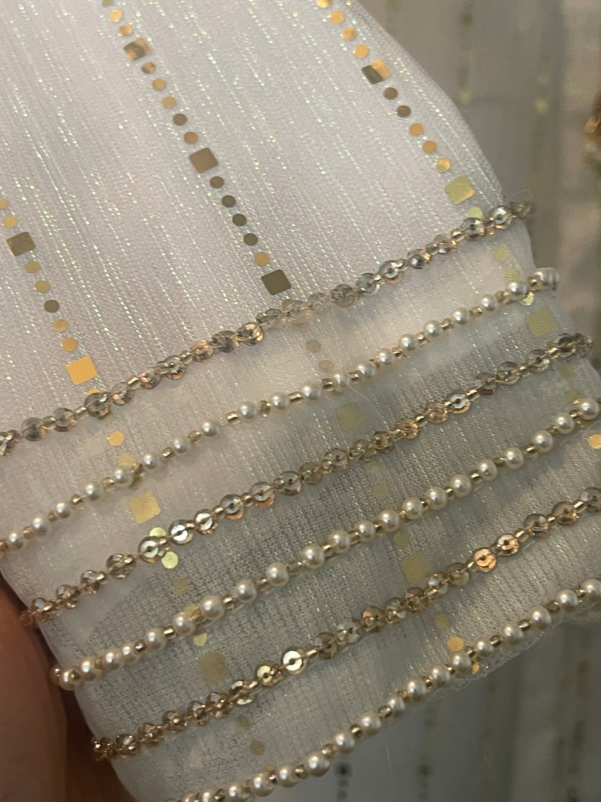 • Intricate Adda Work: The neckline and sleeves are beautifully adorned with detailed Adda work, adding a touch of sophistication to your ensemble.