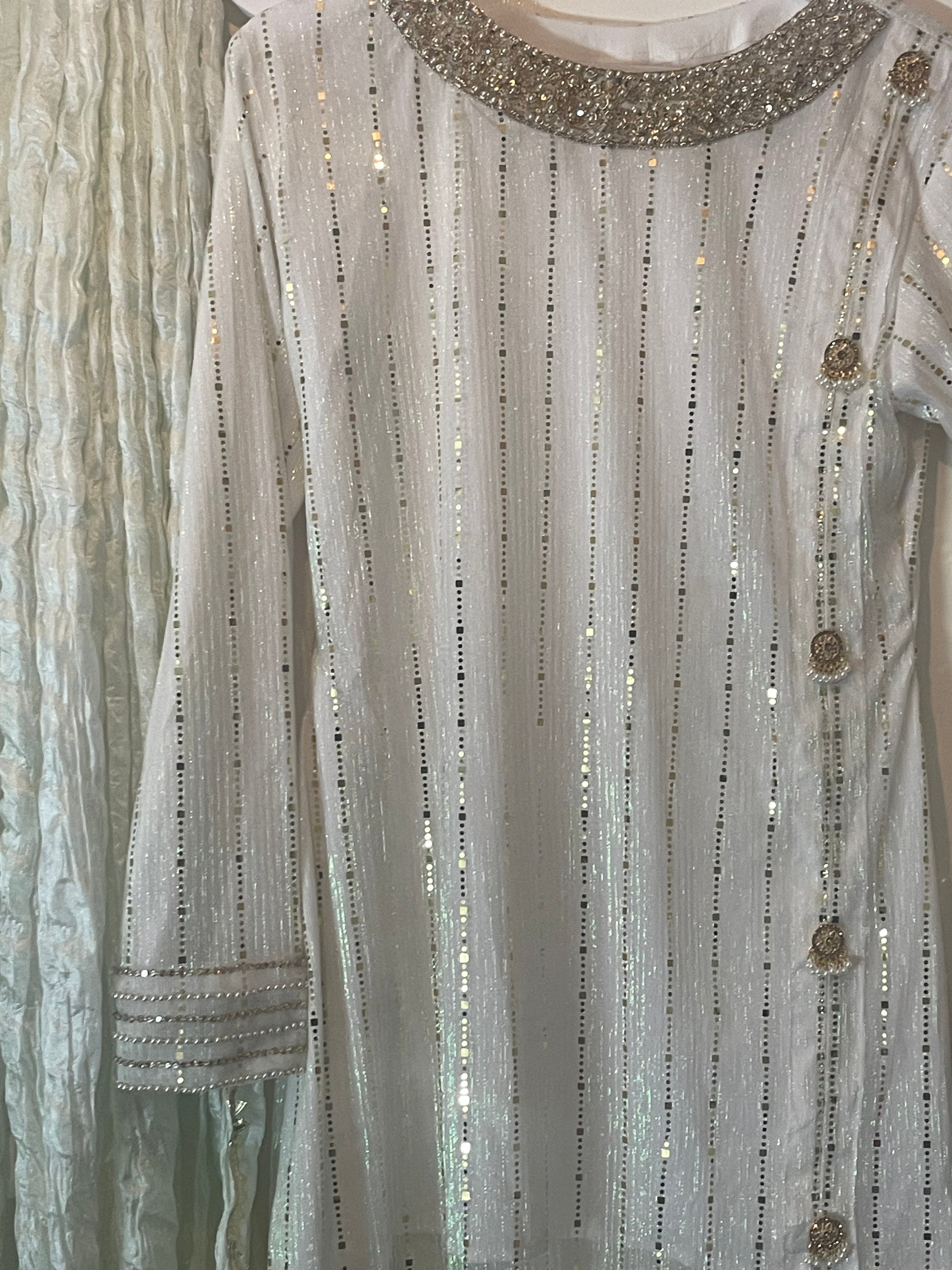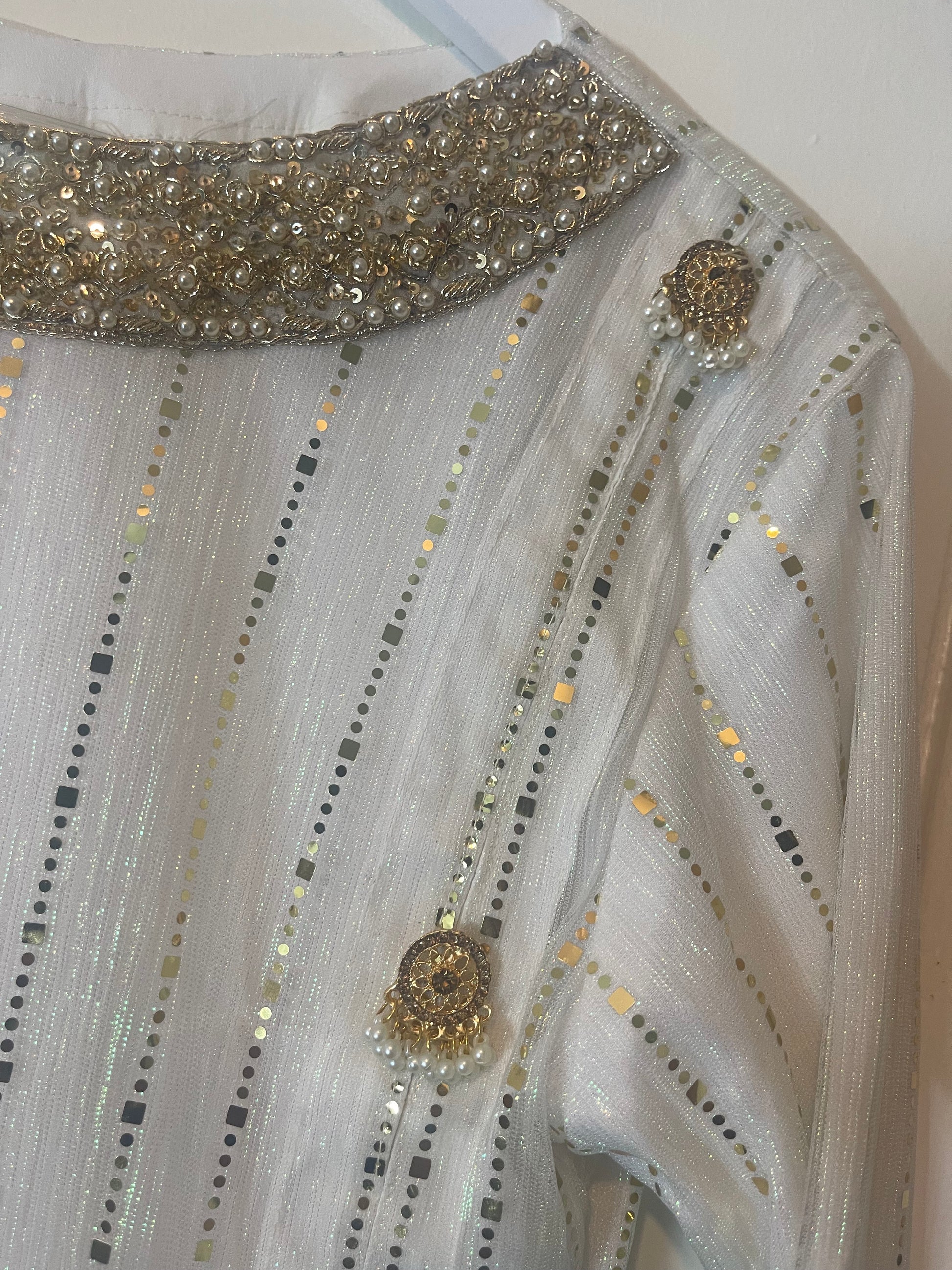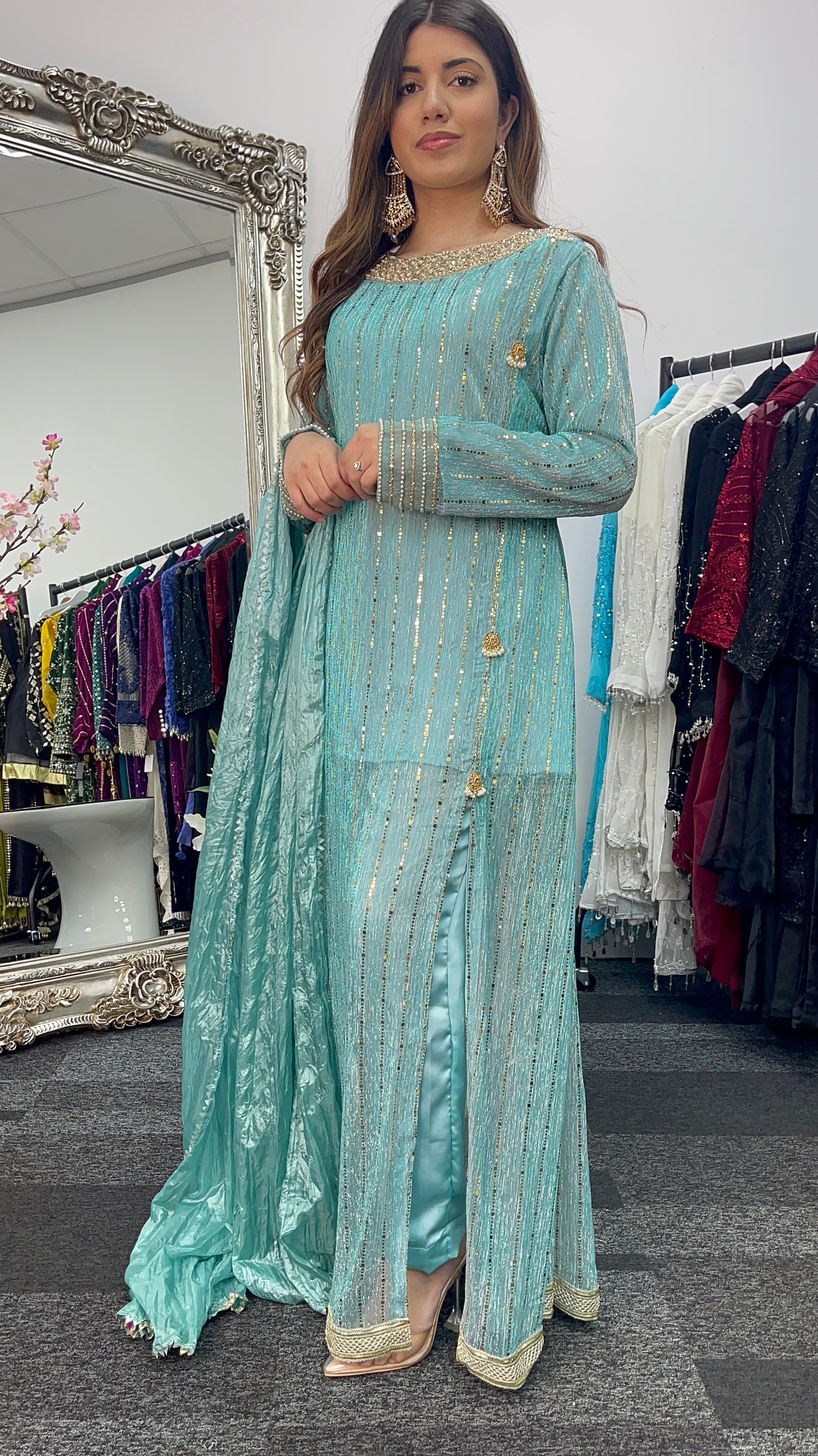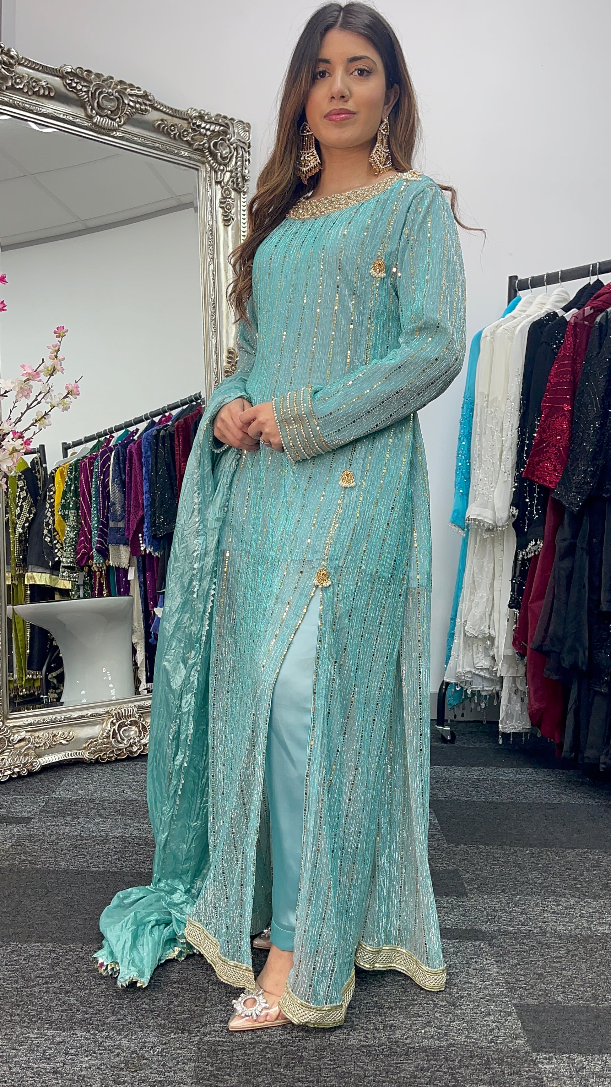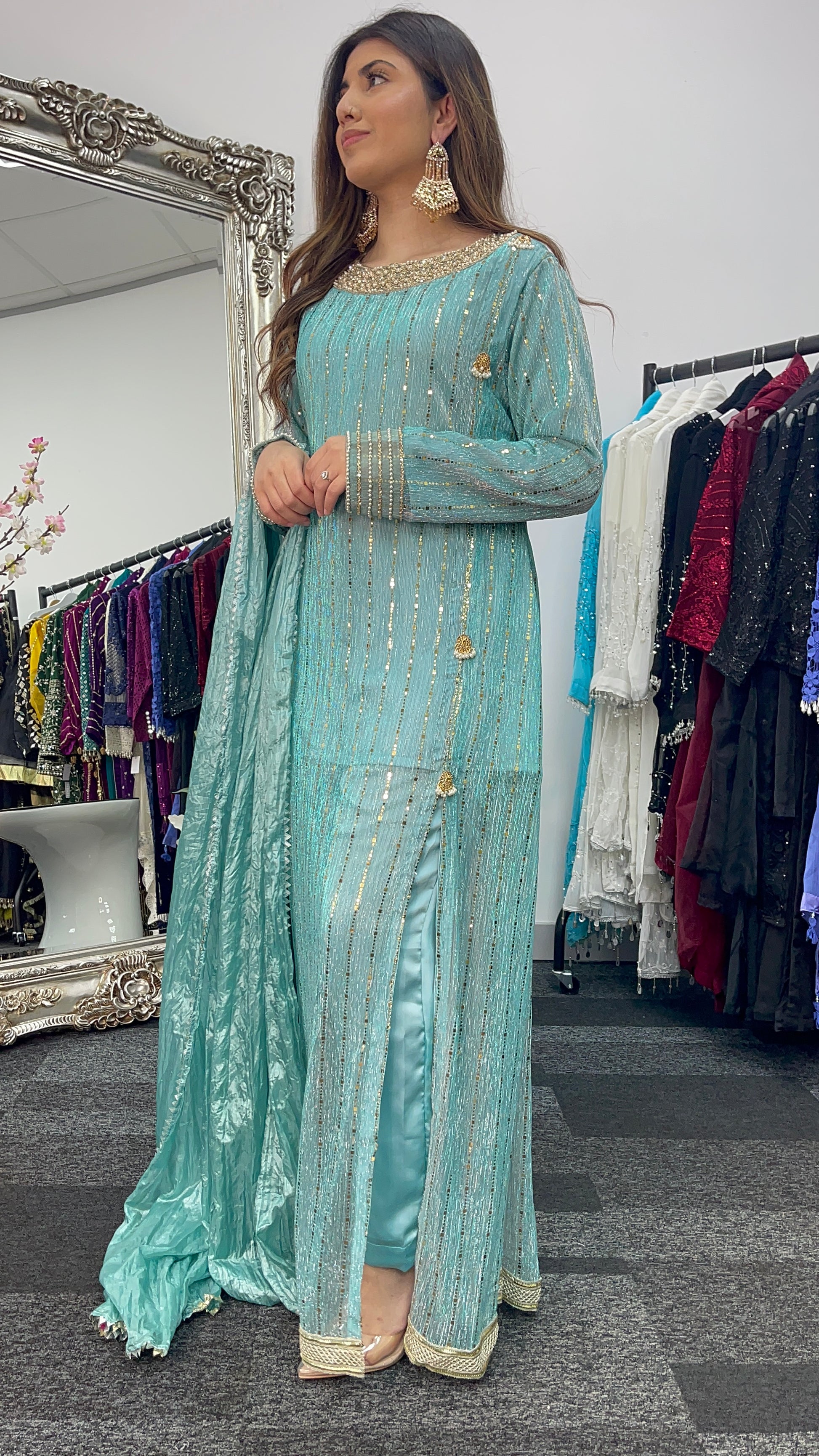 • Intricate Adda Work: The neckline and sleeves are beautifully adorned with detailed Adda work, adding a touch of sophistication to your ensemble.
