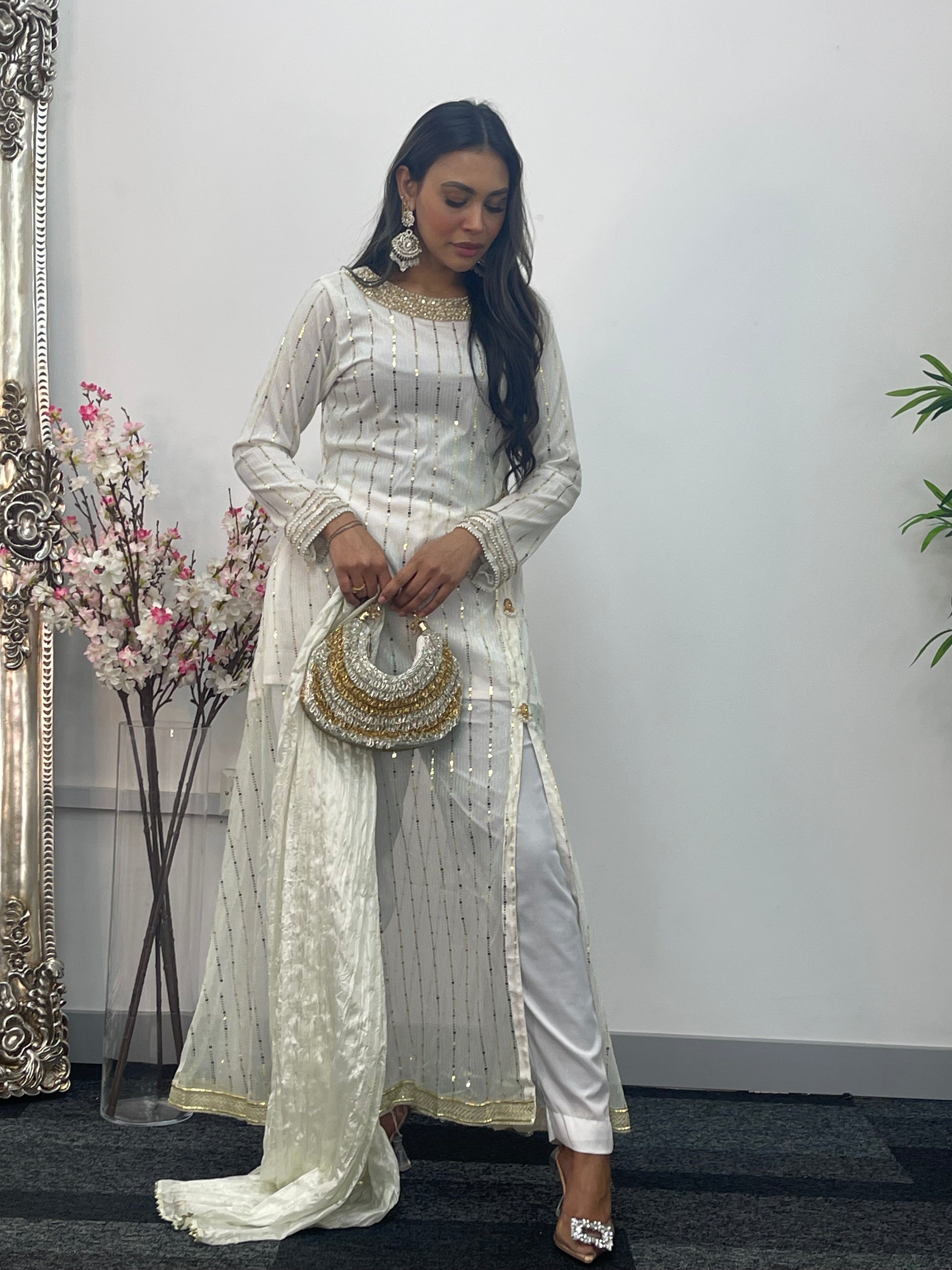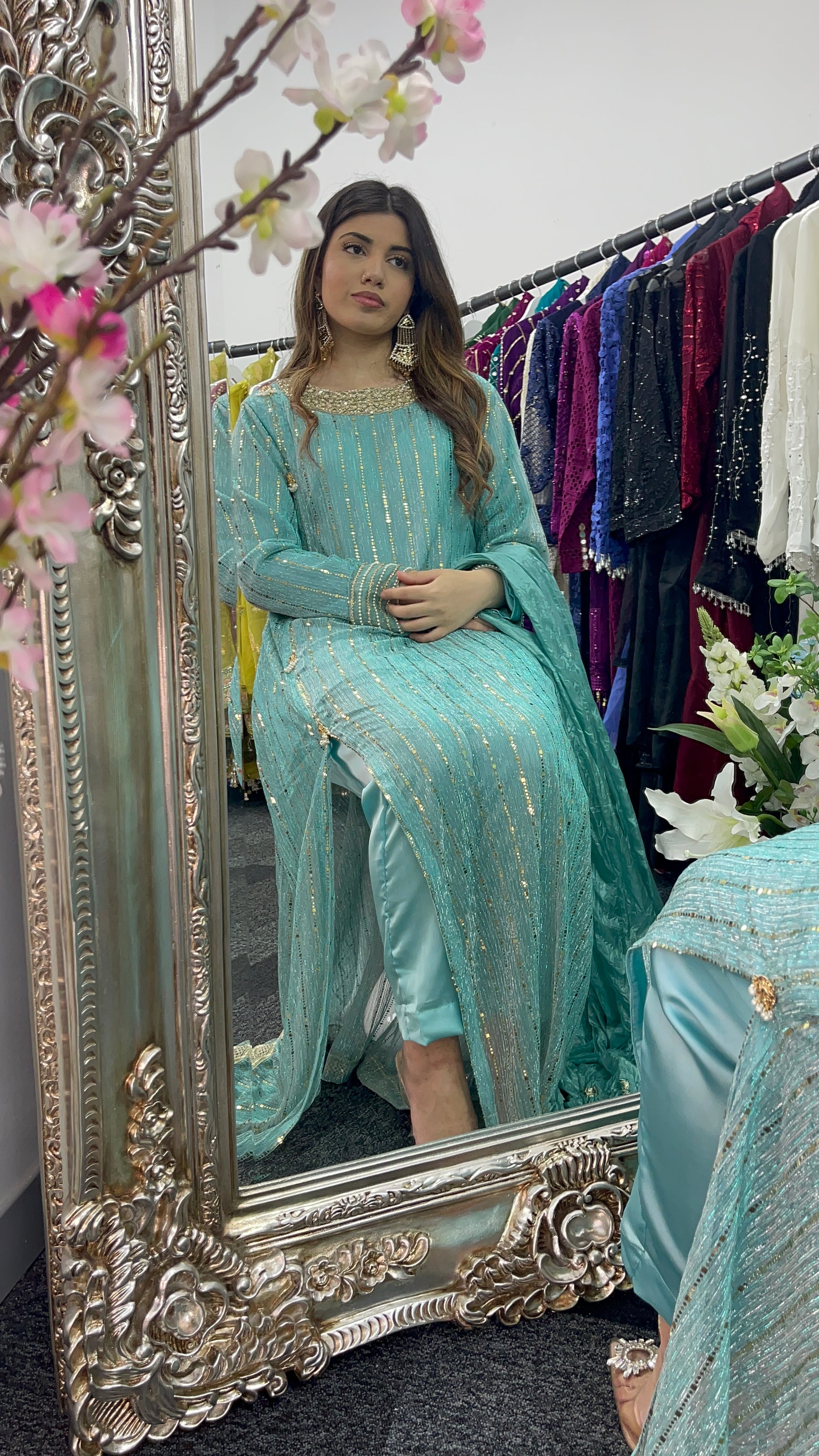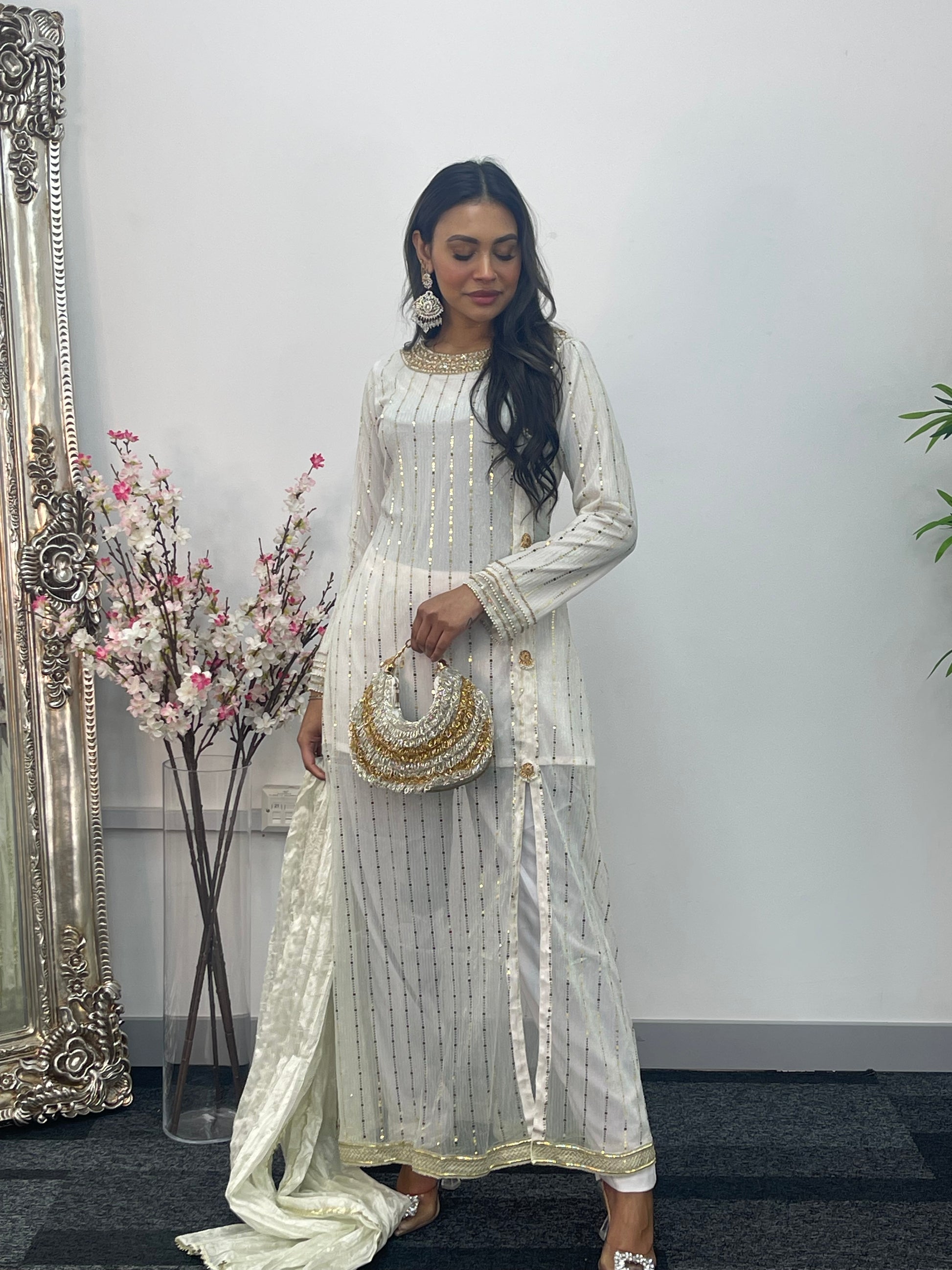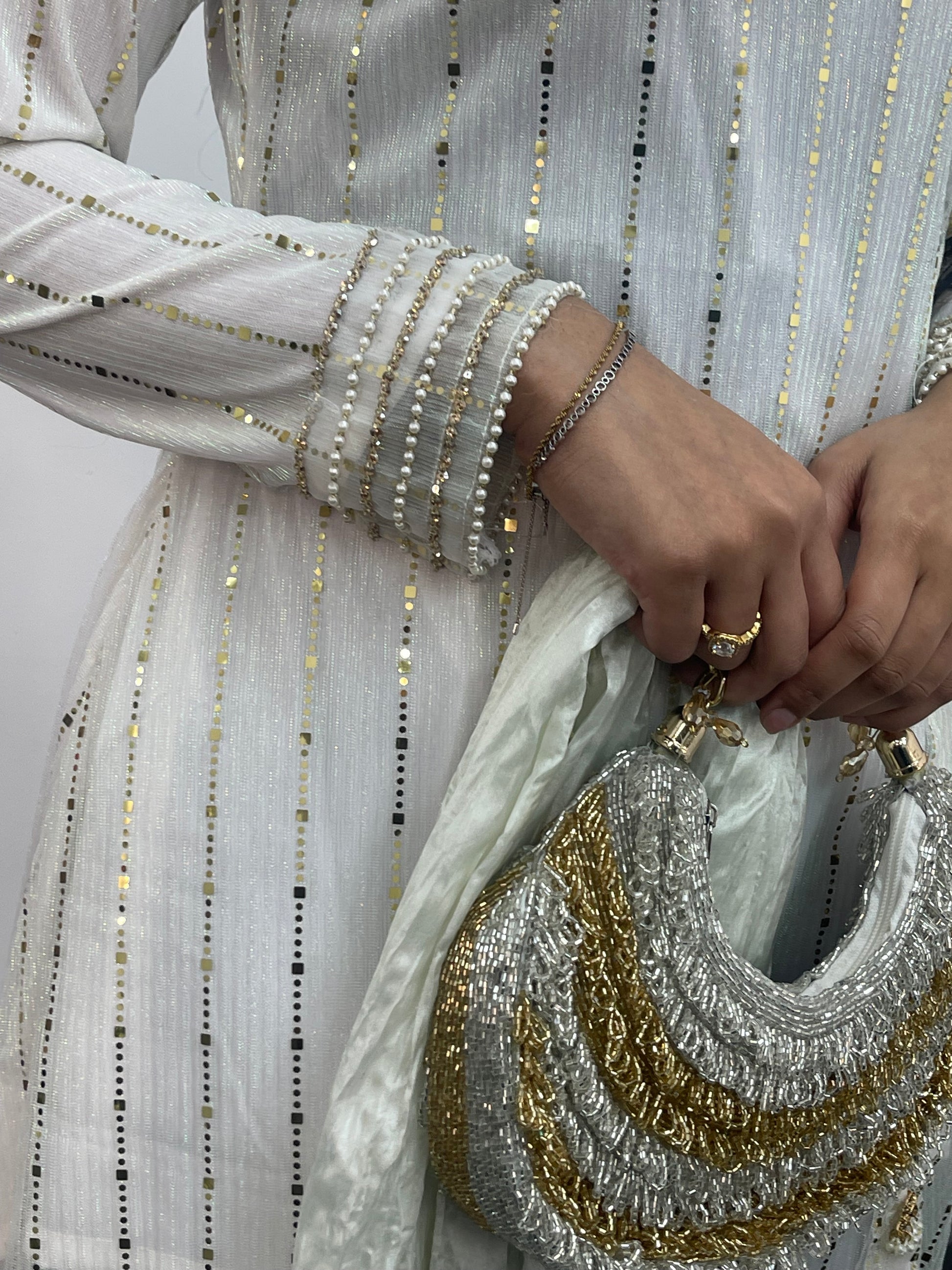 • Intricate Adda Work: The neckline and sleeves are beautifully adorned with detailed Adda work, adding a touch of sophistication to your ensemble.