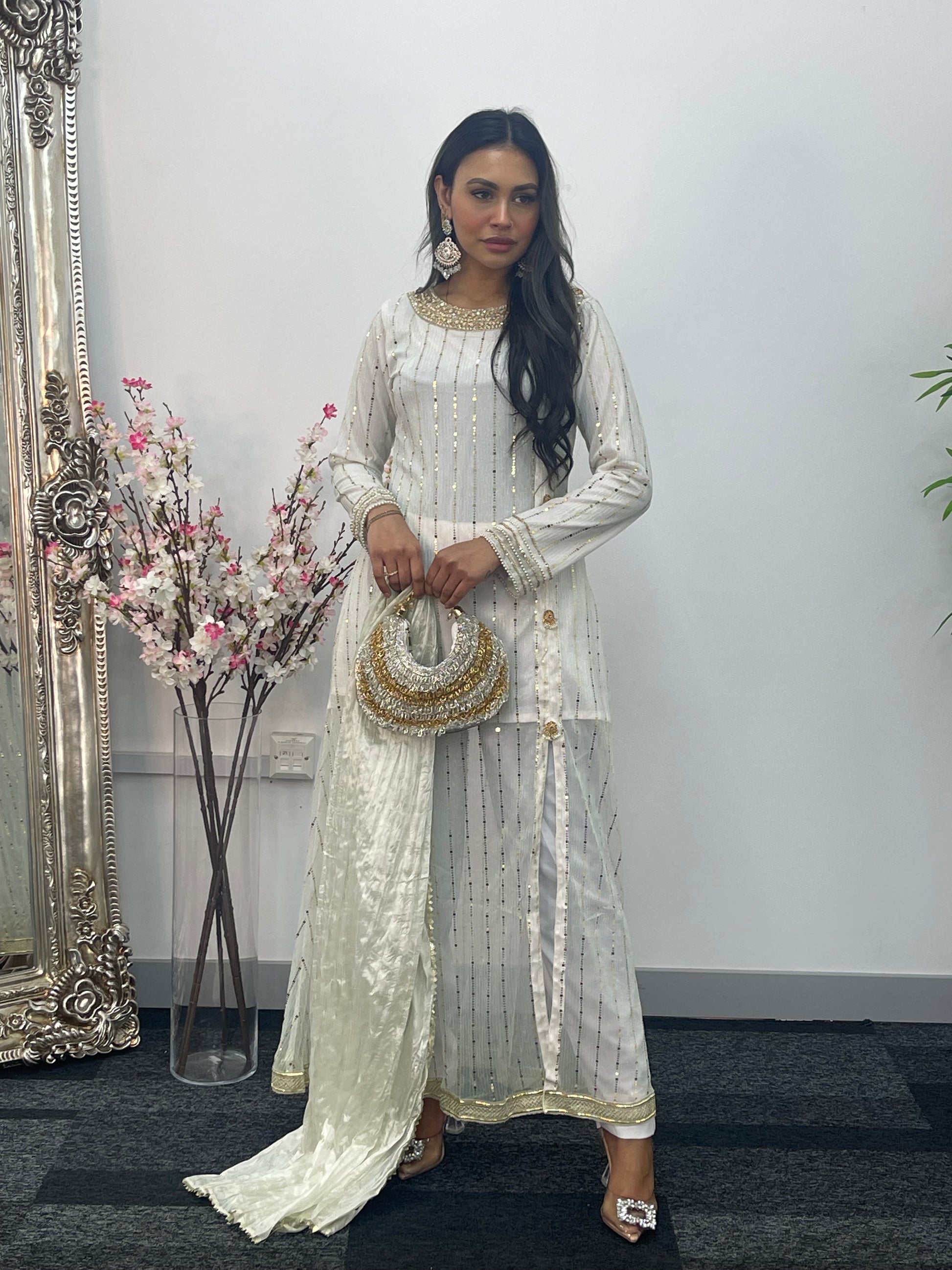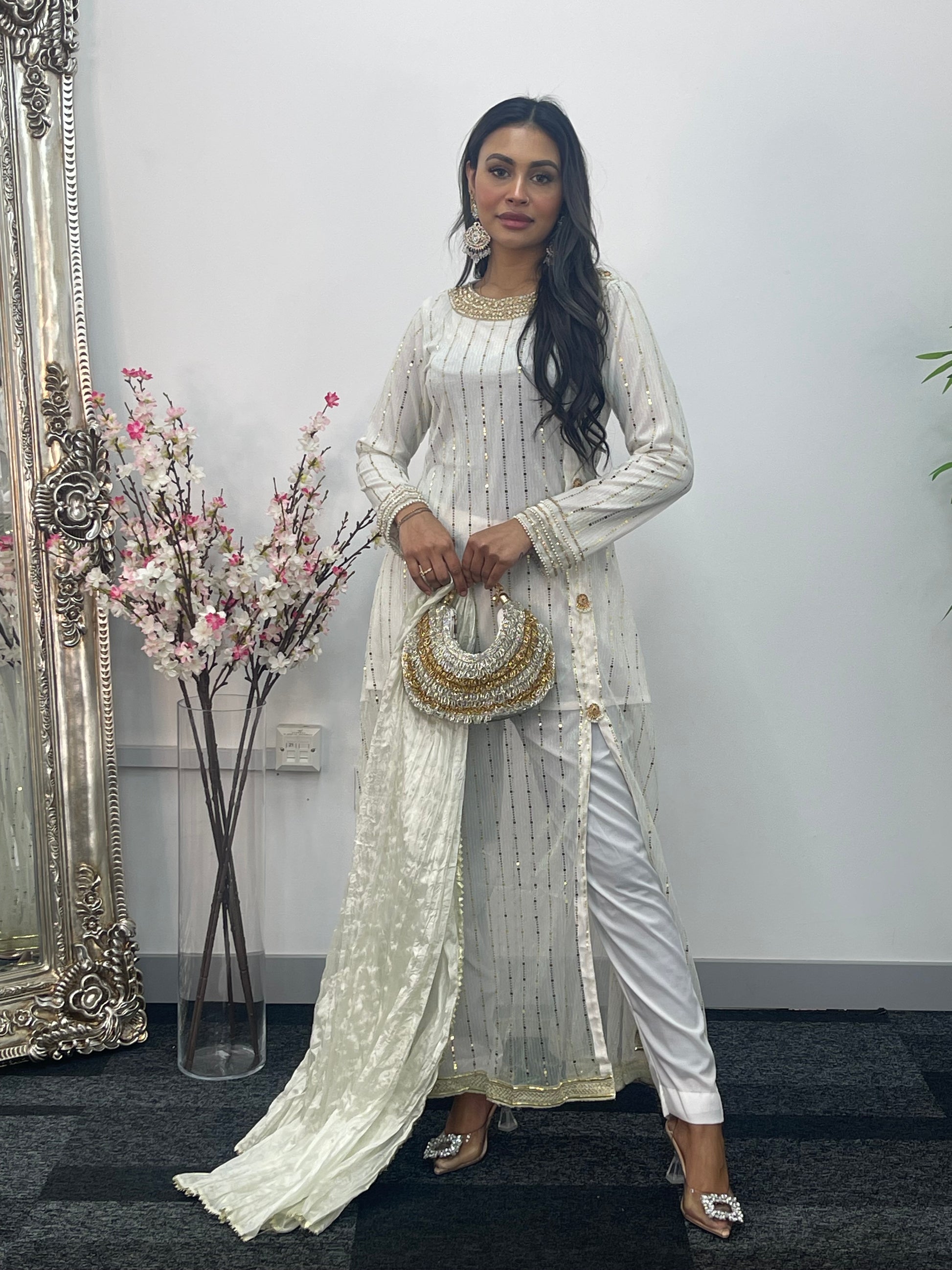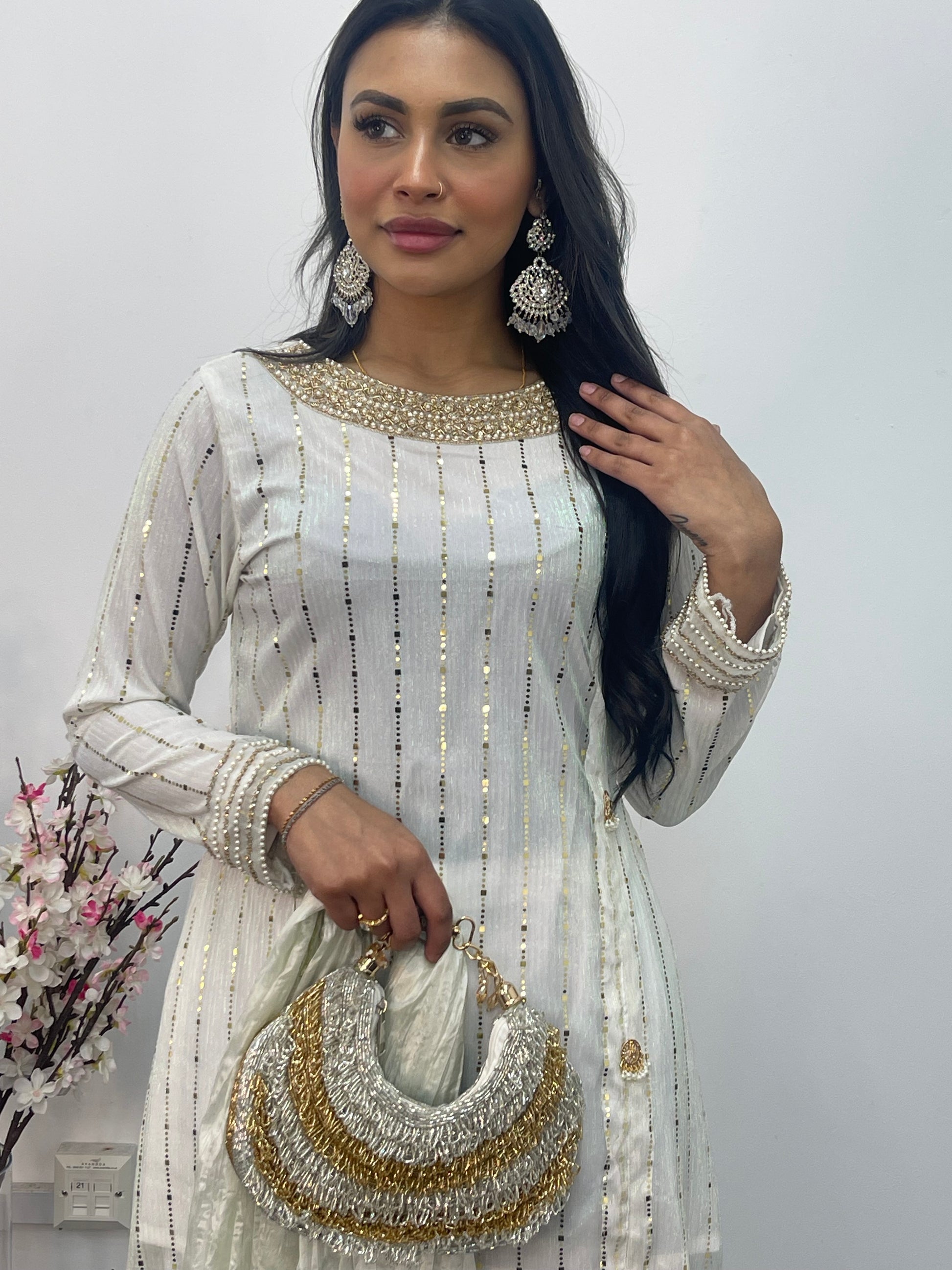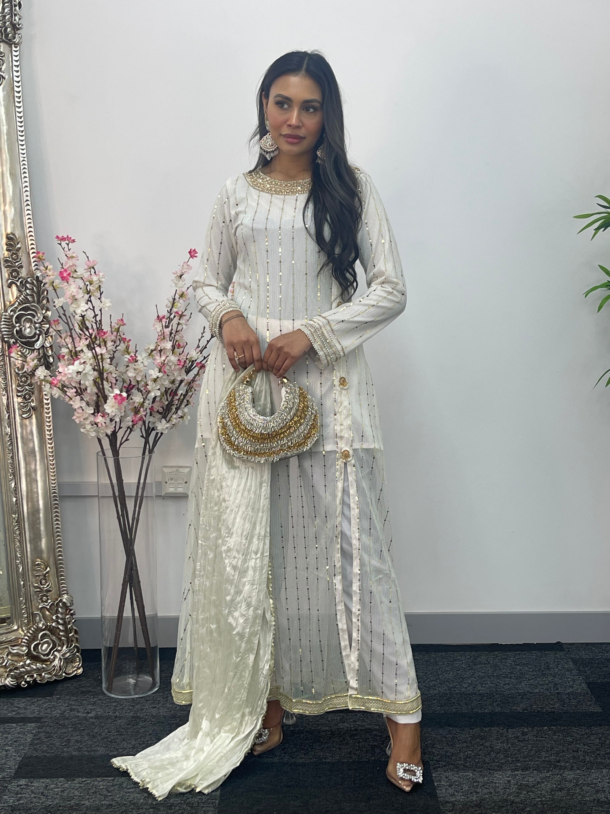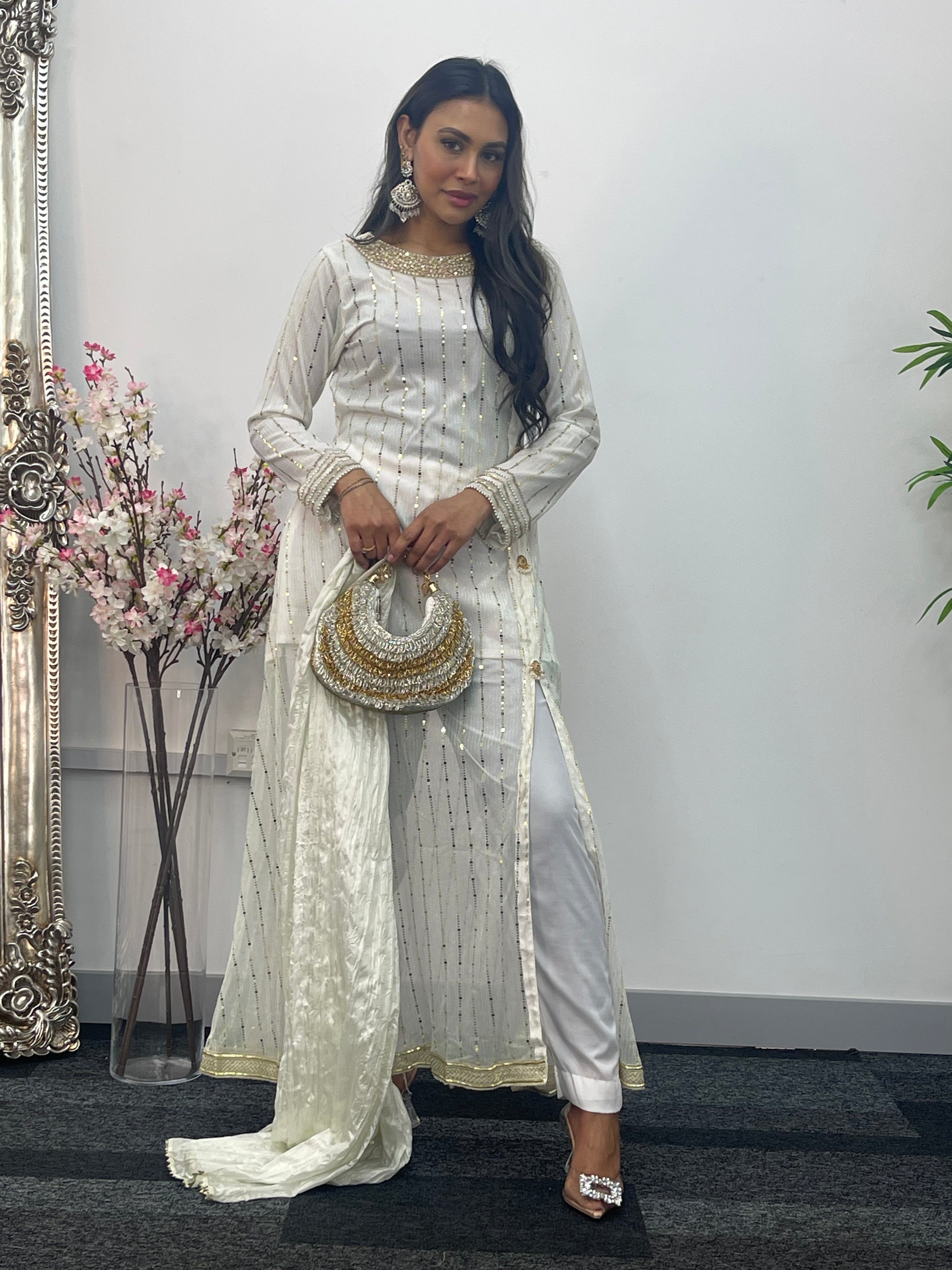 • Intricate Adda Work: The neckline and sleeves are beautifully adorned with detailed Adda work, adding a touch of sophistication to your ensemble.