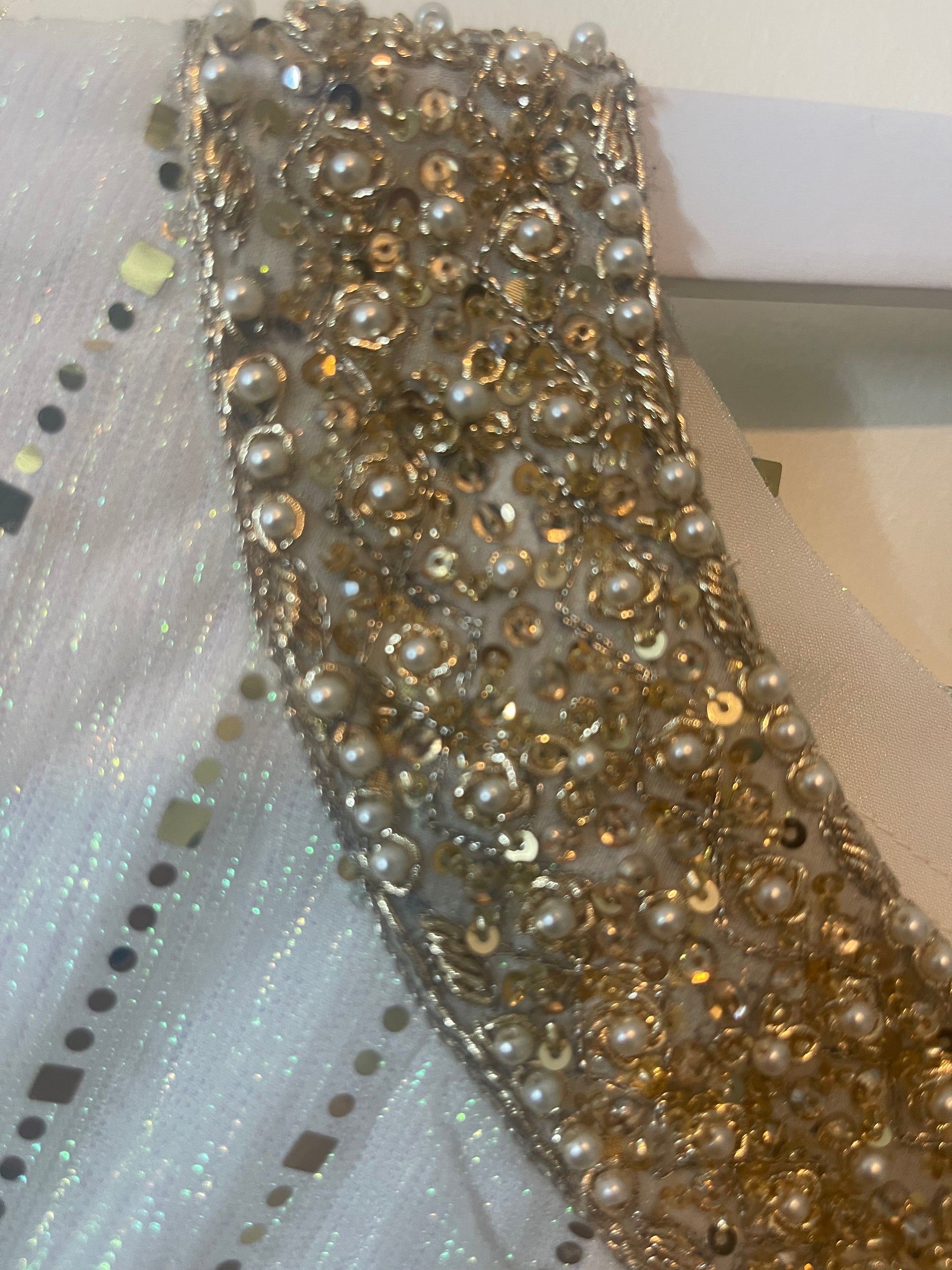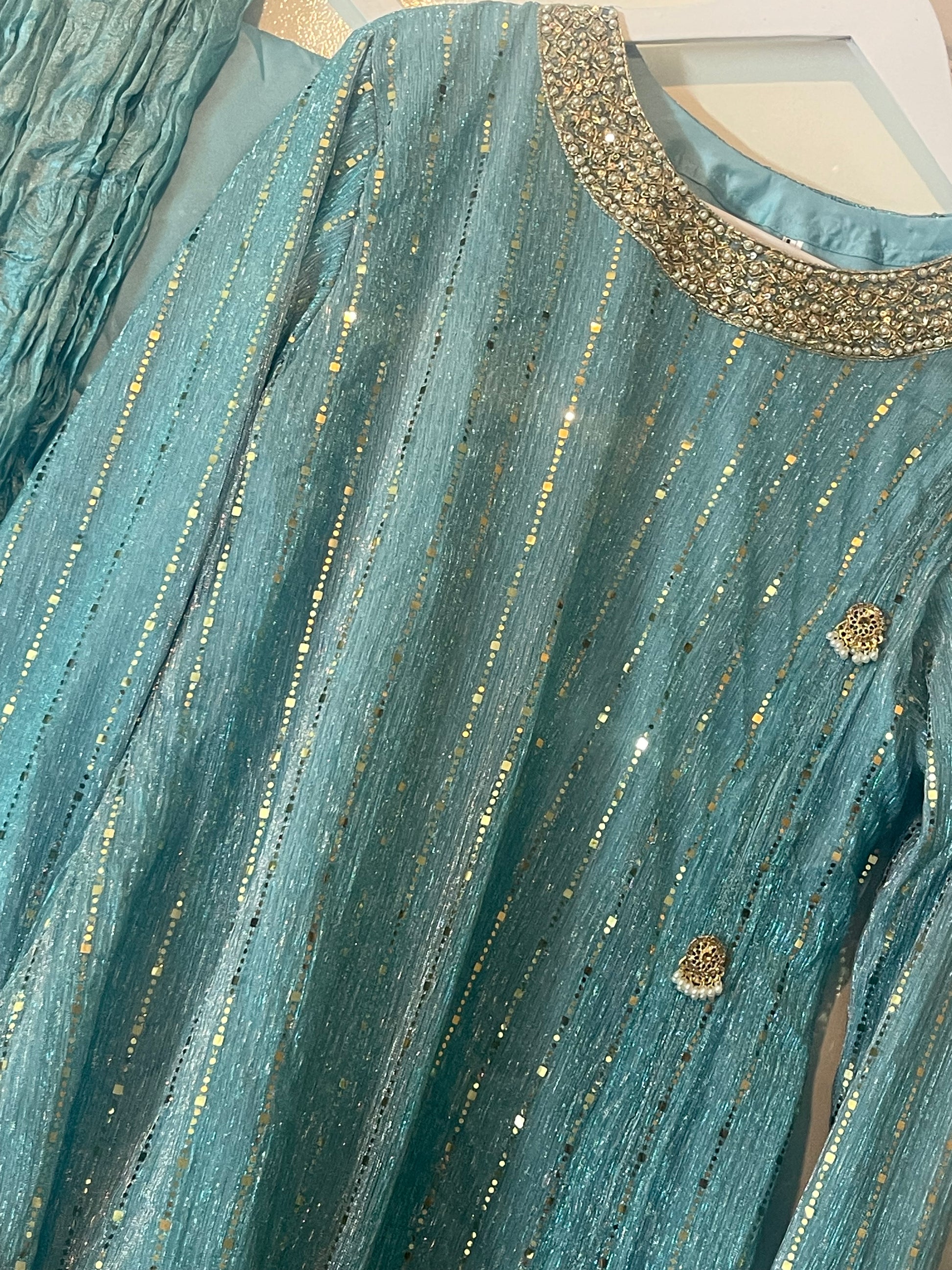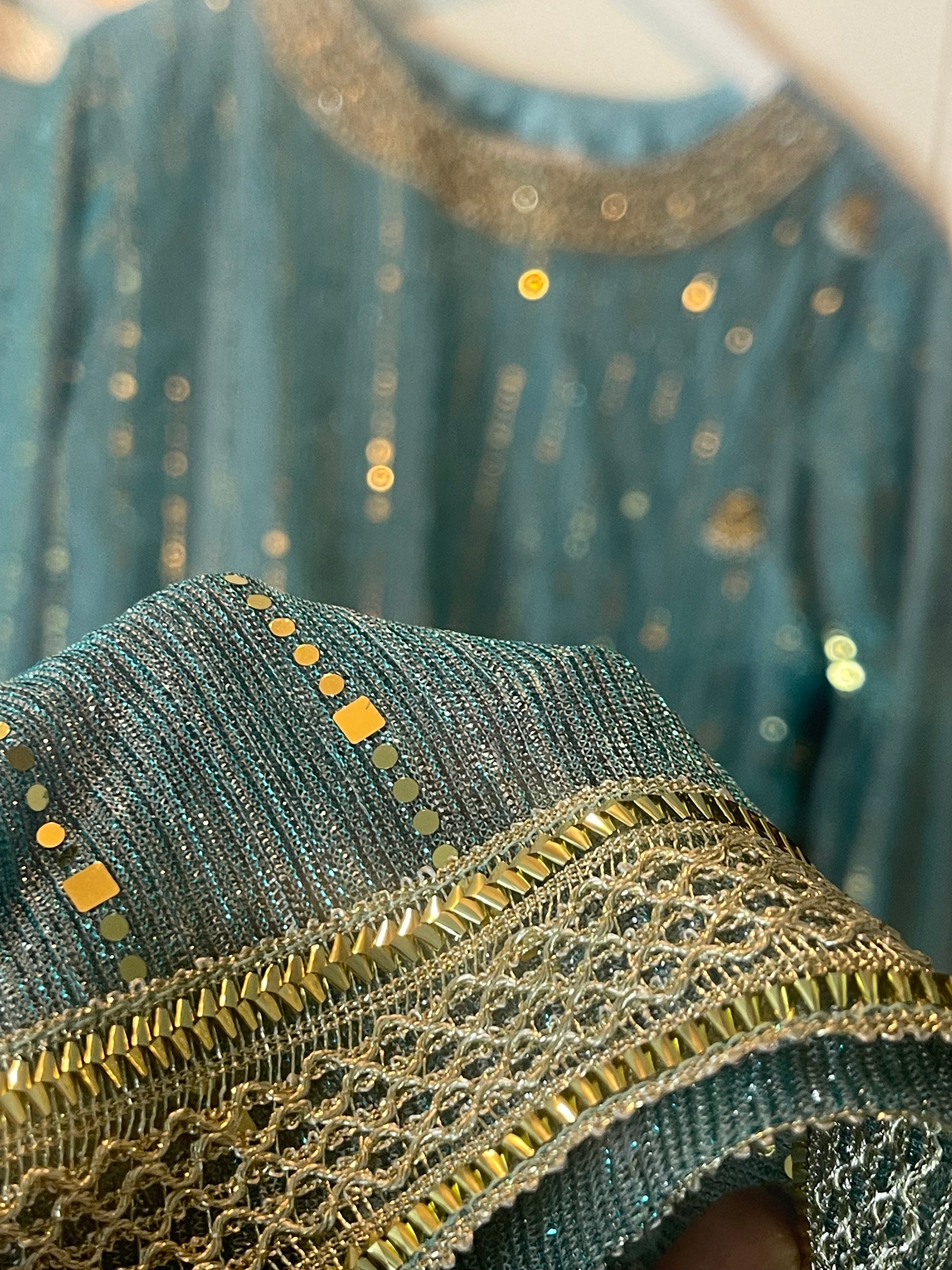 • Luxurious Dupatta: Accompanied by a crushed silk dupatta, this ensemble boasts a four-sided lace trim that enhances its elegance.