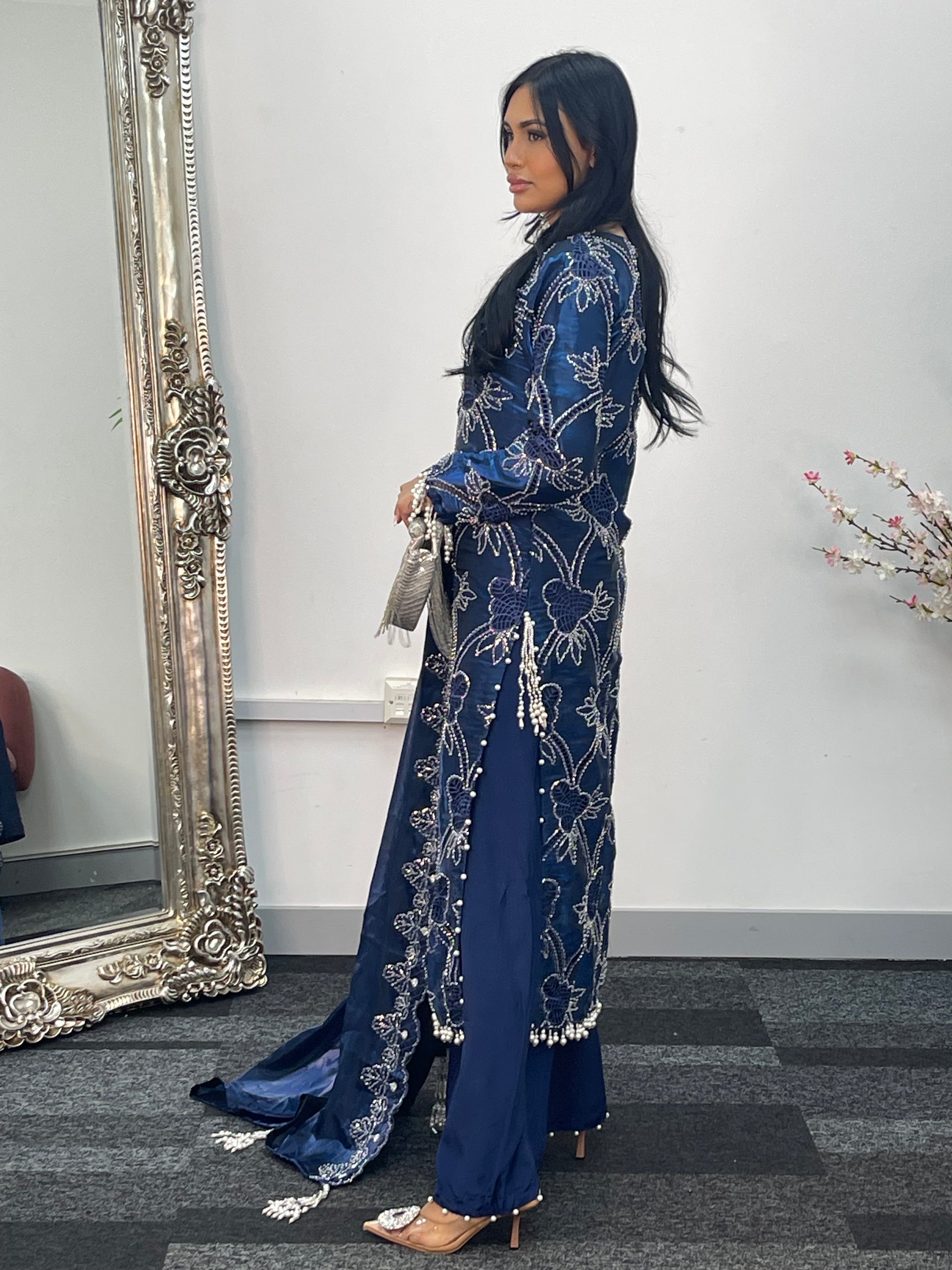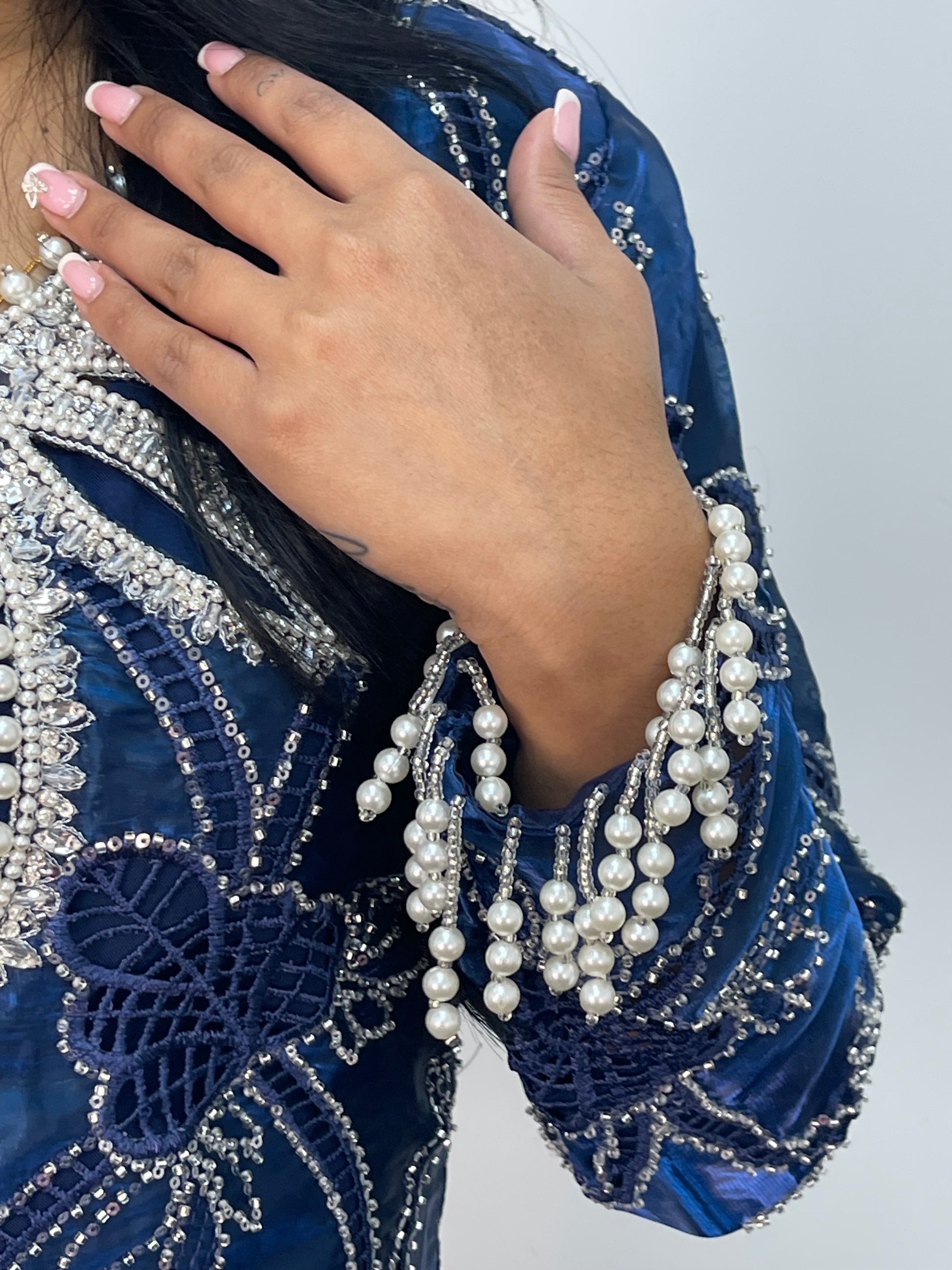 adda work on the neckline. This elegant piece features sleeves with crystal detailing and charming latkans.