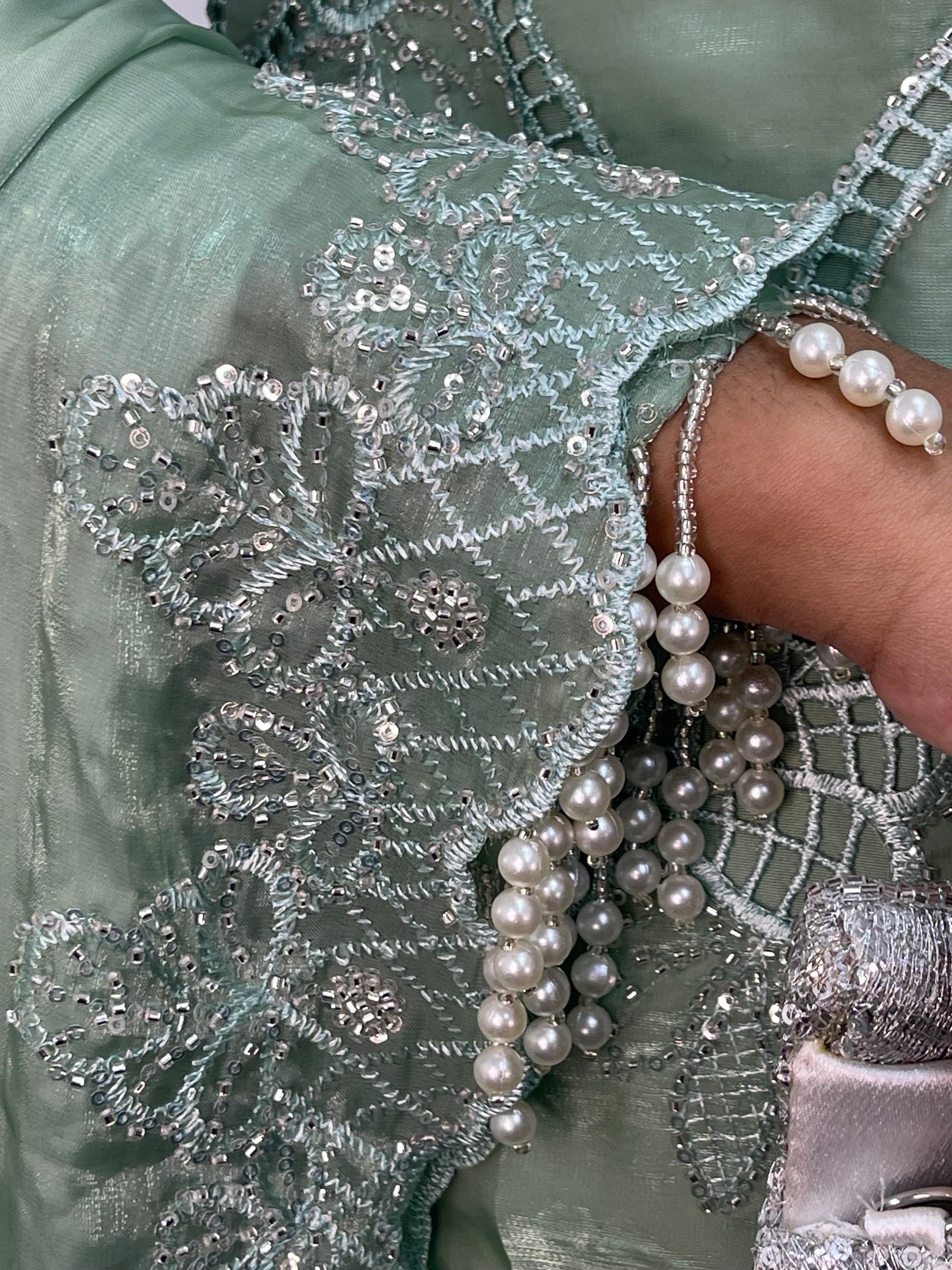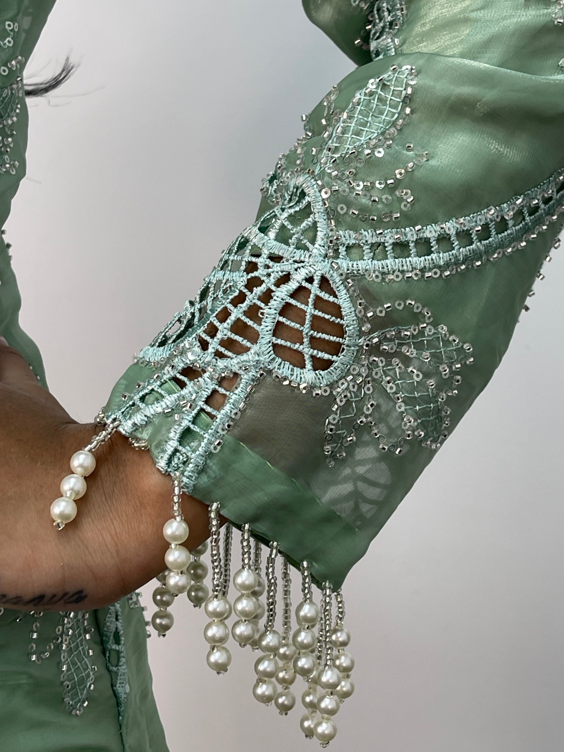 Introducing a stunning Korean silk shirt adorned with intricate heavy cutdana embellishments.