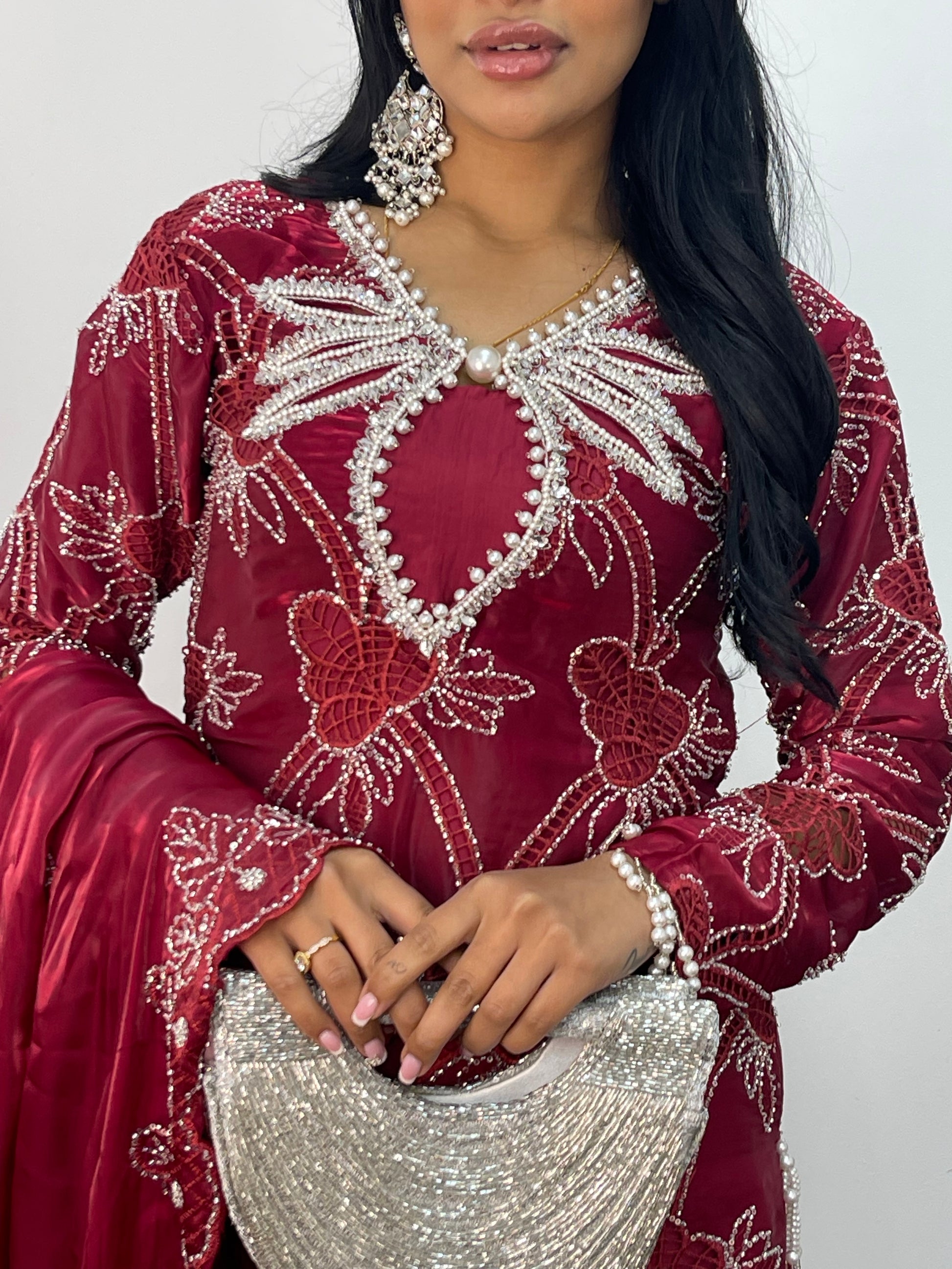 adda work on the neckline. This elegant piece features sleeves with crystal detailing and charming latkans.