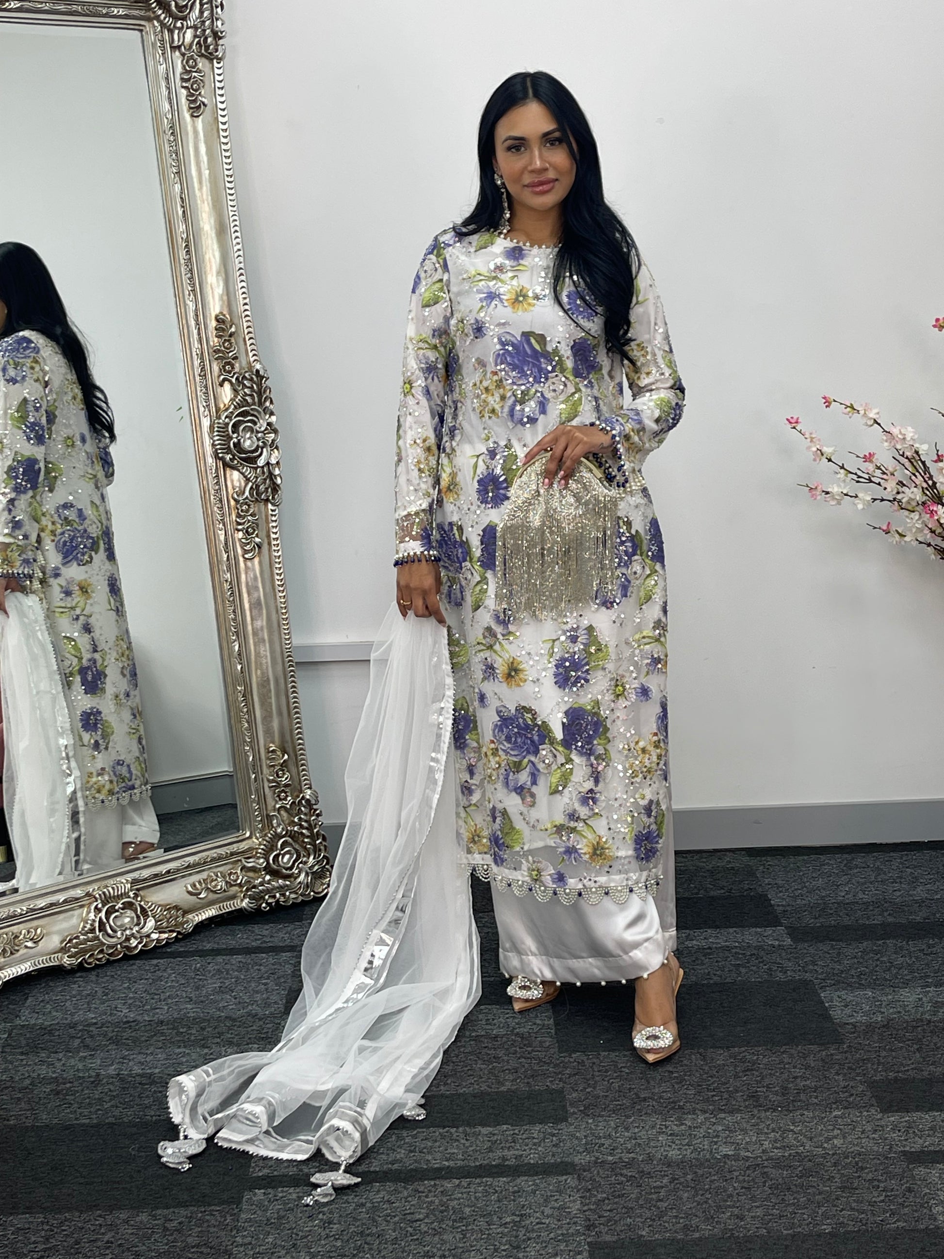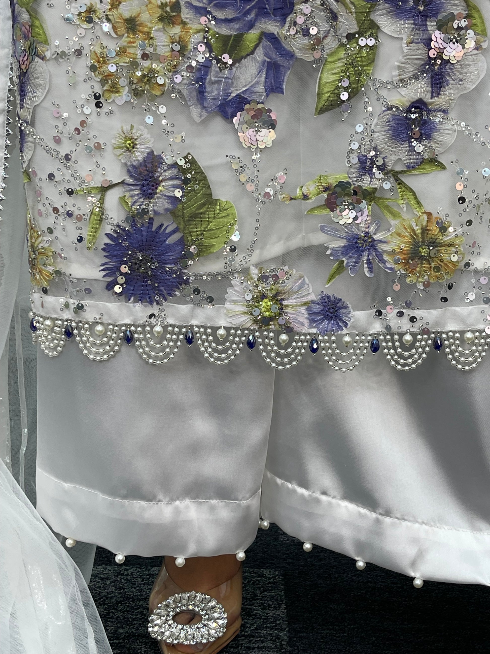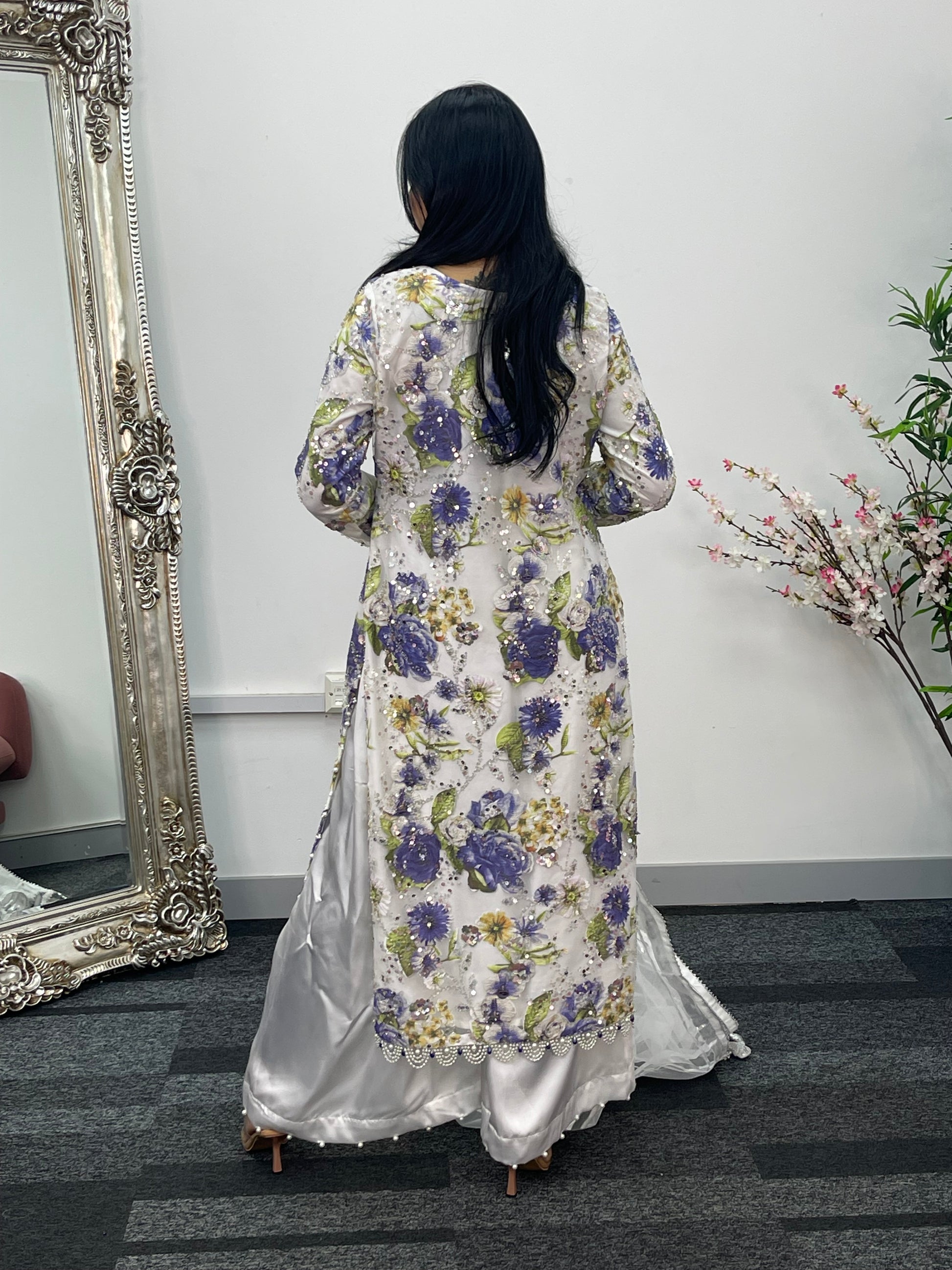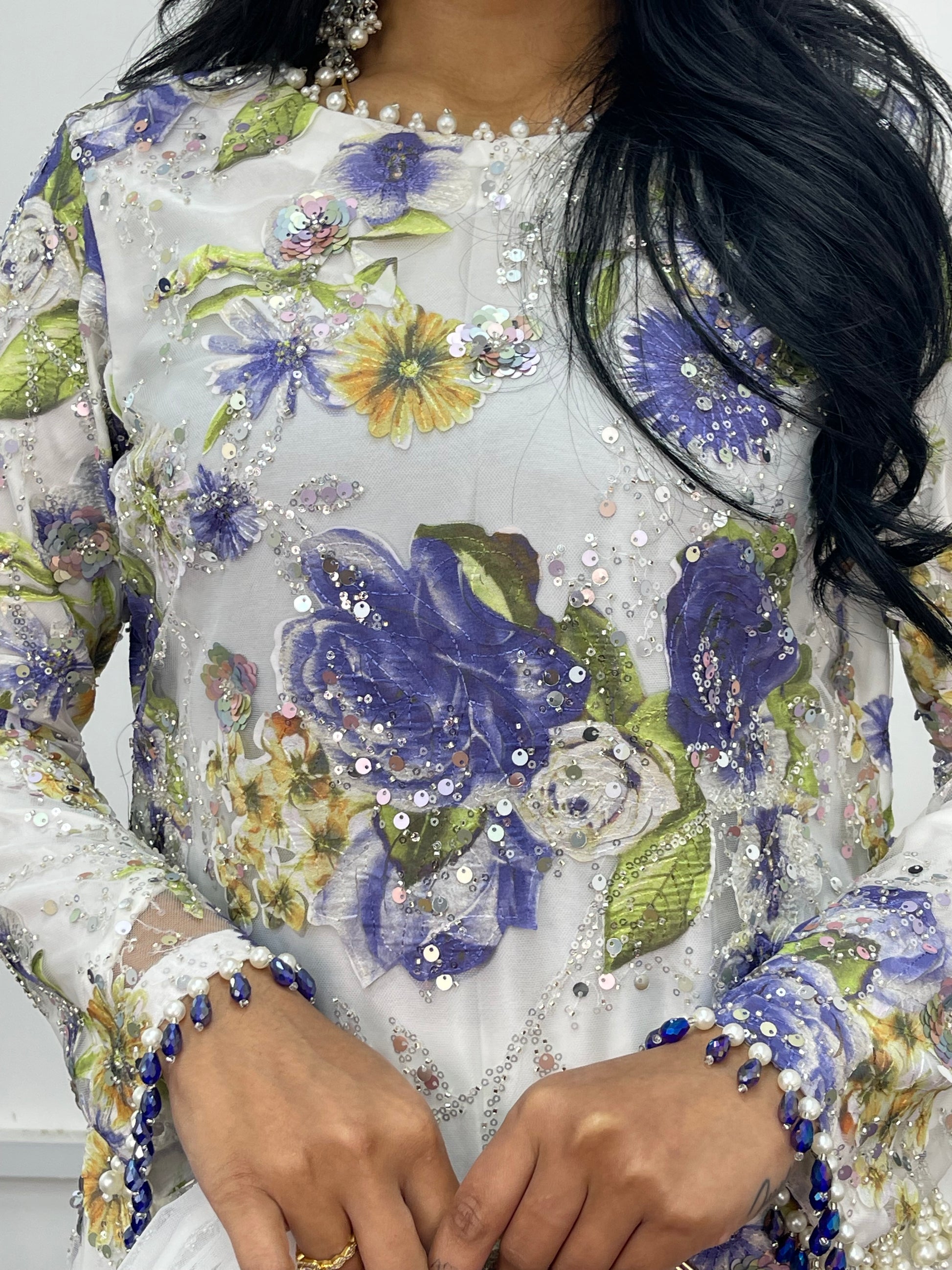 Introducing a stunning net shirt adorned with intricate heavy cutdana, various sequins and appliqué work.