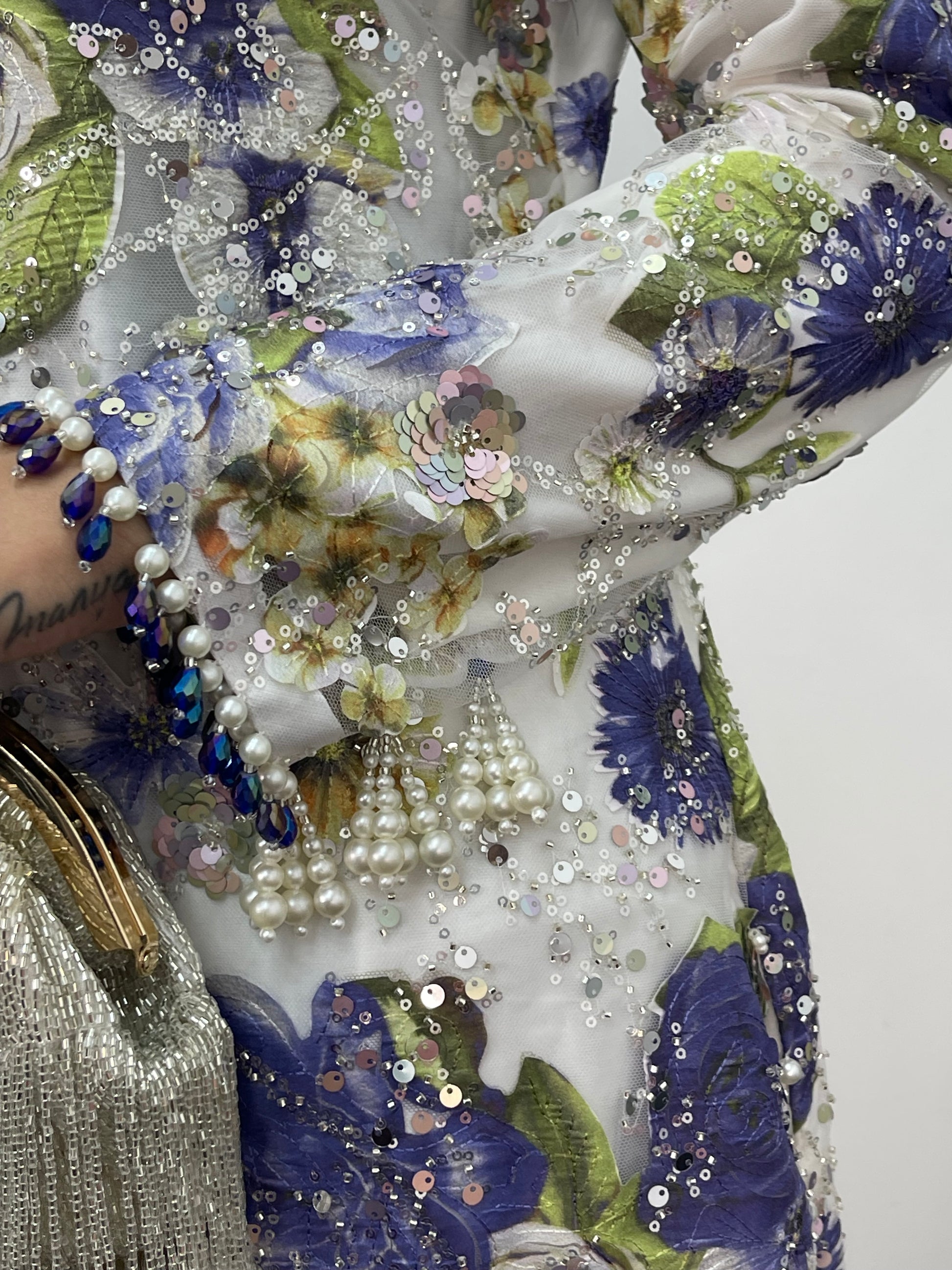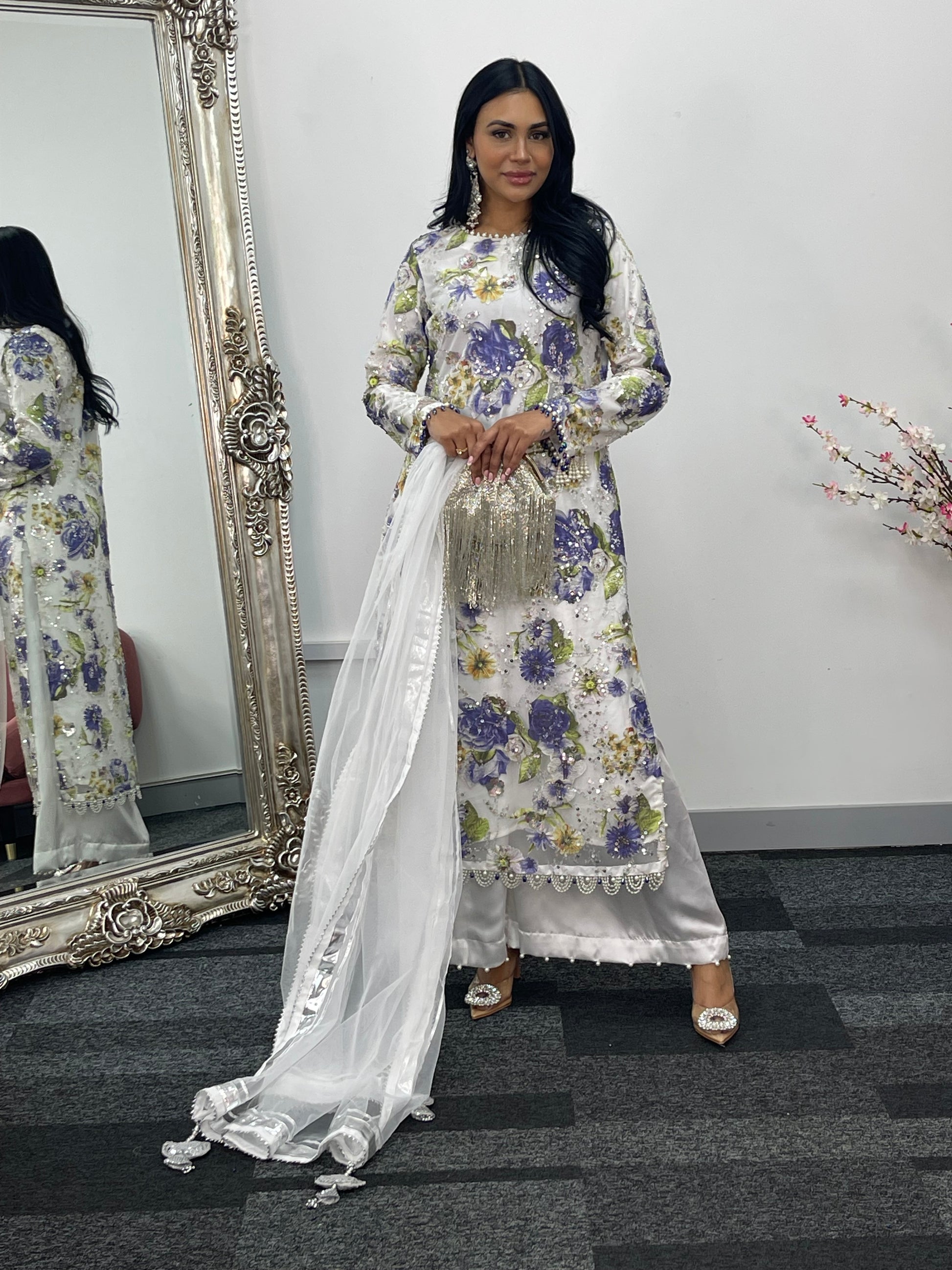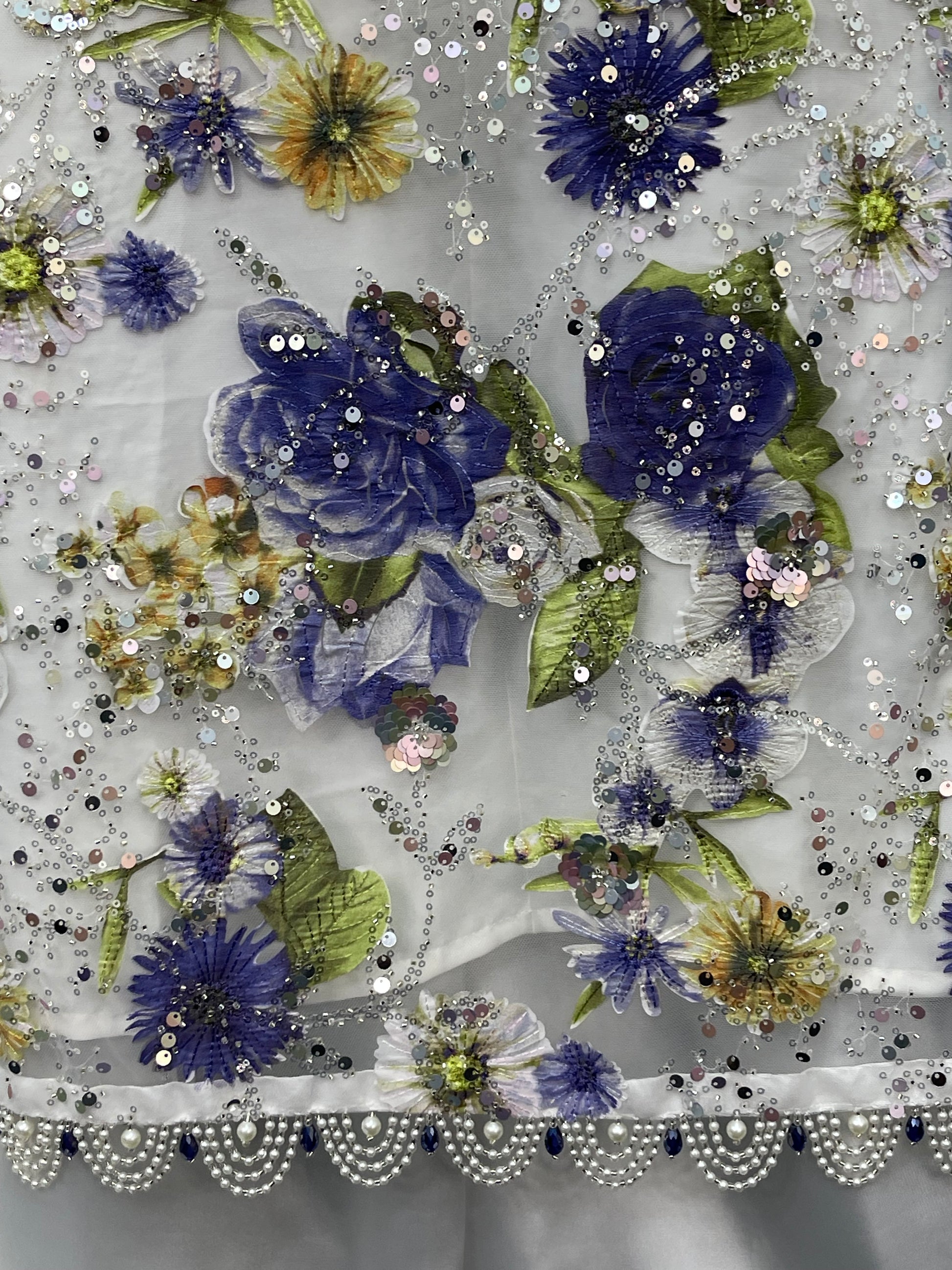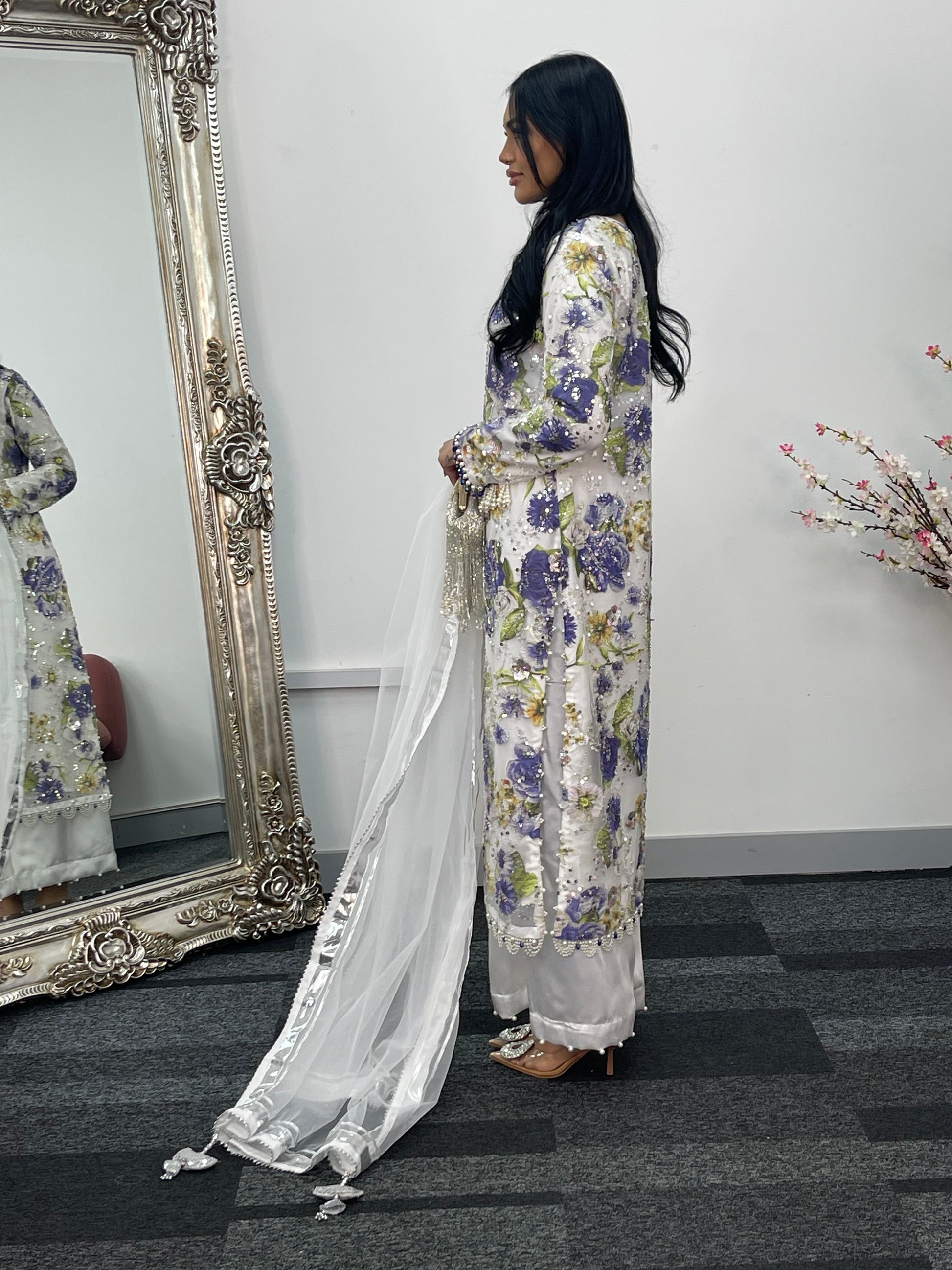 Introducing a stunning net shirt adorned with intricate heavy cutdana, various sequins and appliqué work.