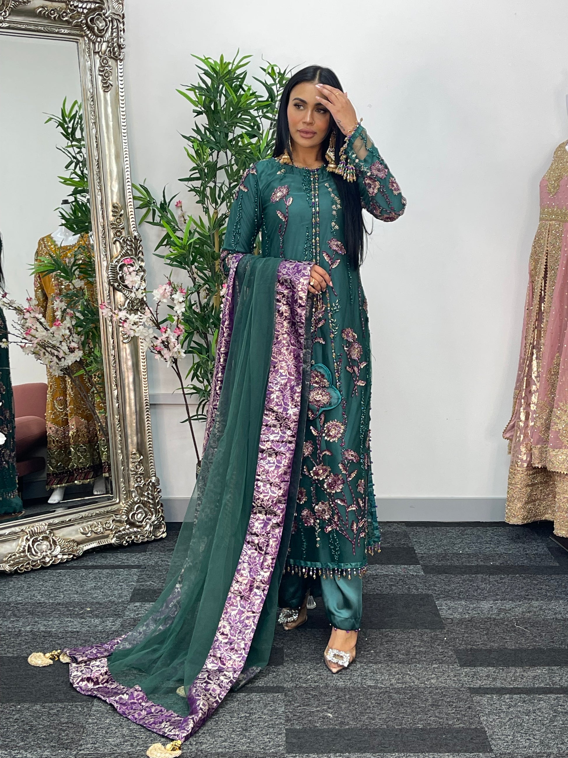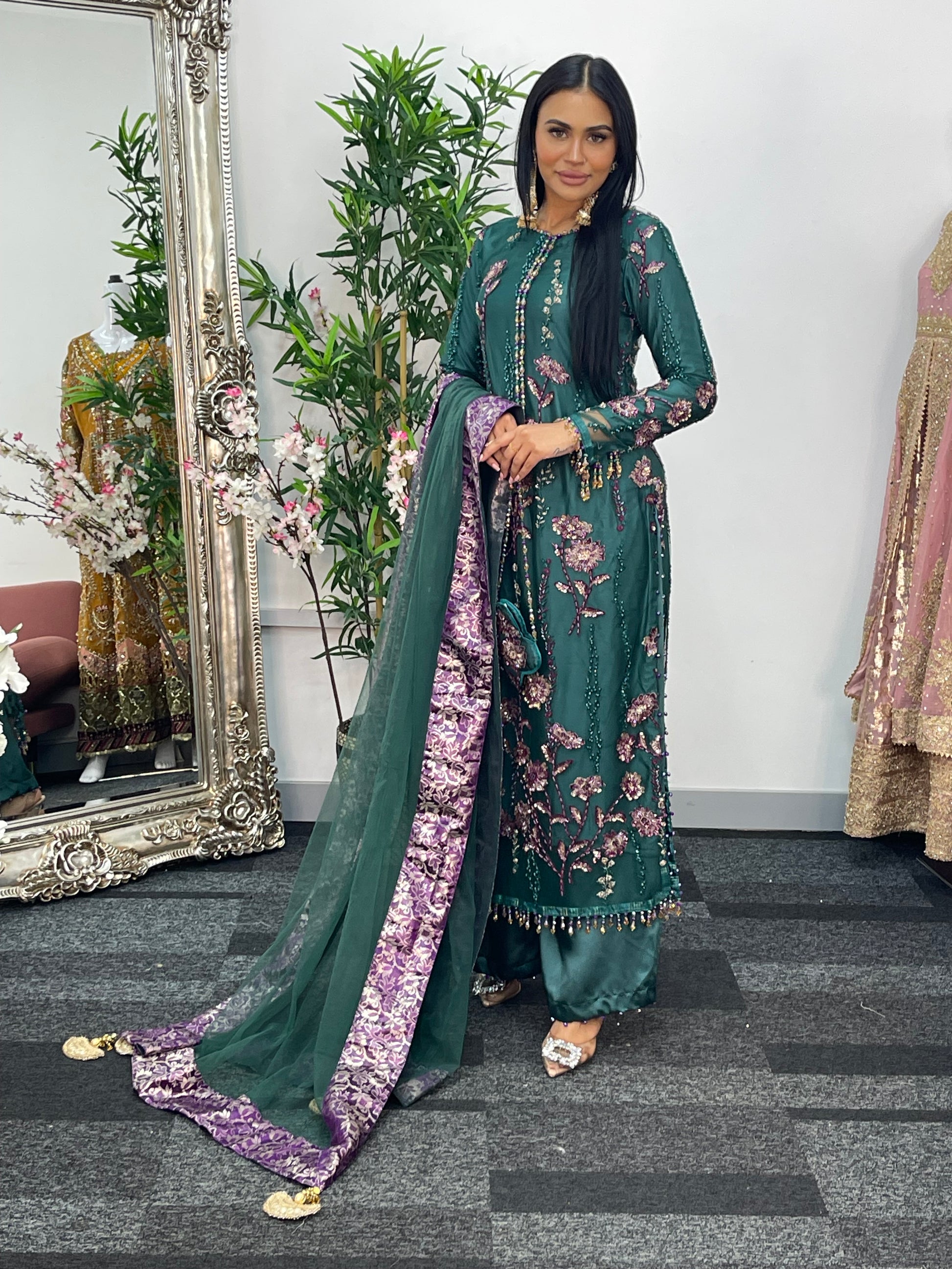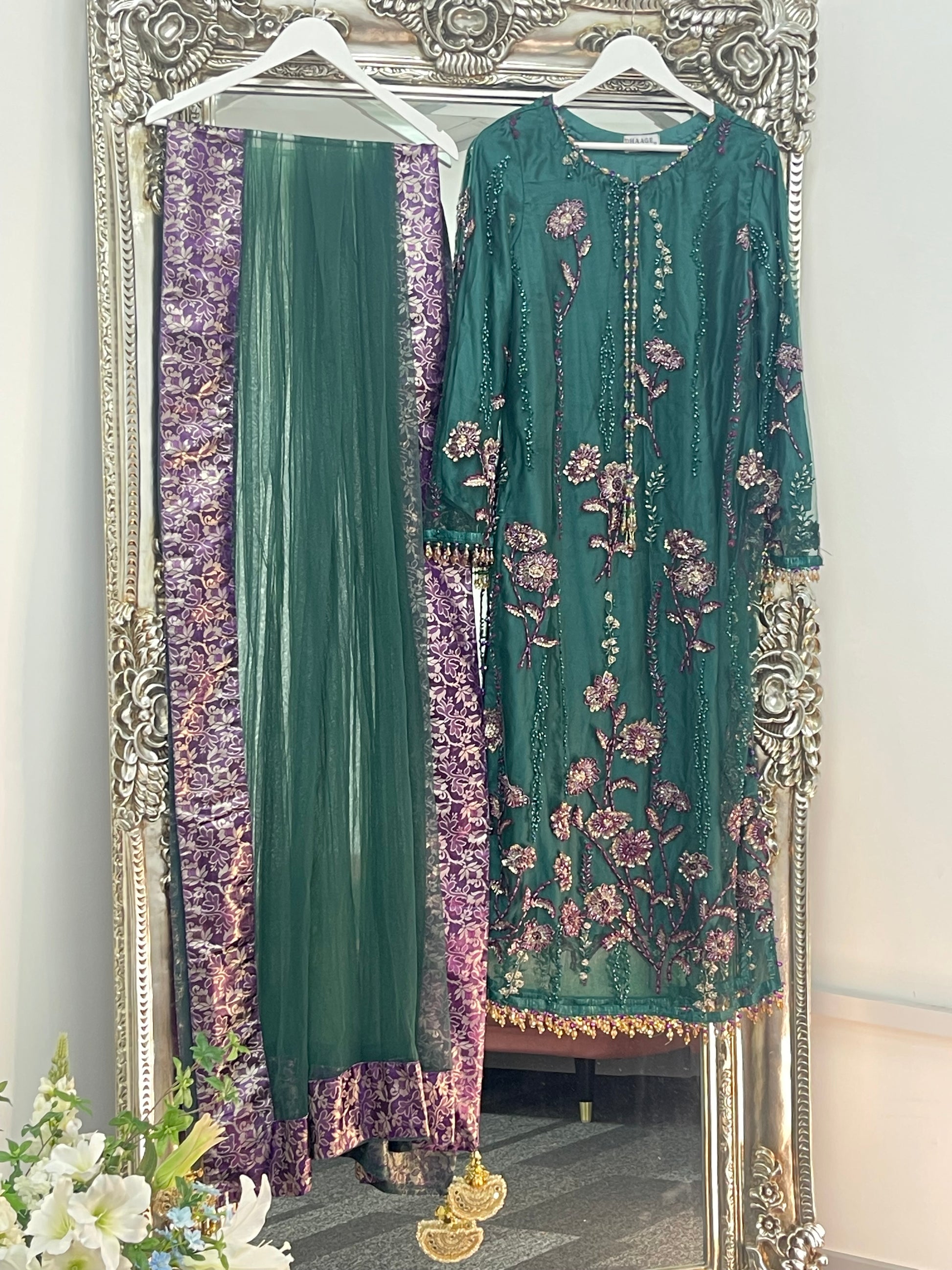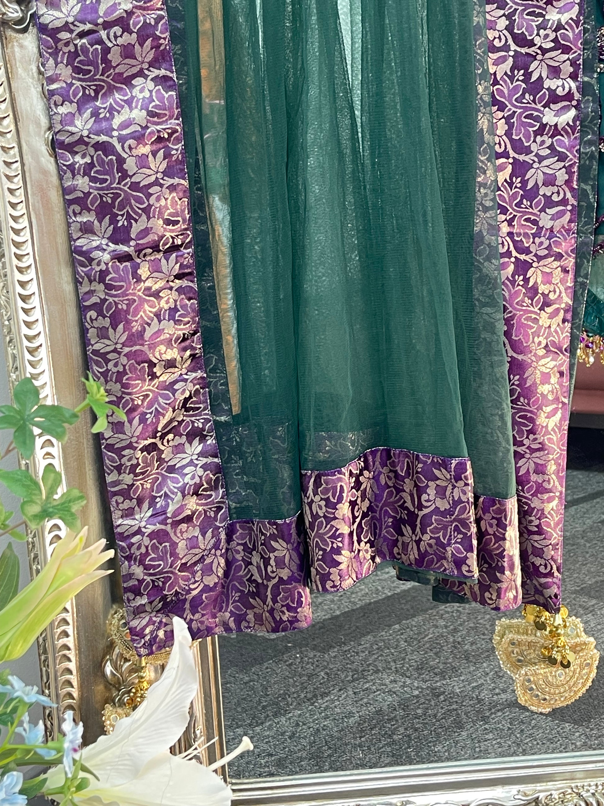 Completing the ensemble, a net dupatta with four sided jamawaar patchwork and delicate tassels flows beautifully.