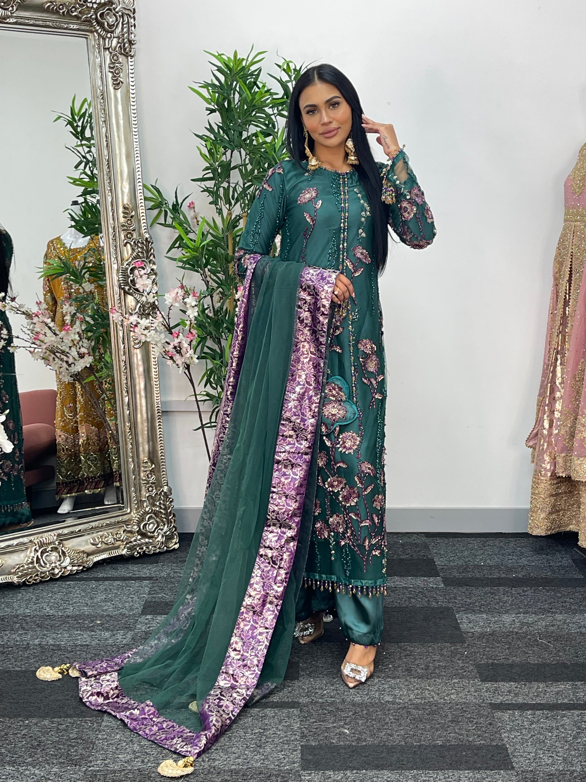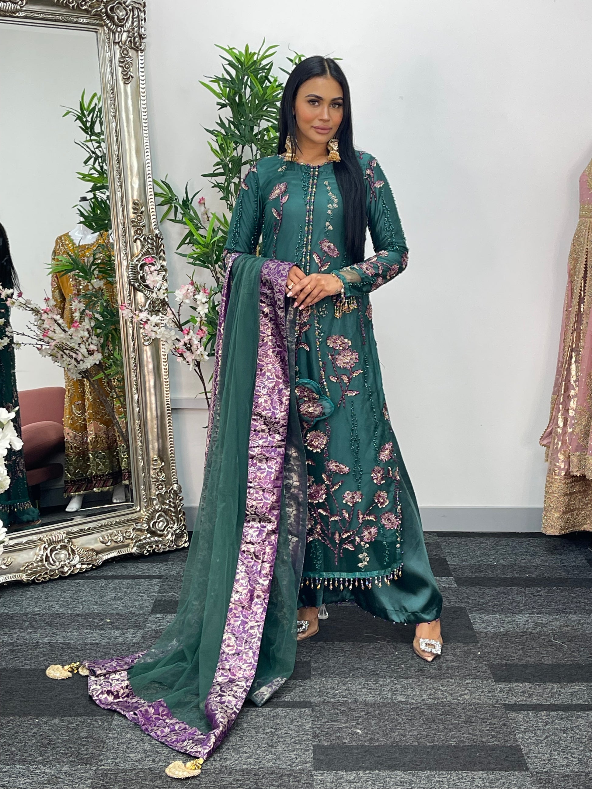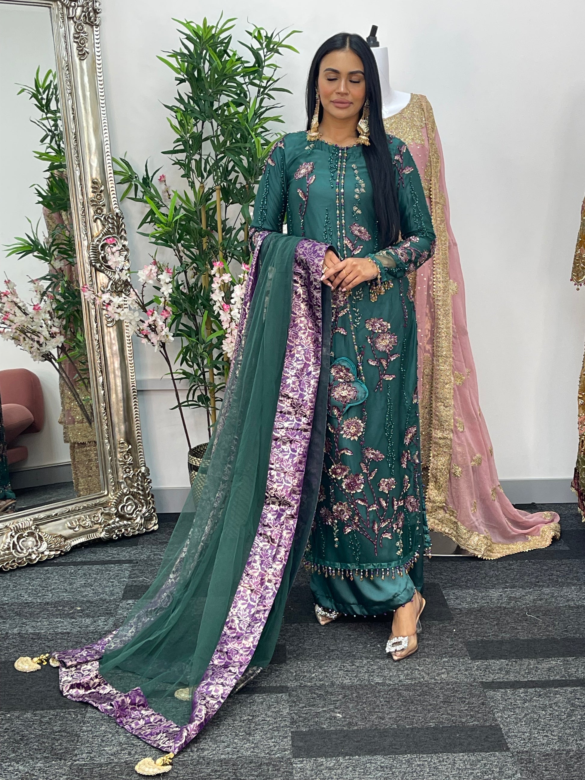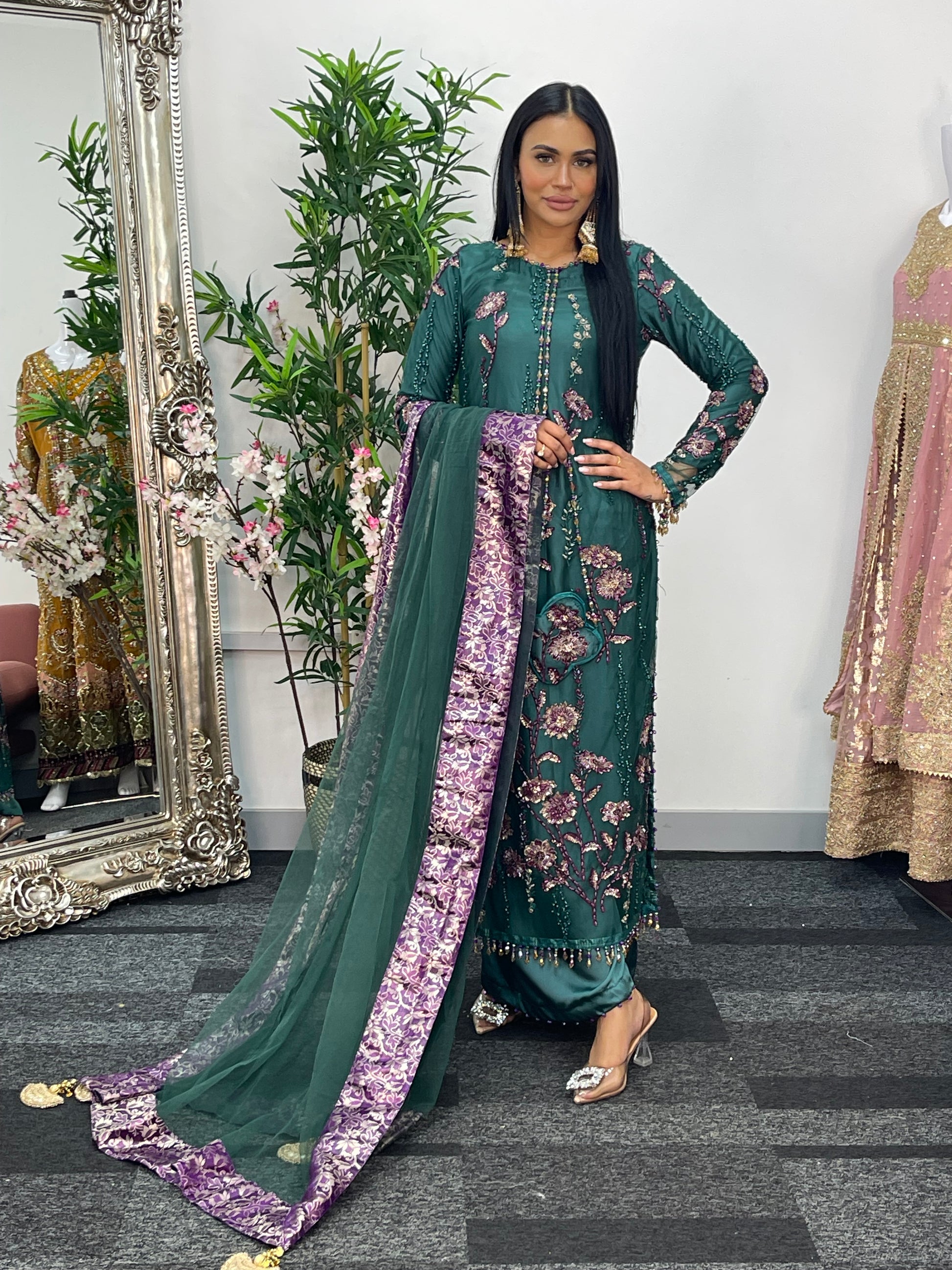Completing the ensemble, a net dupatta with four sided jamawaar patchwork and delicate tassels flows beautifully.