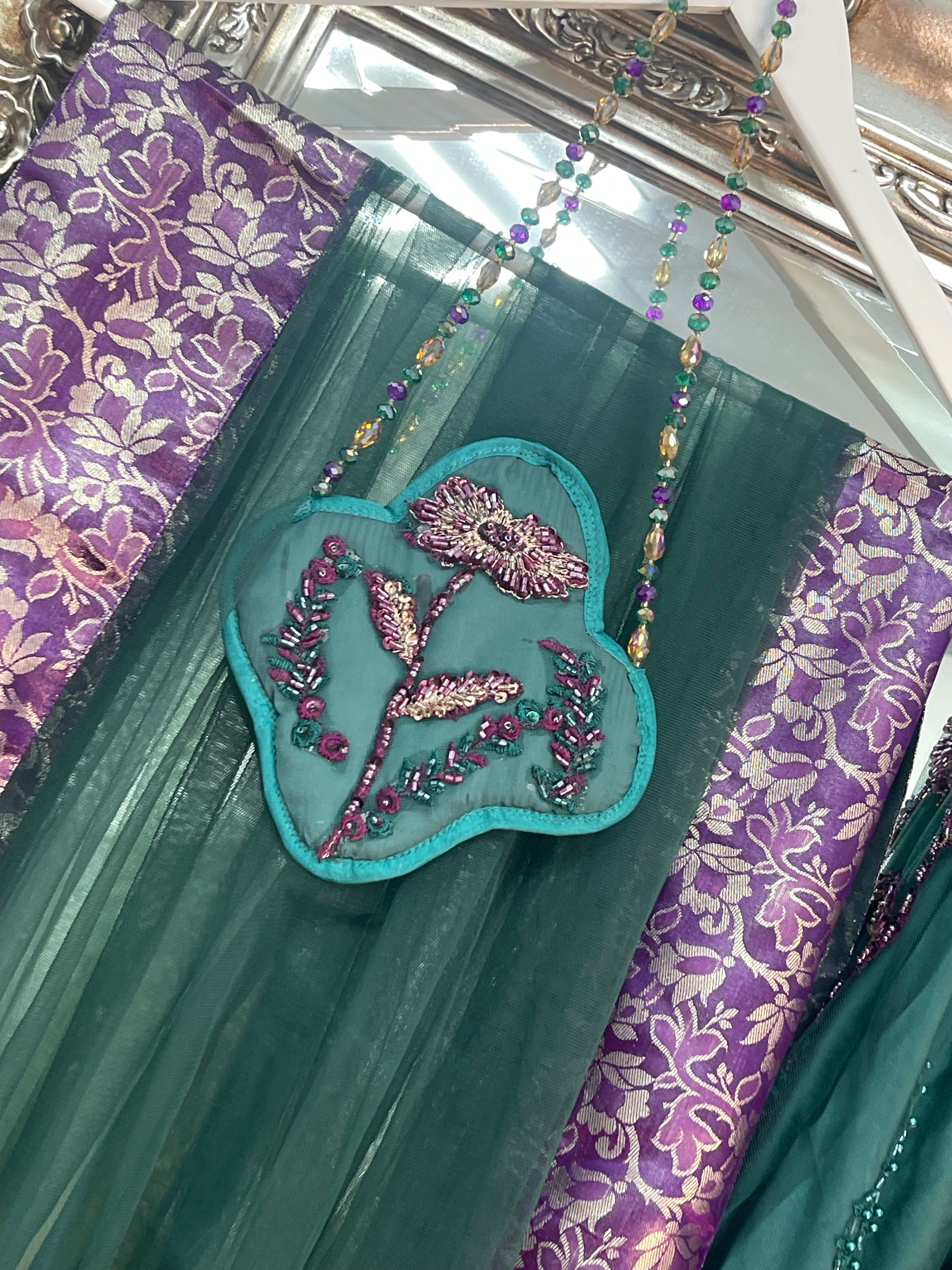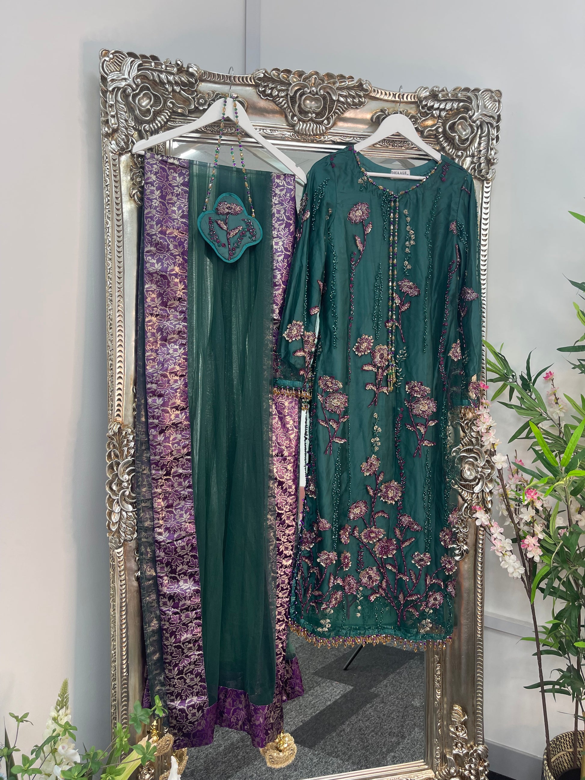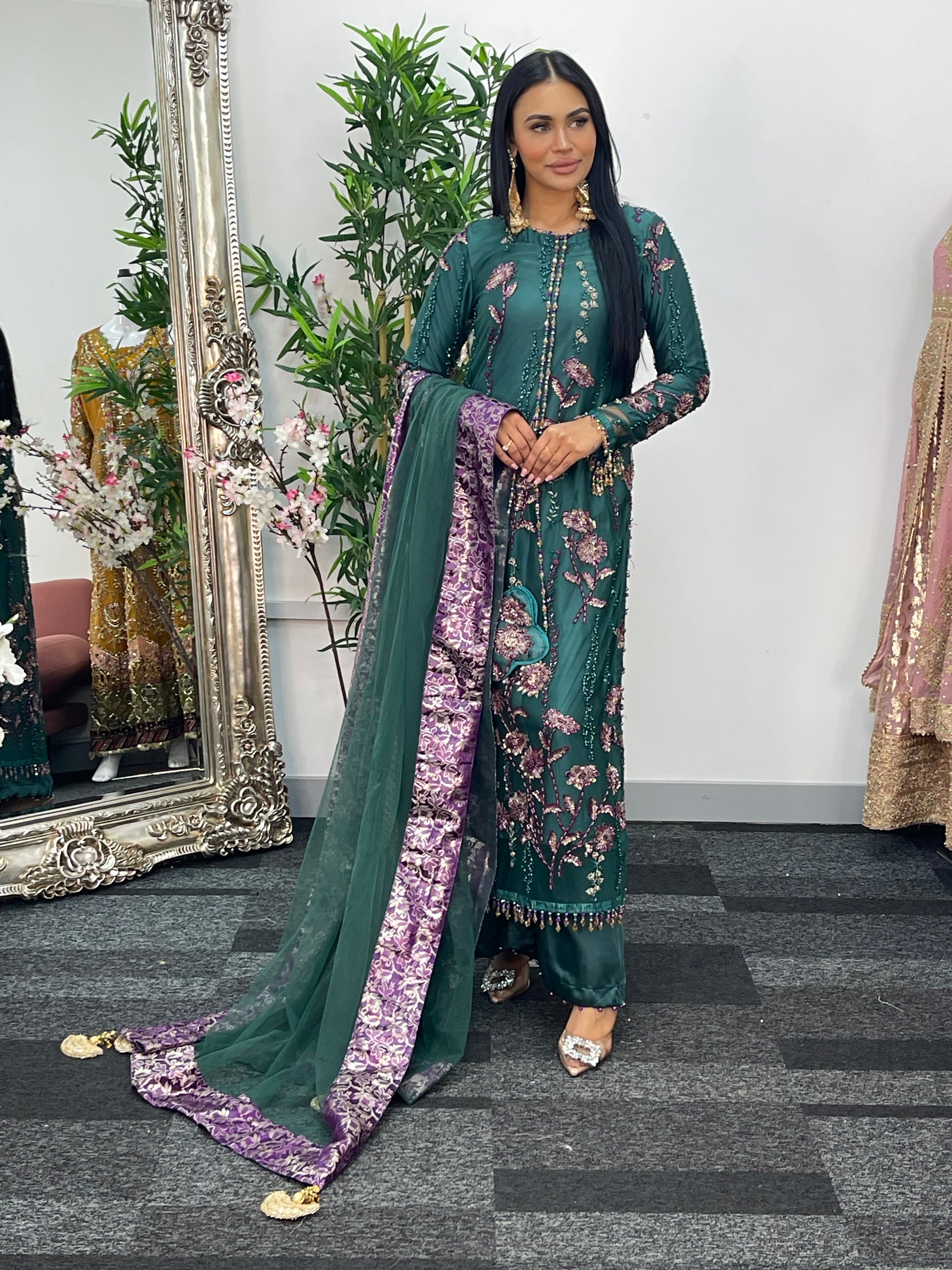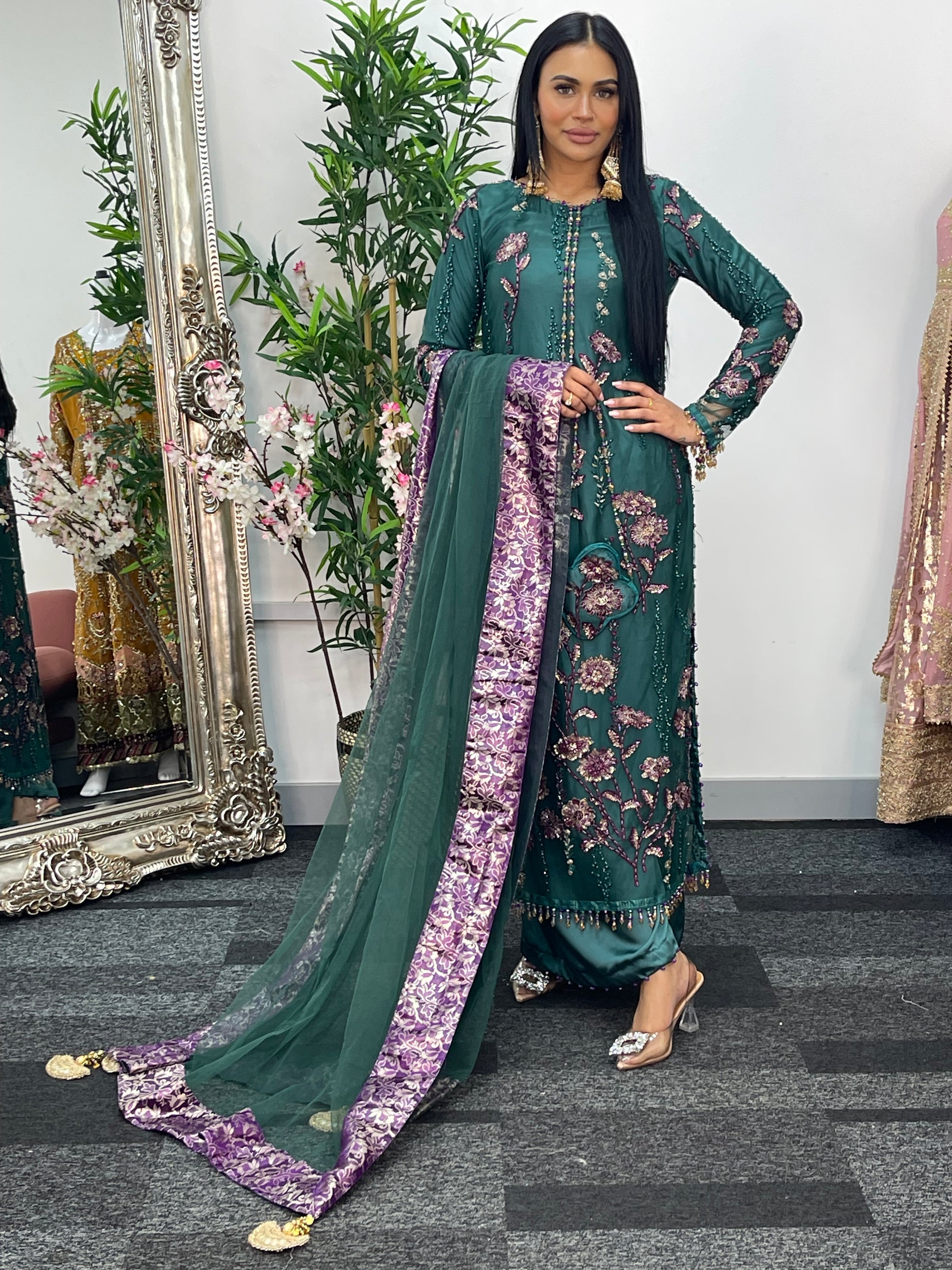 Completing the ensemble, a net dupatta with four sided jamawaar patchwork and delicate tassels flows beautifully.