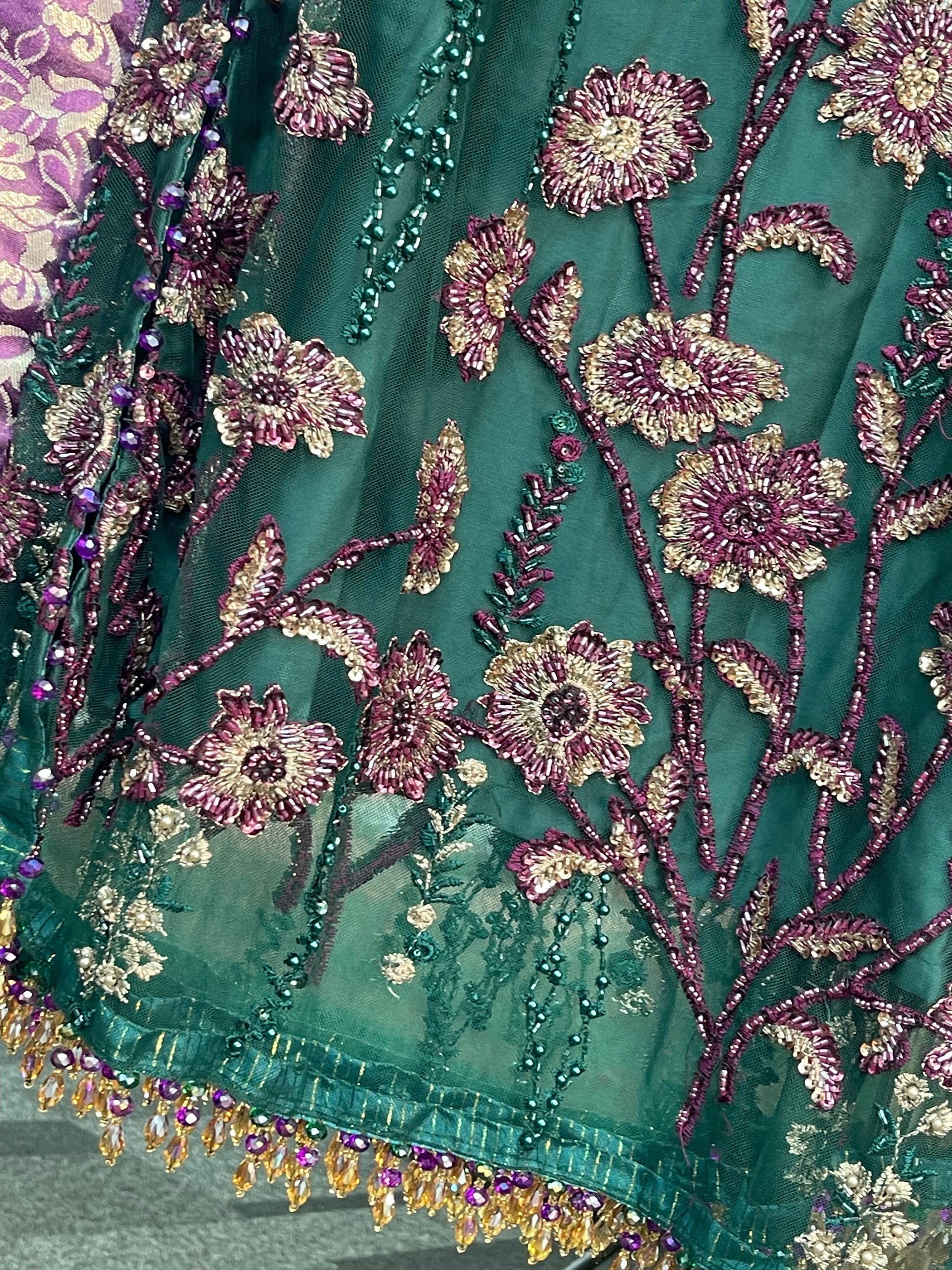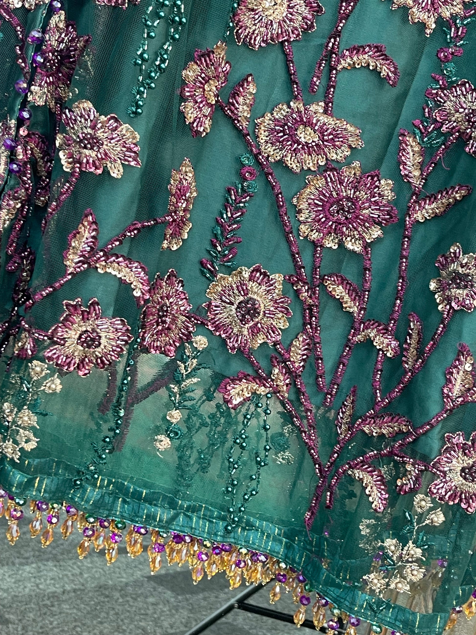 To enhance its allure, the garment showcases hanging tassels on both the front and back daman, creating a graceful silhouette.