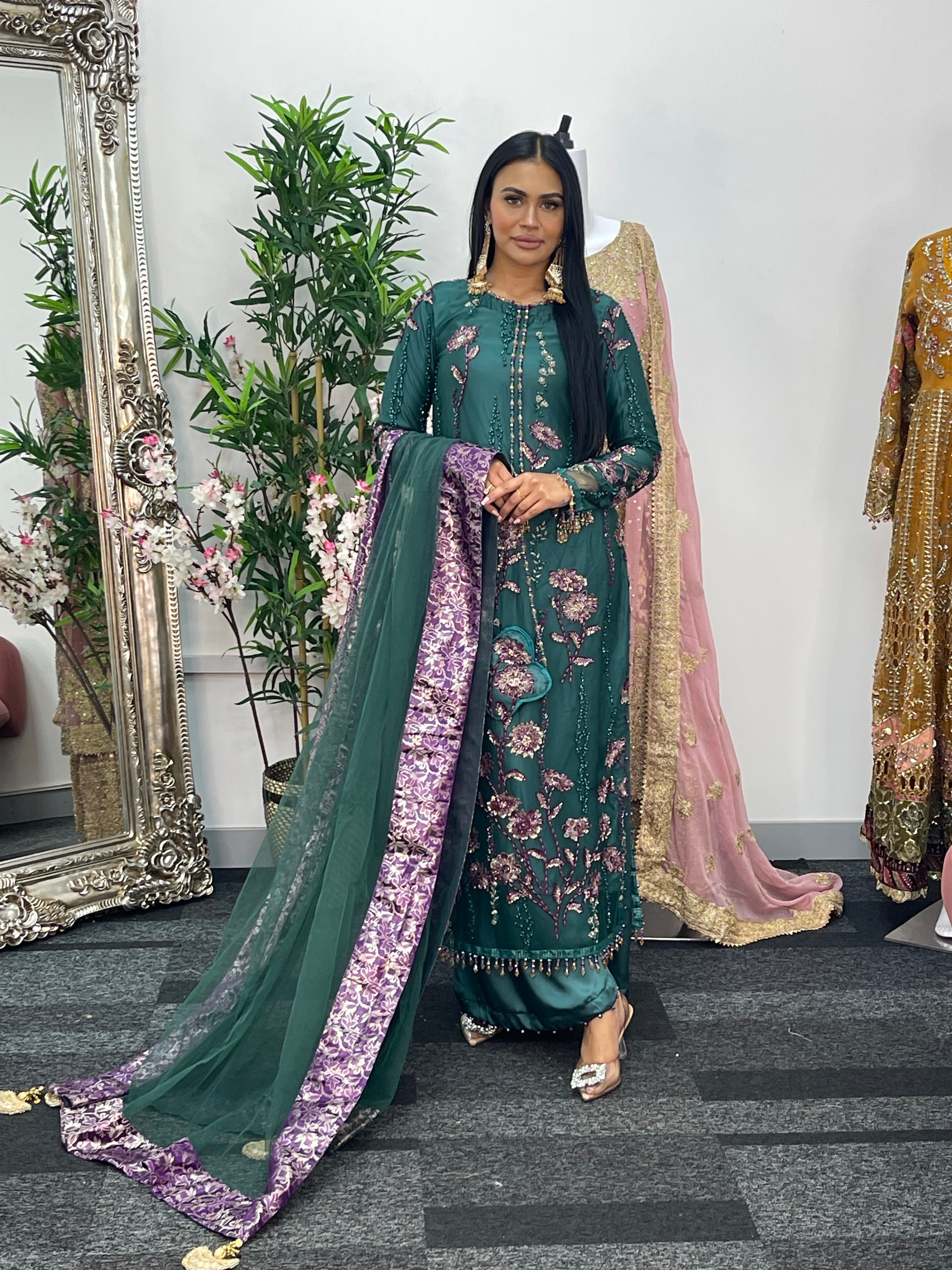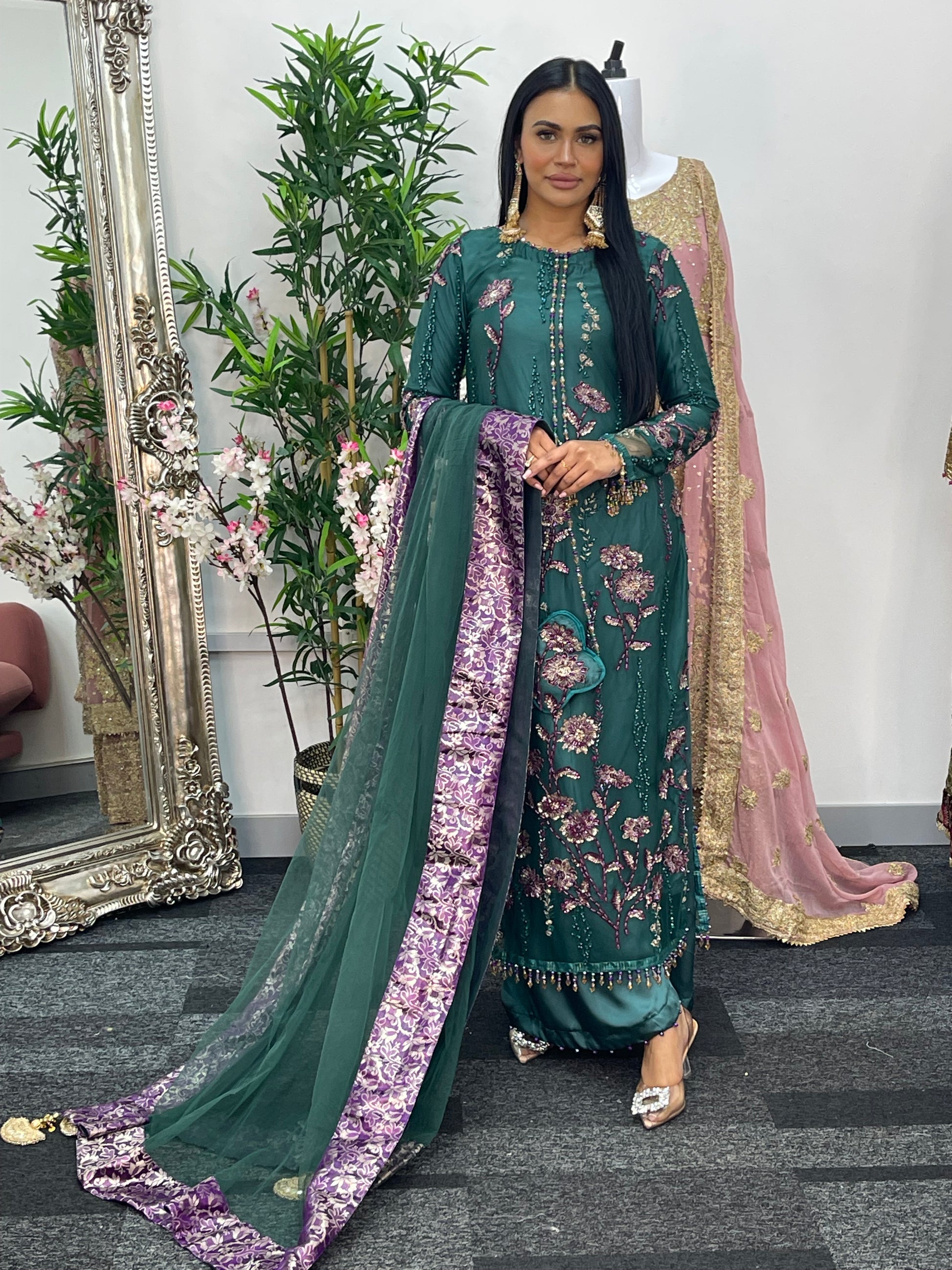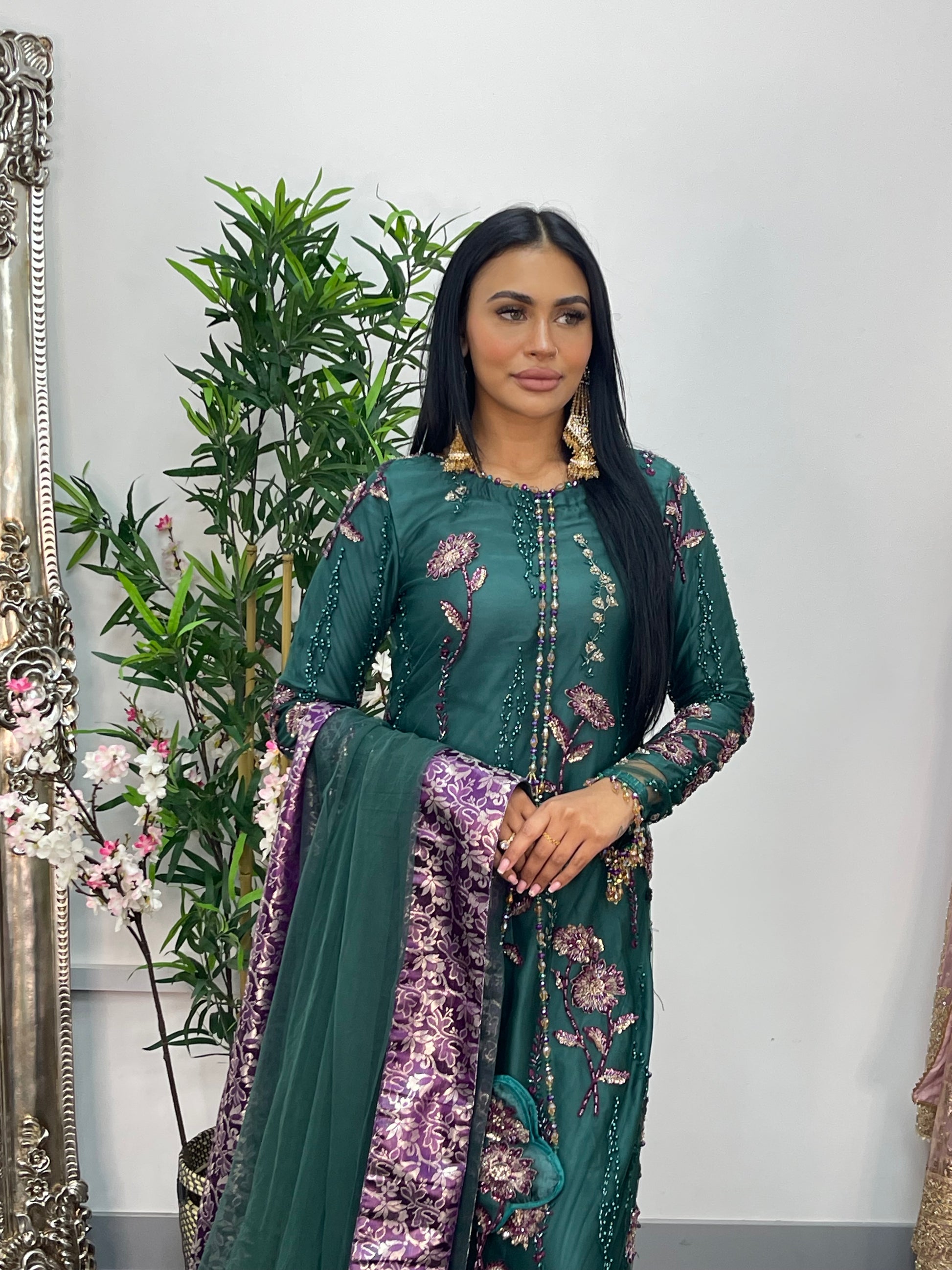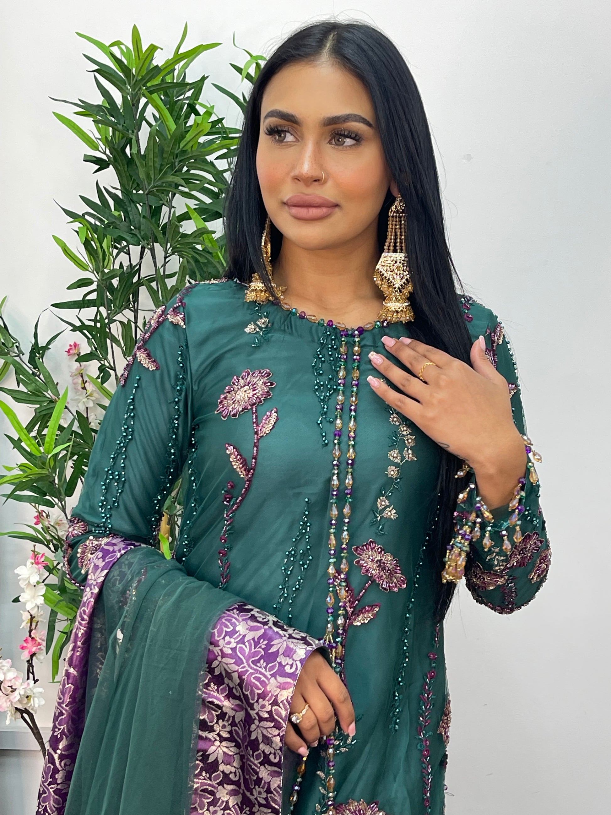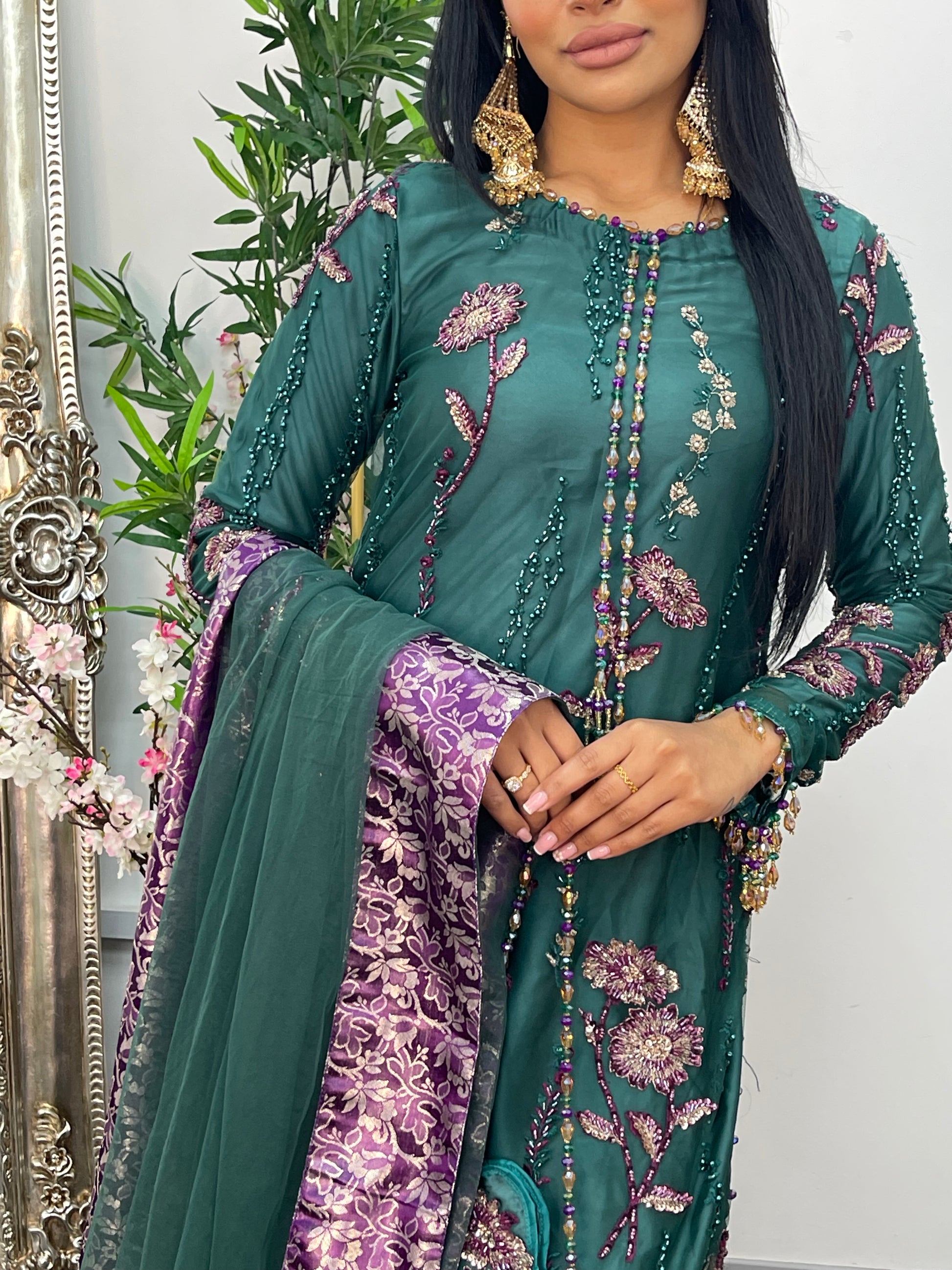 Accompanying the shirt, the plazo pants are designed with exquisite pearl, adding a touch of luxury.