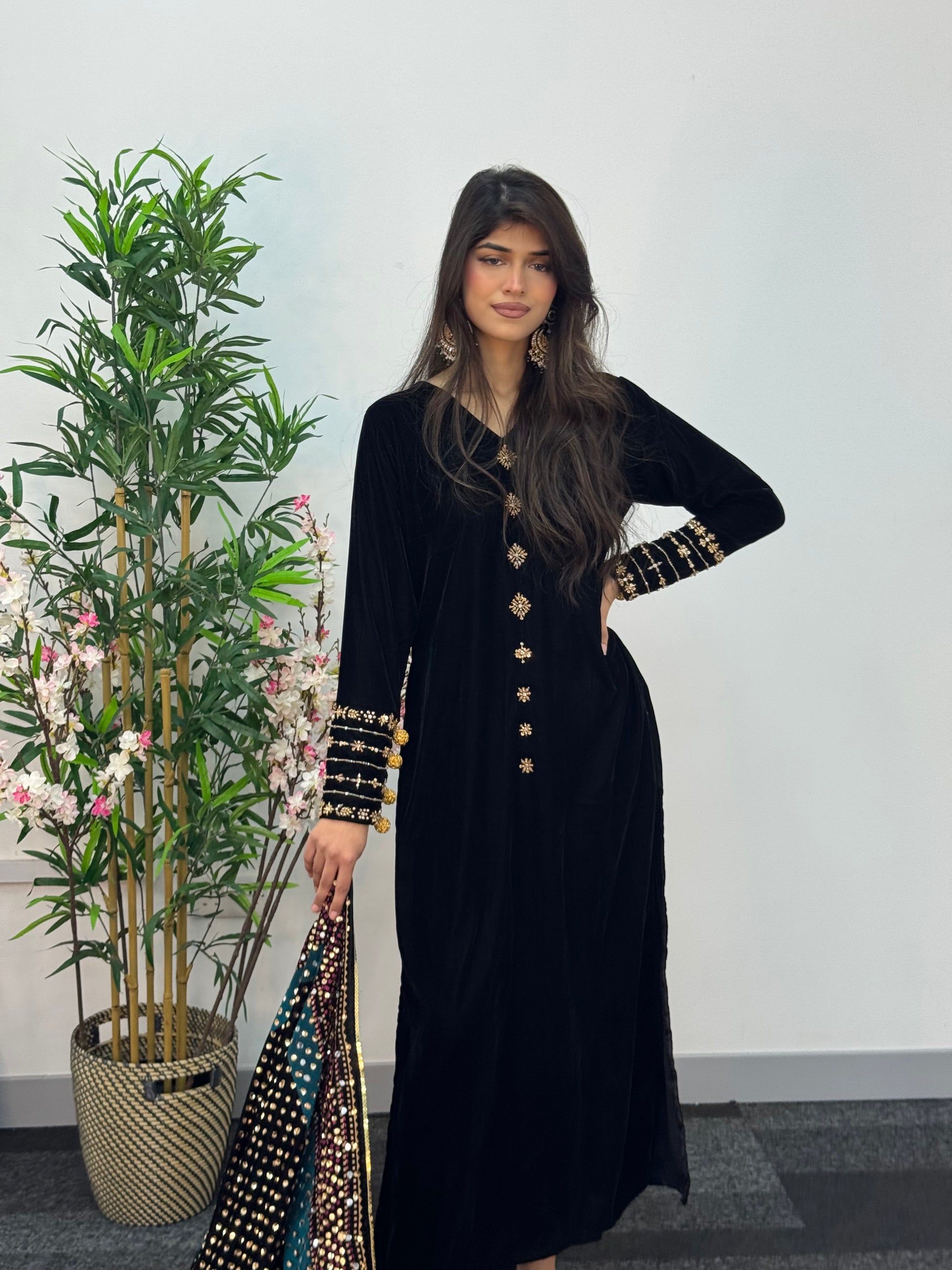 This stunning velvet ensemble features exquisite detailing, including delicate handwork along the neckline and beautifully designed sleeves adorned with hanging embellishments. The outfit is paired with straight trousers for a sleek and flattering look.