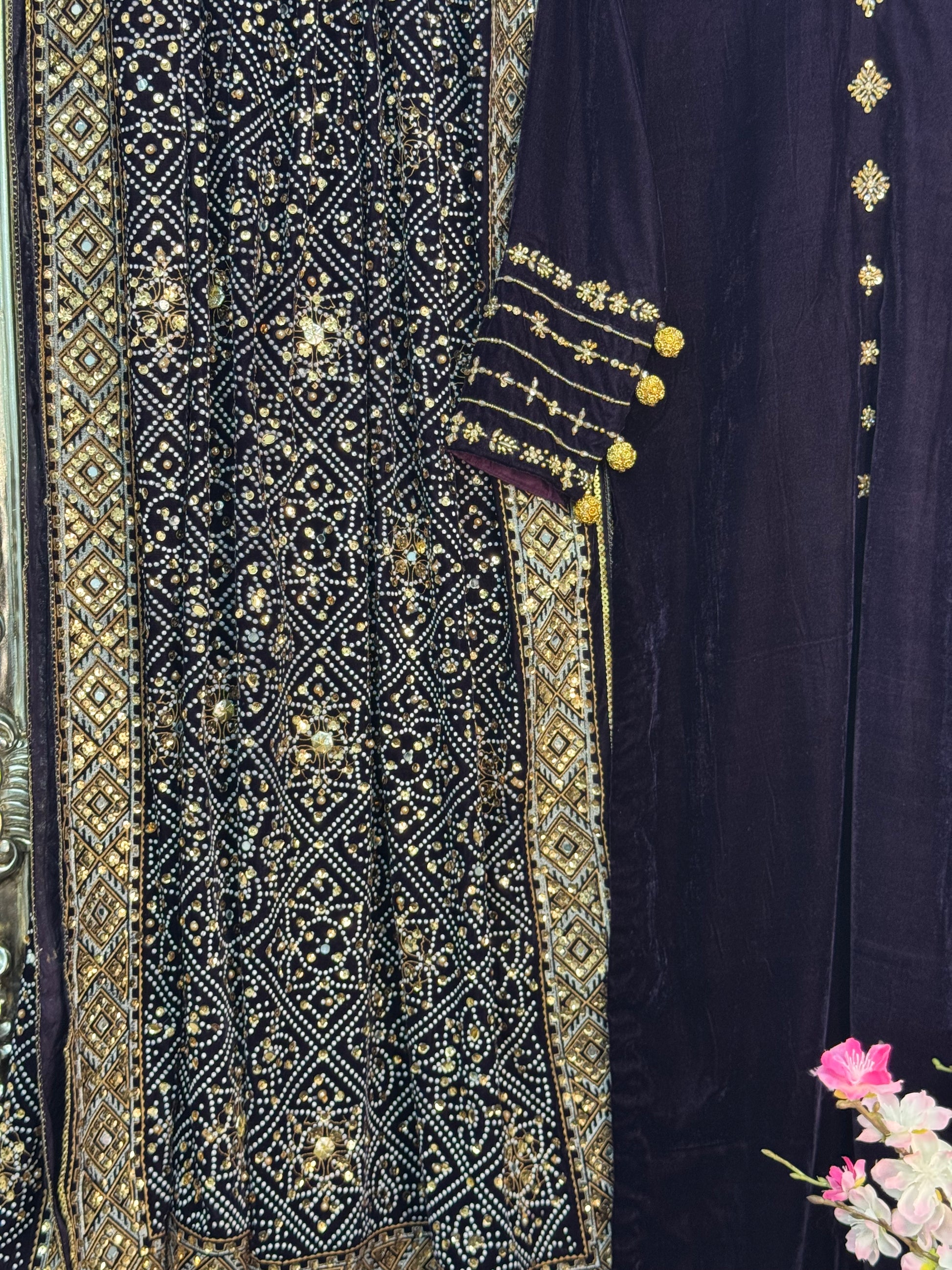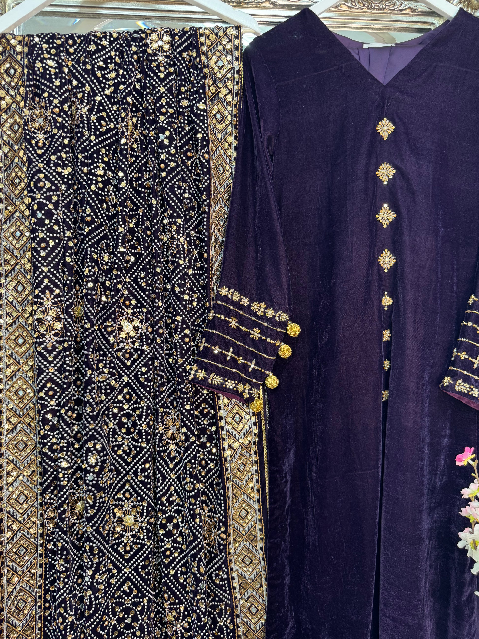 This stunning velvet ensemble features exquisite detailing, including delicate handwork along the neckline and beautifully designed sleeves adorned with hanging embellishments. The outfit is paired with straight trousers for a sleek and flattering look.