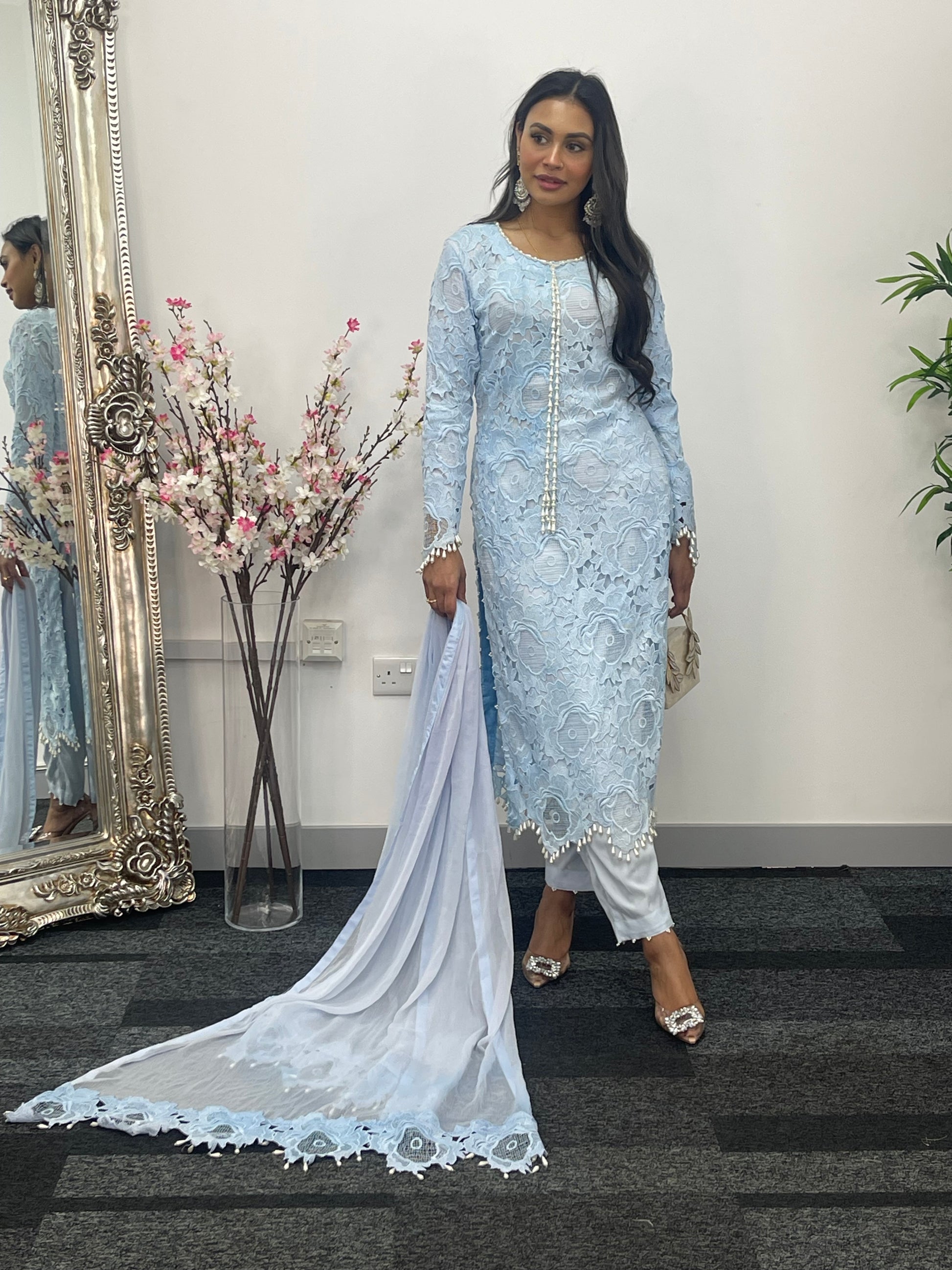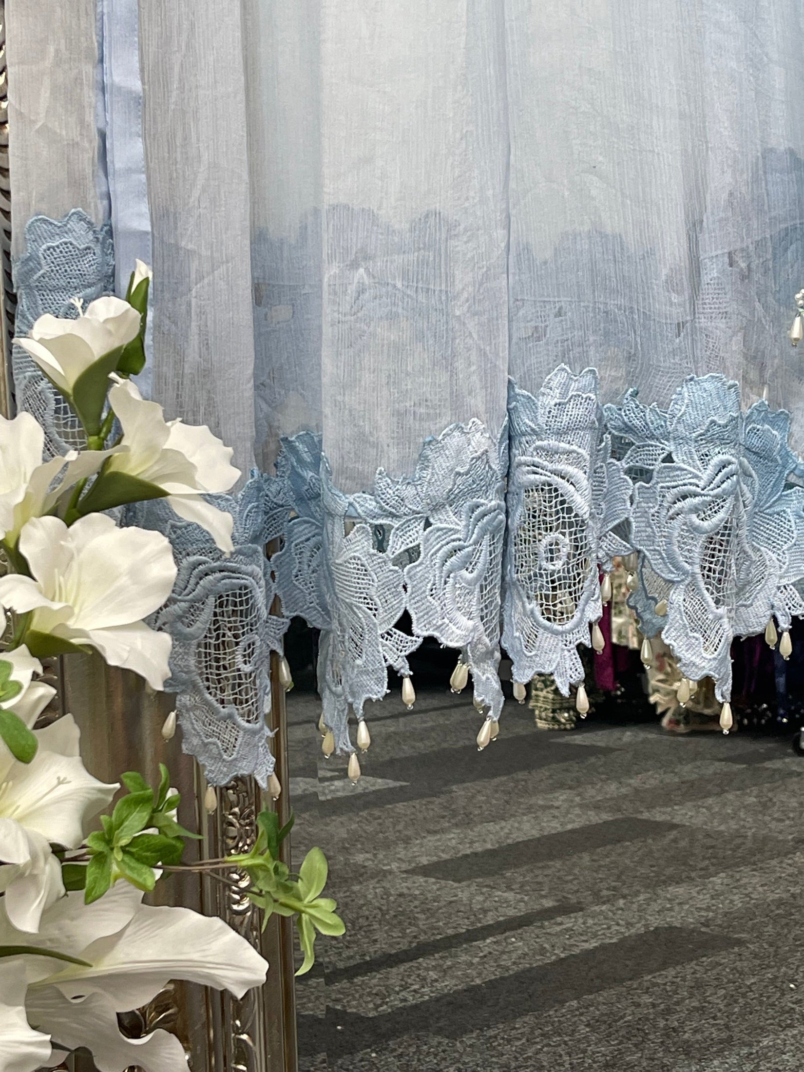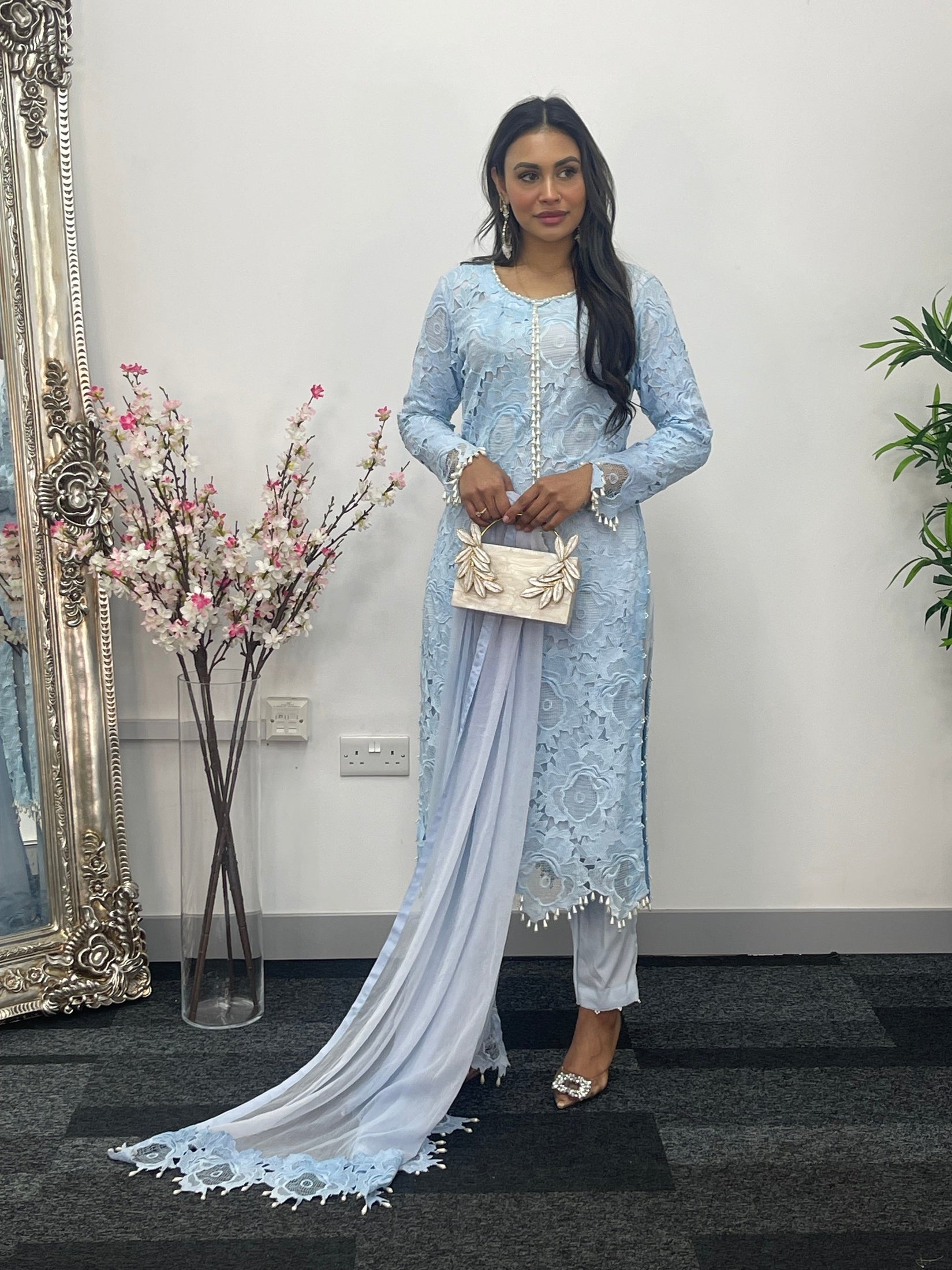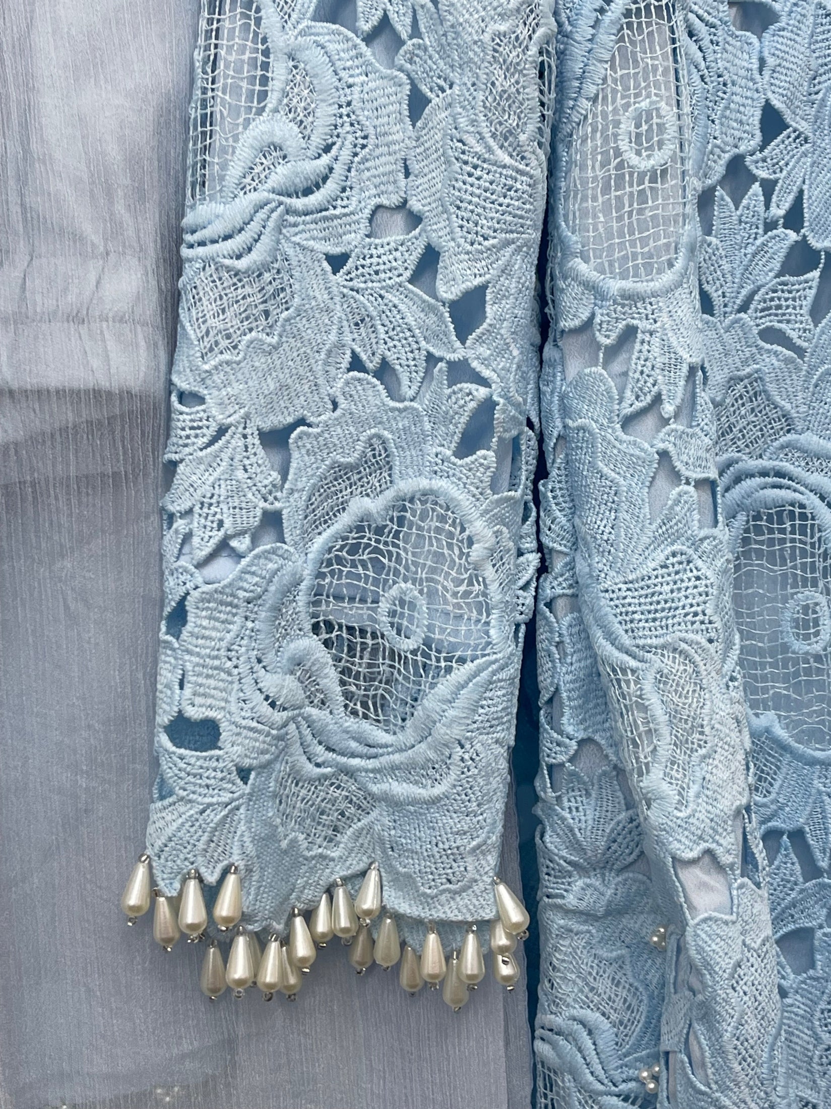 • Chiffon dupatta with cutwork crochet pallu patch and crystal hanging on pallus