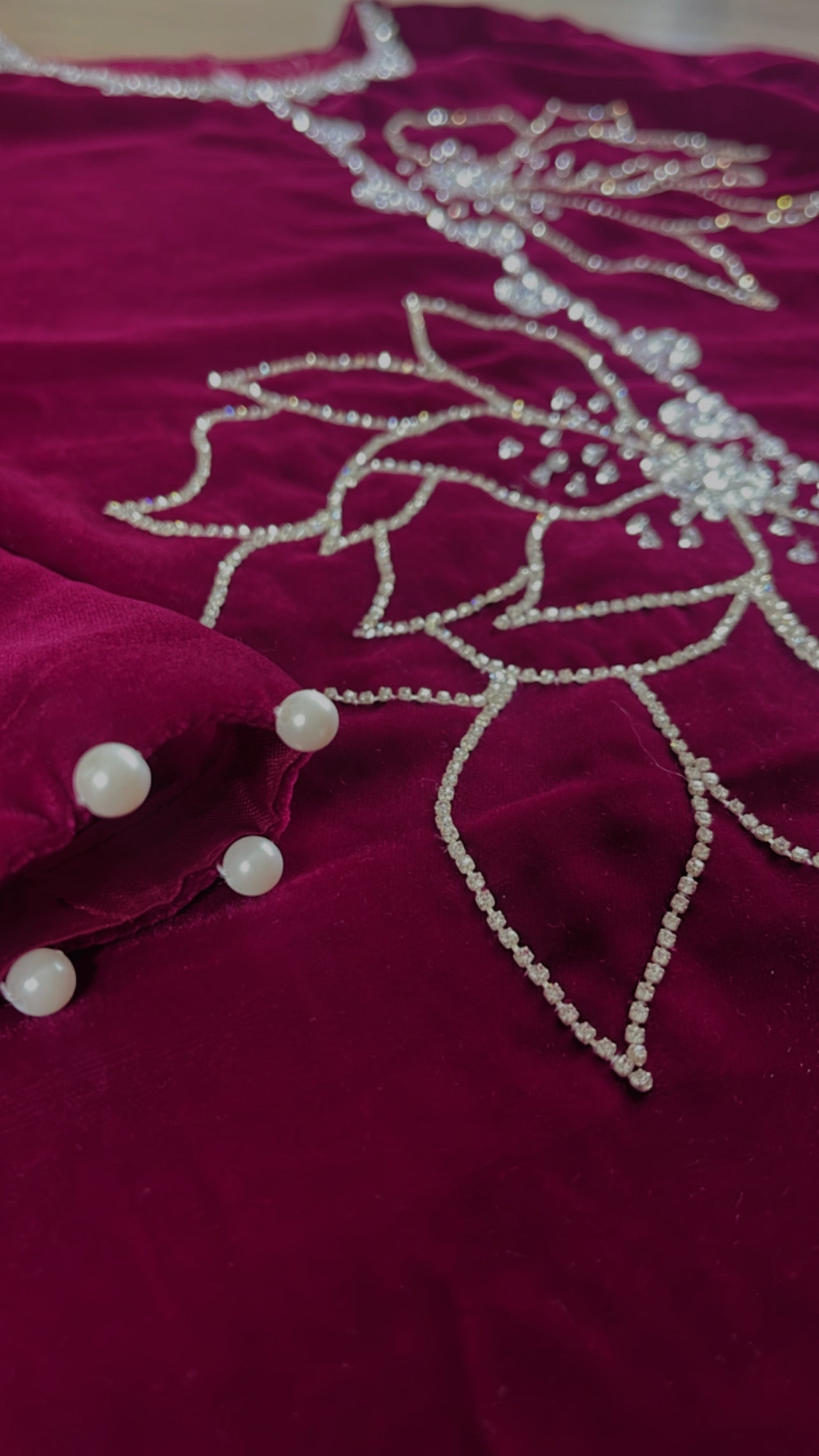 Elevate your wardrobe with our stunning Magenta Pink Velvet Ensemble! Inspired by the exquisite beauty of Lulusar, this piece is a perfect blend of elegance and artistry.