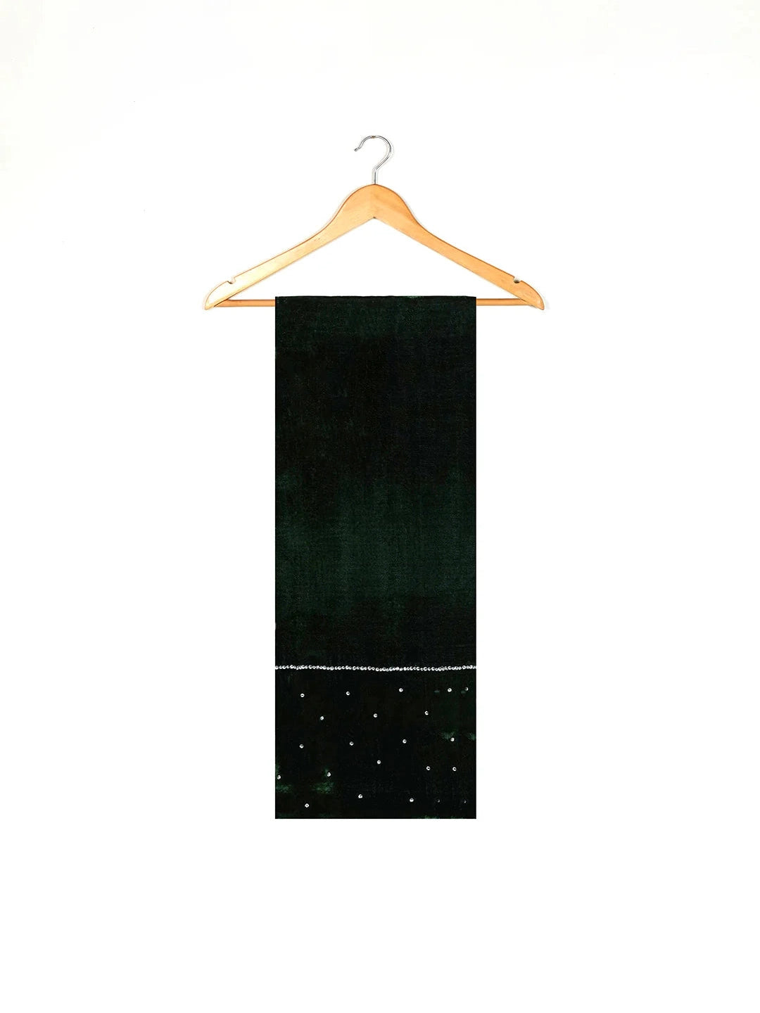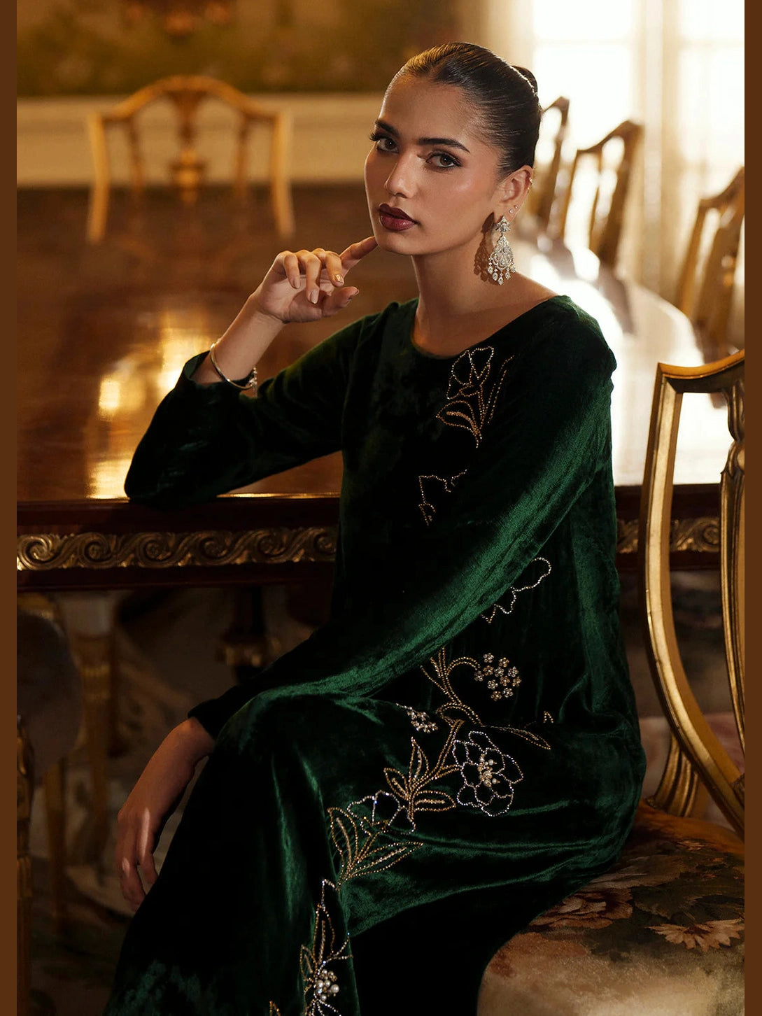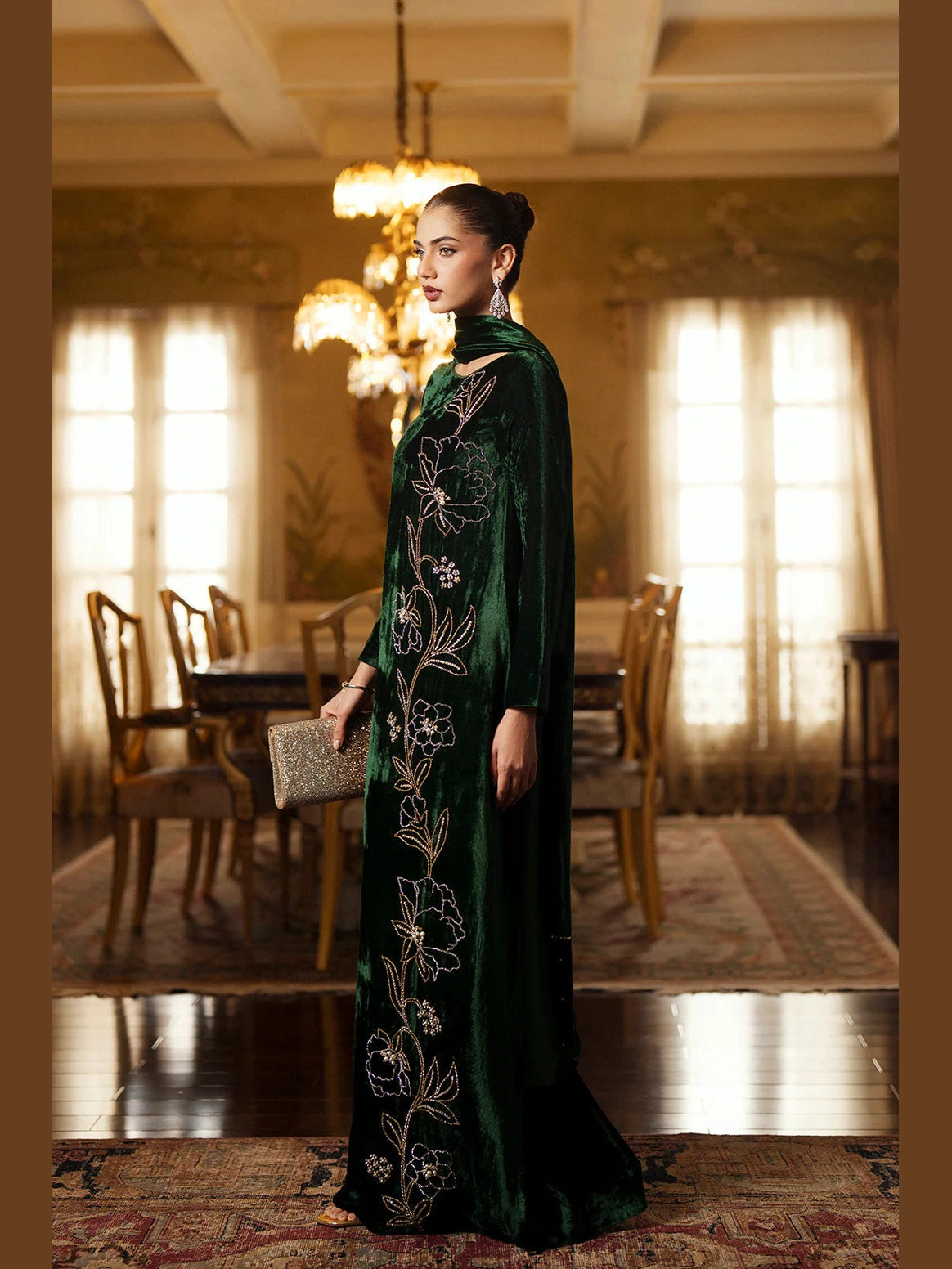 • This bottle green velvet dress is not one to miss, with crystal embellished florals running down its length, this is a perfect addition to your closet, comes with "Azun Stole" to complete the look.