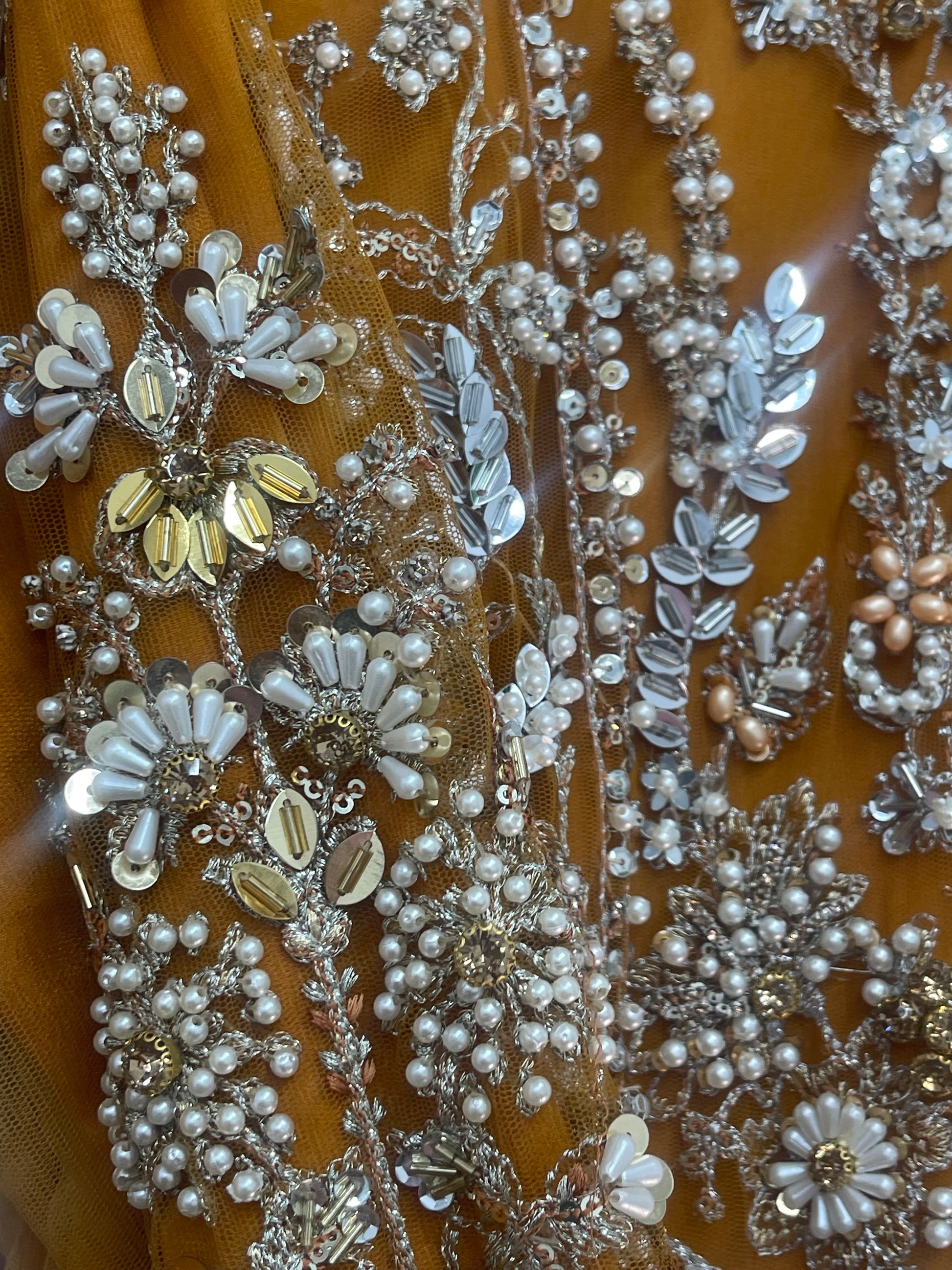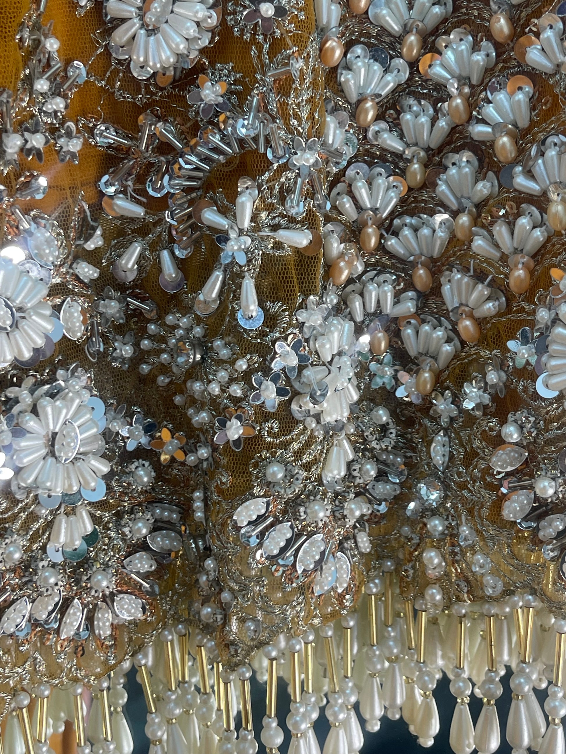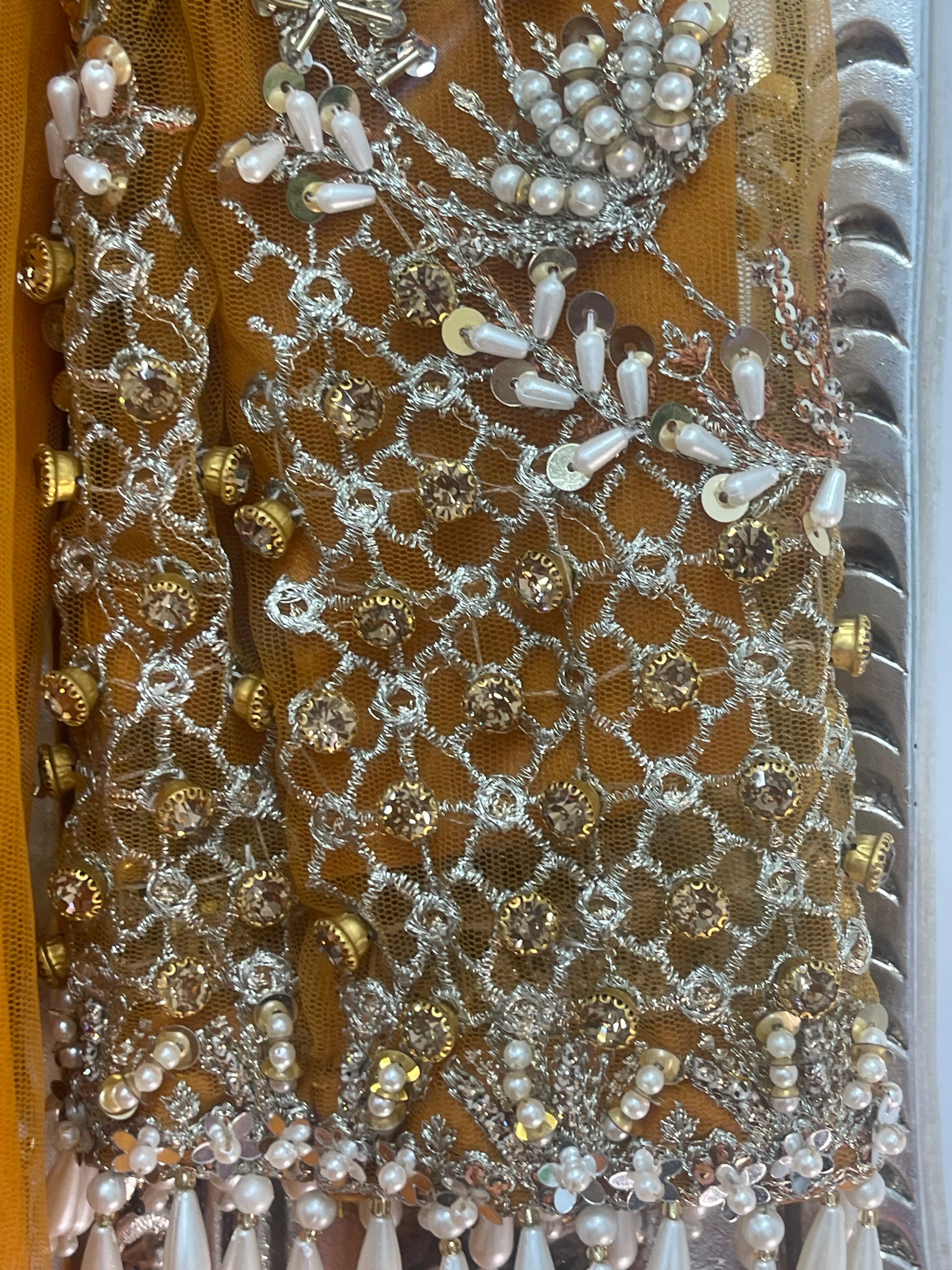 Discover a stunning outfit featuring heavy adda work across the front, back, and sleeves. The exquisite embroidery includes pearls, naqshi stones, delicate dismontés, sequins, sitaray, aansu moti, boat sitara, flat sitara, zardozi, and kundan accents, creating a rich and opulent look. The craftsmanship is further enhanced with detailed pearl embellishments on the front, back, daman, and sleeves.