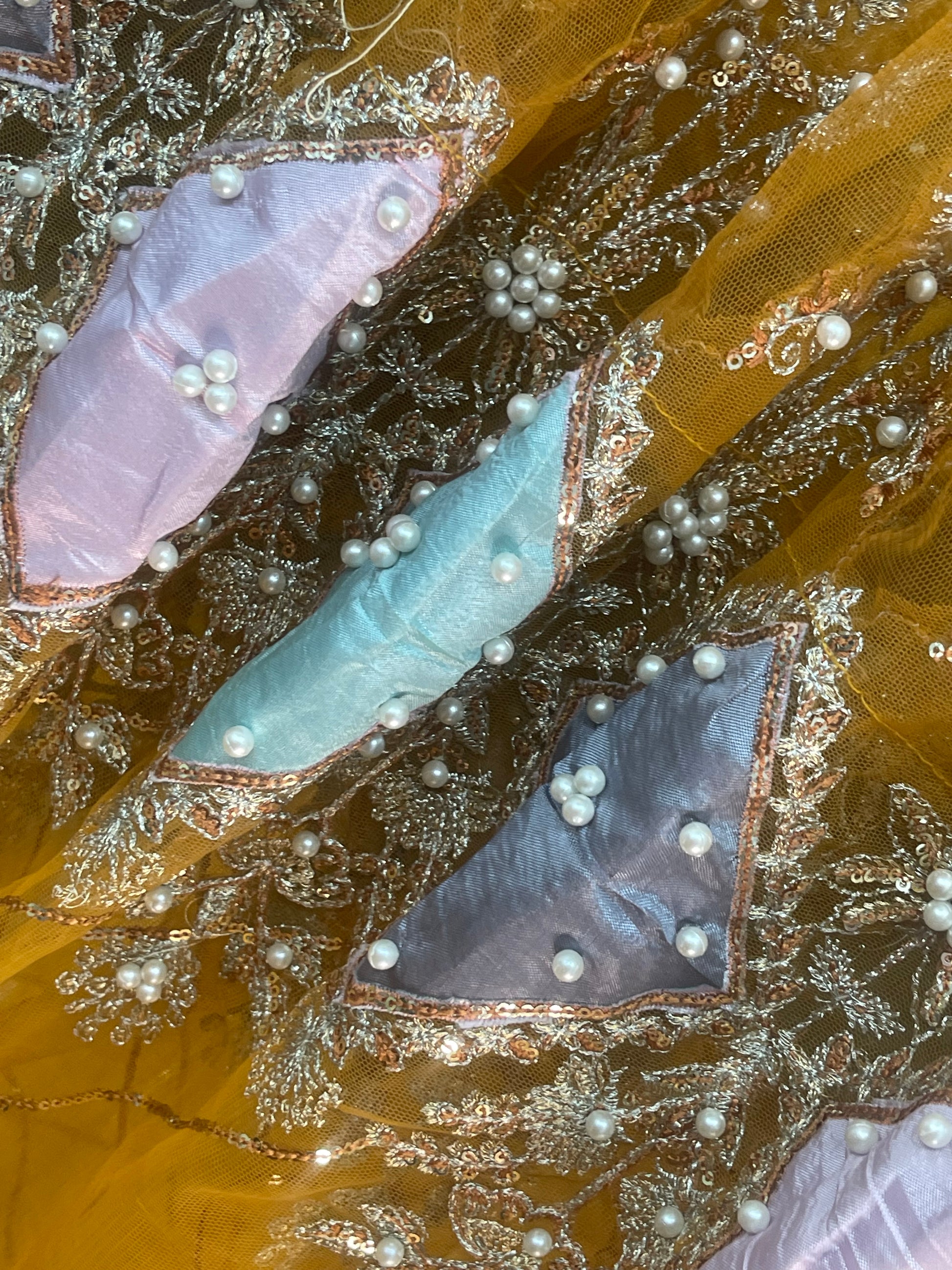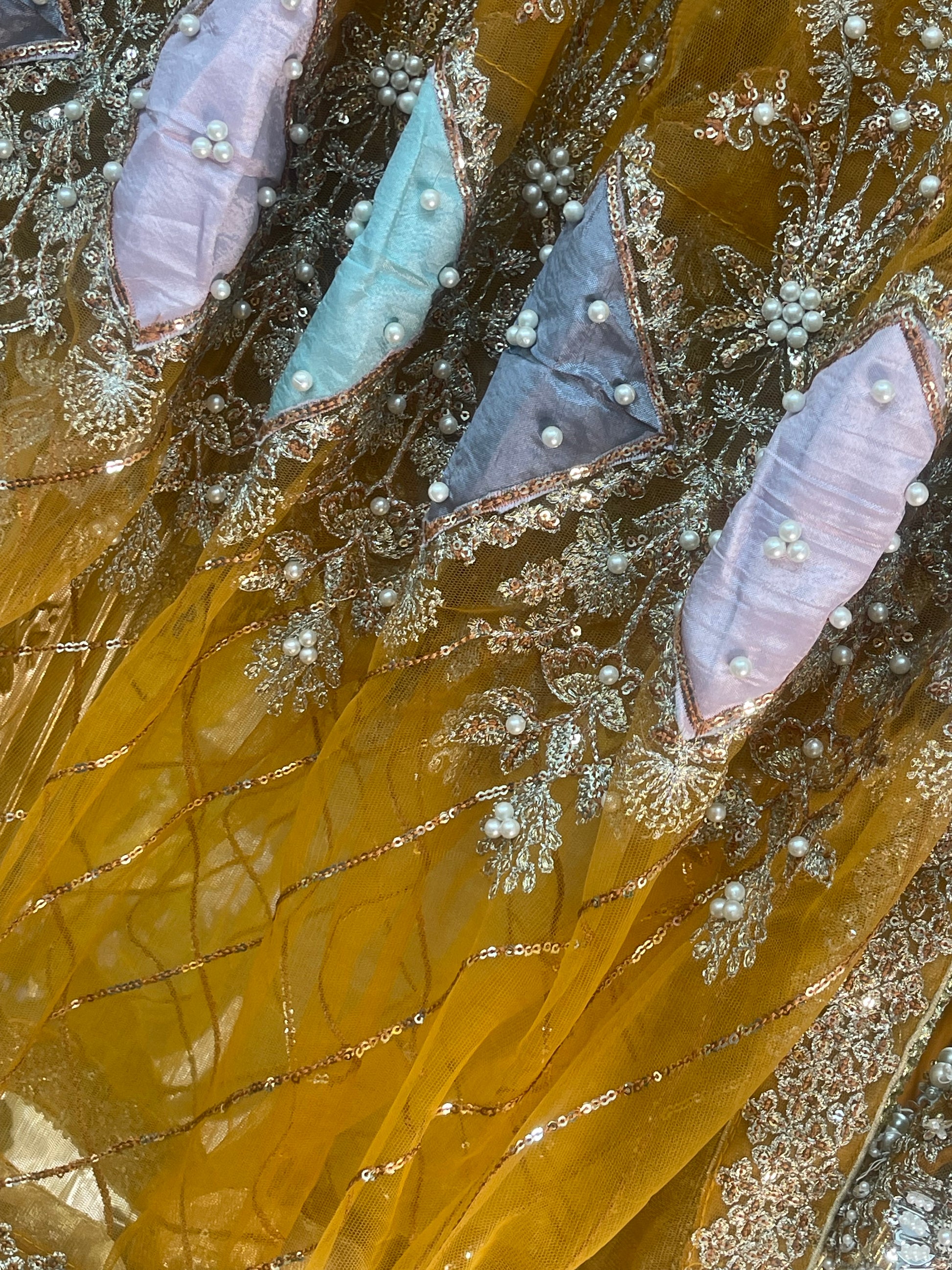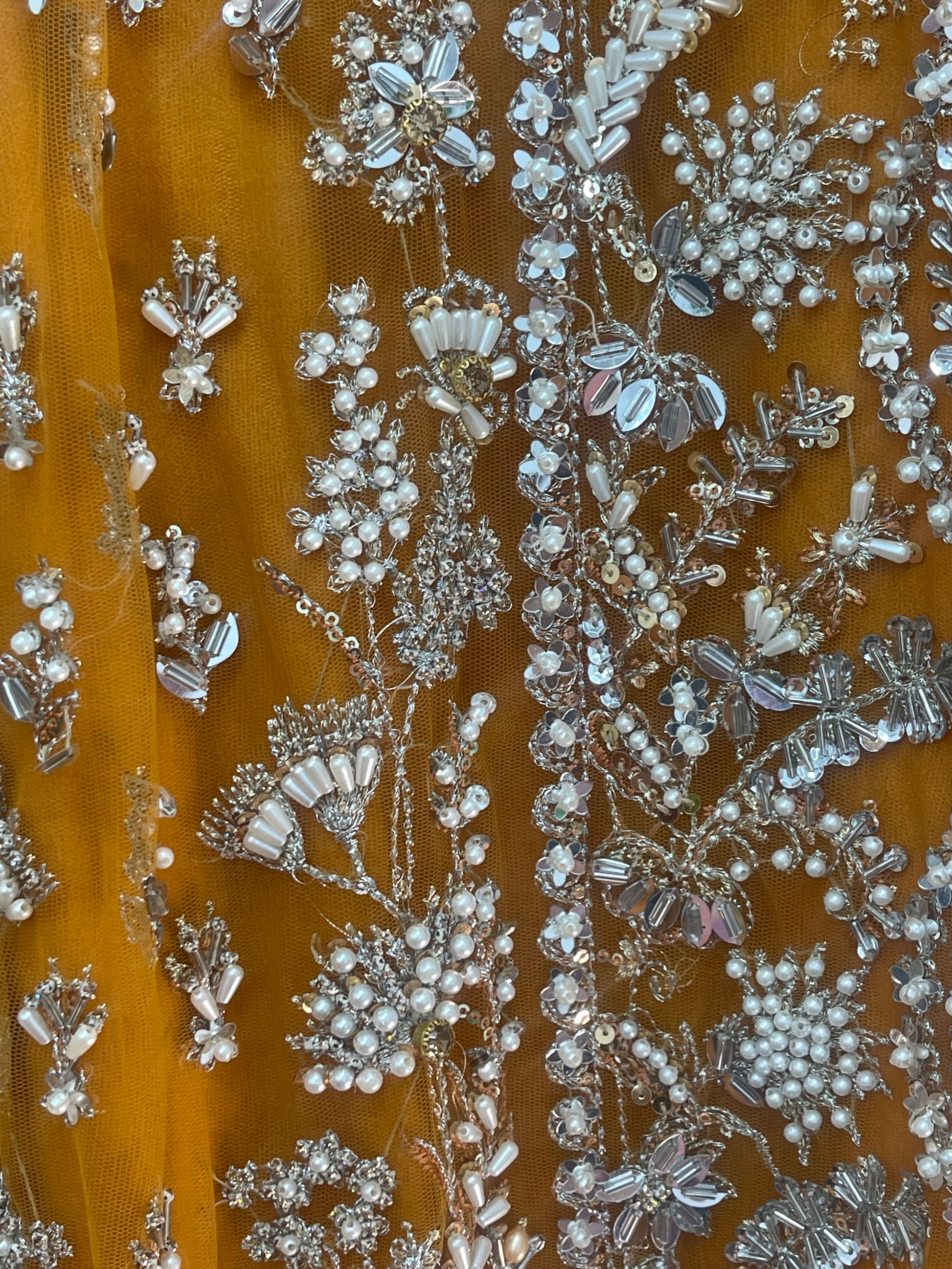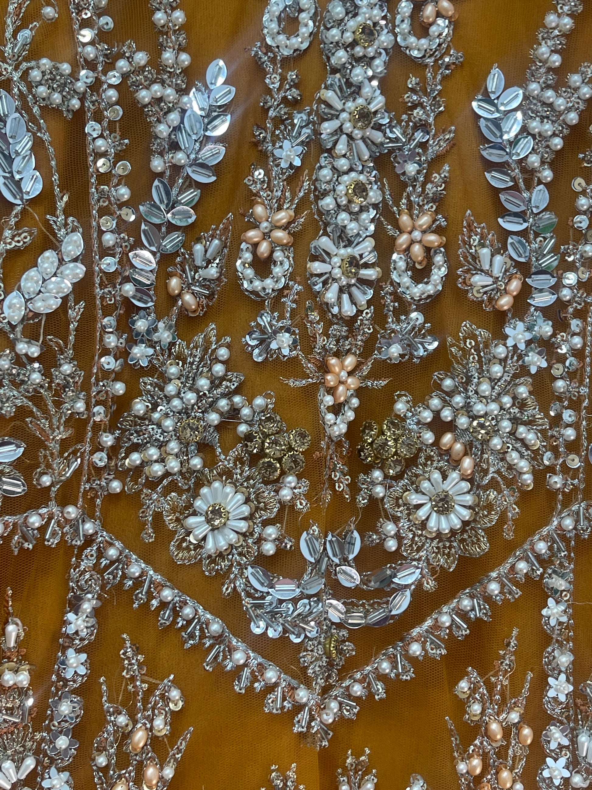 Discover a stunning outfit featuring heavy adda work across the front, back, and sleeves. The exquisite embroidery includes pearls, naqshi stones, delicate dismontés, sequins, sitaray, aansu moti, boat sitara, flat sitara, zardozi, and kundan accents, creating a rich and opulent look. The craftsmanship is further enhanced with detailed pearl embellishments on the front, back, daman, and sleeves.