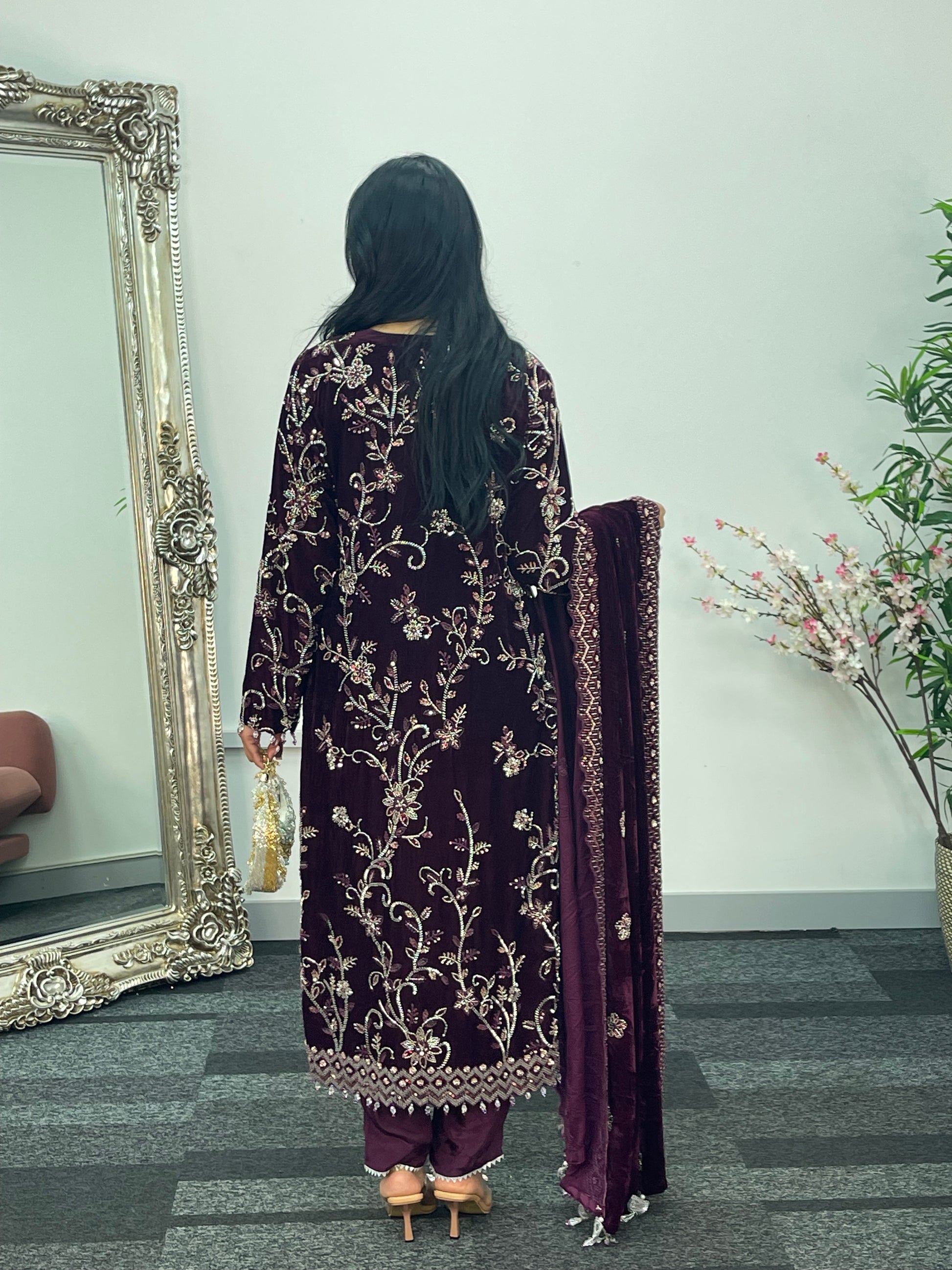 “Makhmal” Plum Velvet Cutdana - Party Wedding Outfit - AA
