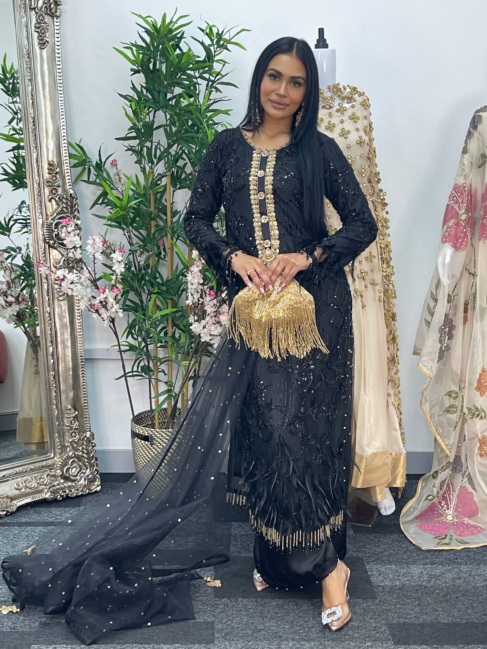 Experience timeless elegance with the Mala Cutdana Net in Black, a traditional Pakistani dress crafted with intricate cutdana embroidery on delicate net fabric. This piece combines classic craftsmanship with a modern silhouette, offering a graceful fit that enhances your presence for special occasions. The black shade adds versatility, making it suitable for both day and evening wear while providing a sophisticated, refined look. Ideal for those who appreciate detailed handiwork and authentic cultural attire.
