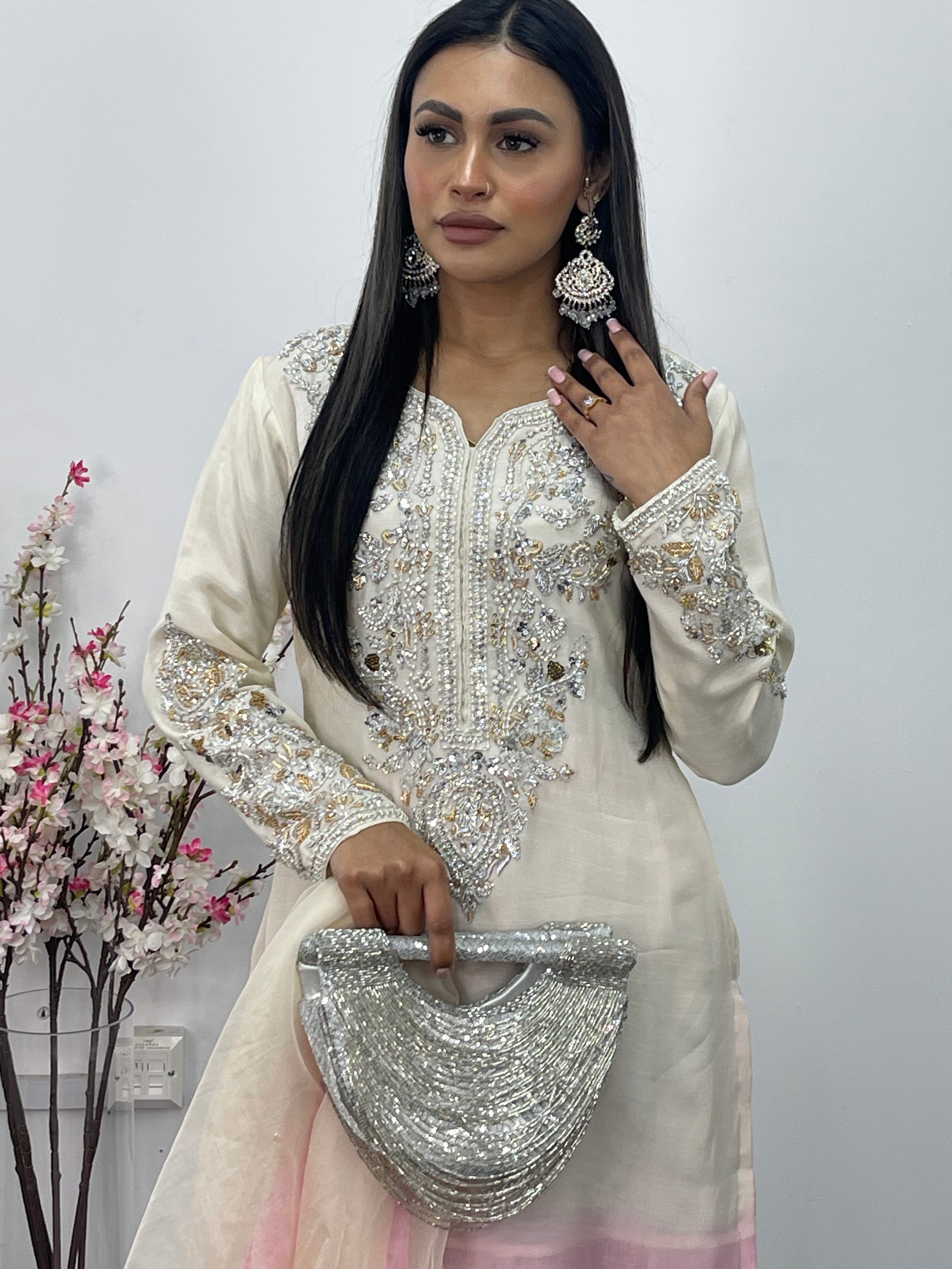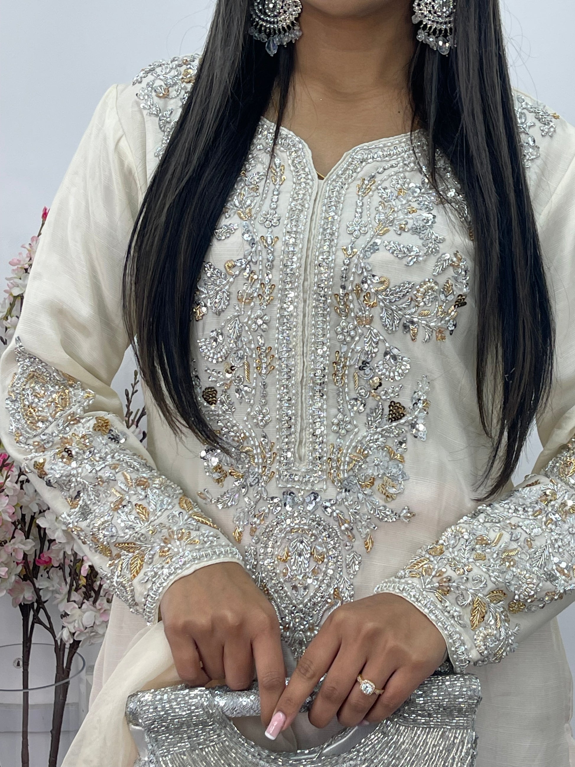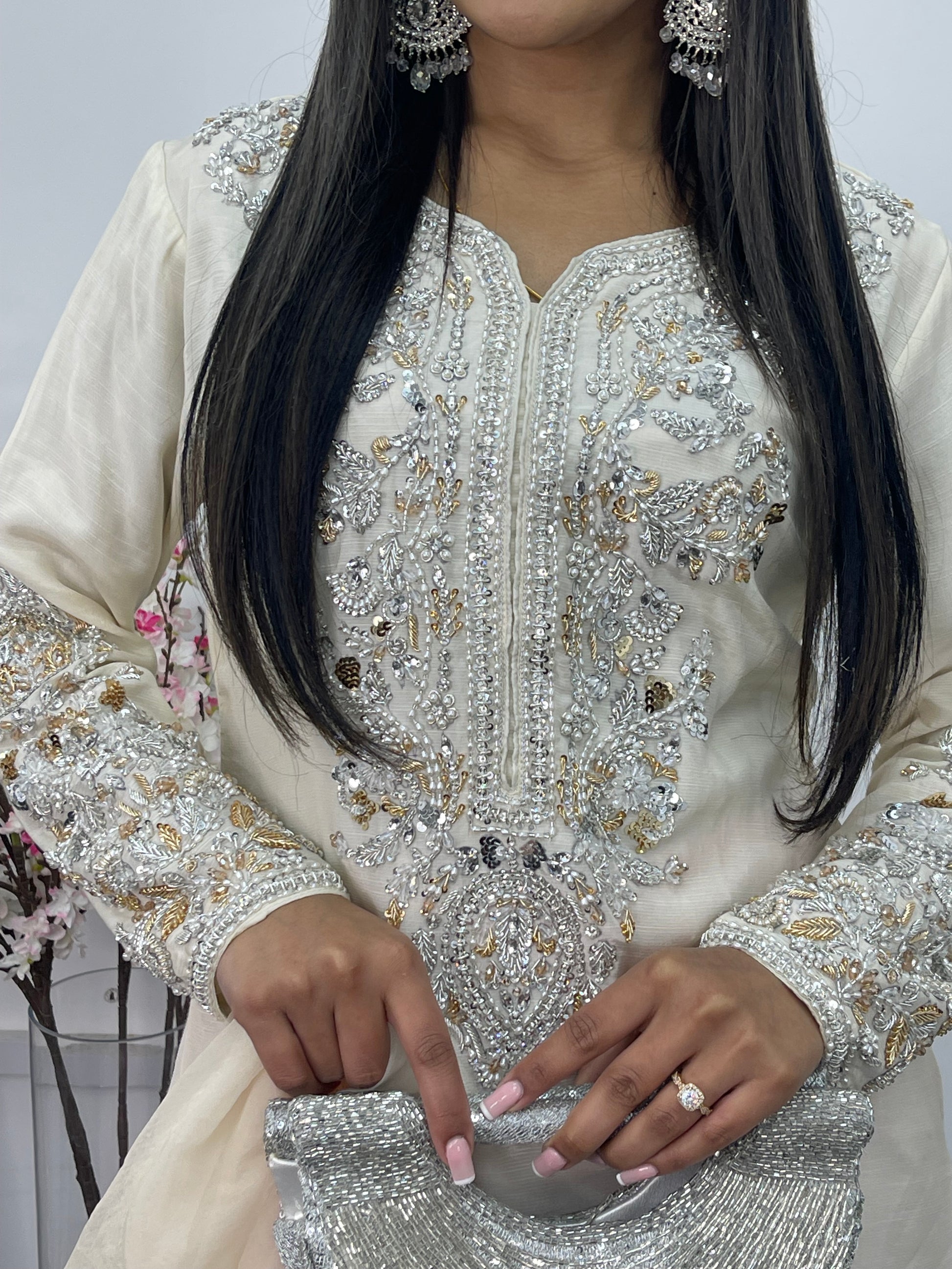 - **Elegant Embellishments:** The neckline and sleeves are beautifully hand-embellished, adding a touch of sophistication.