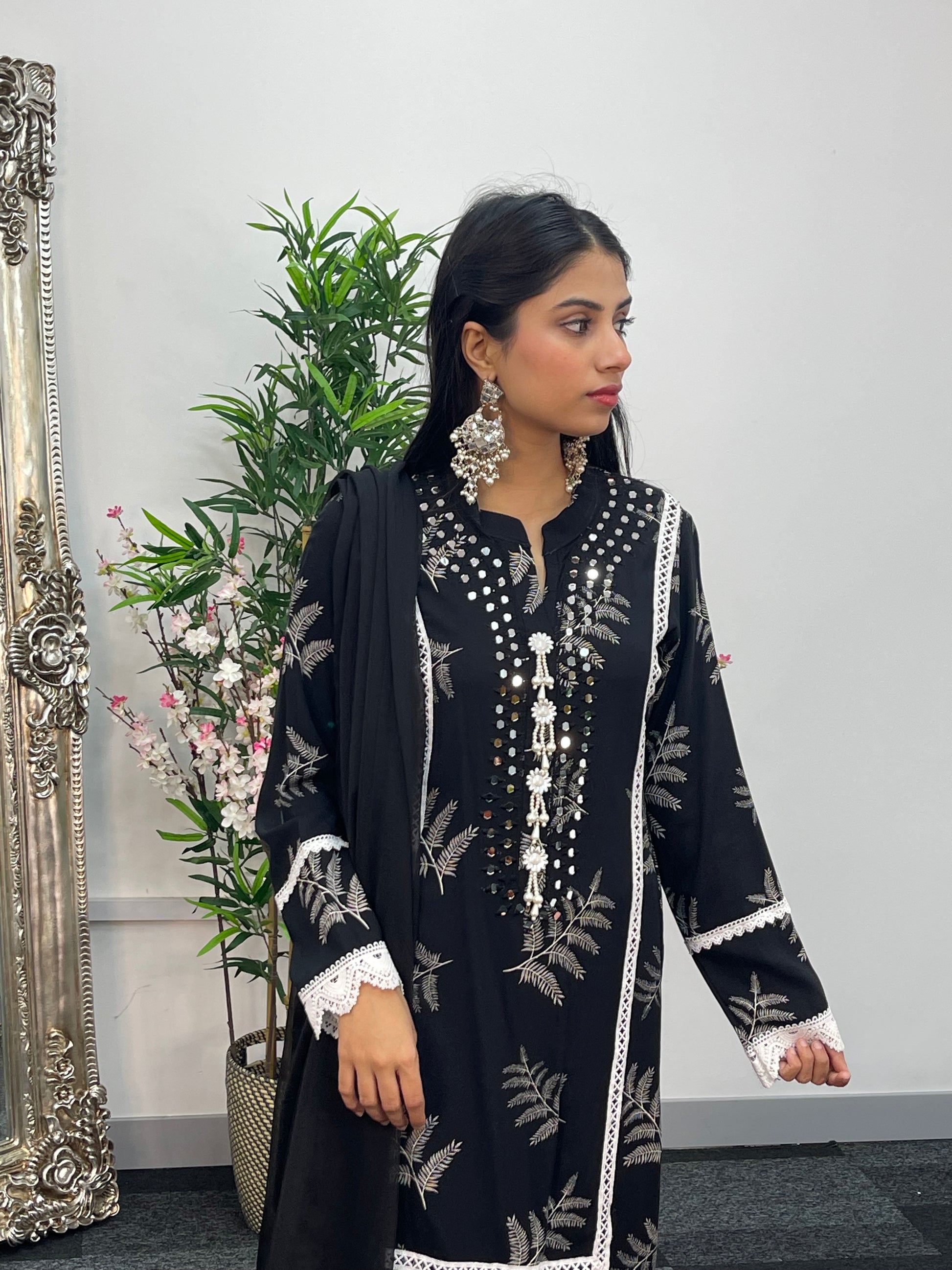 • Embroidery Detailing: Intricate embroidered neckline accentuated with delicate threadwork and mirror embellishments, adding a touch of glamour.