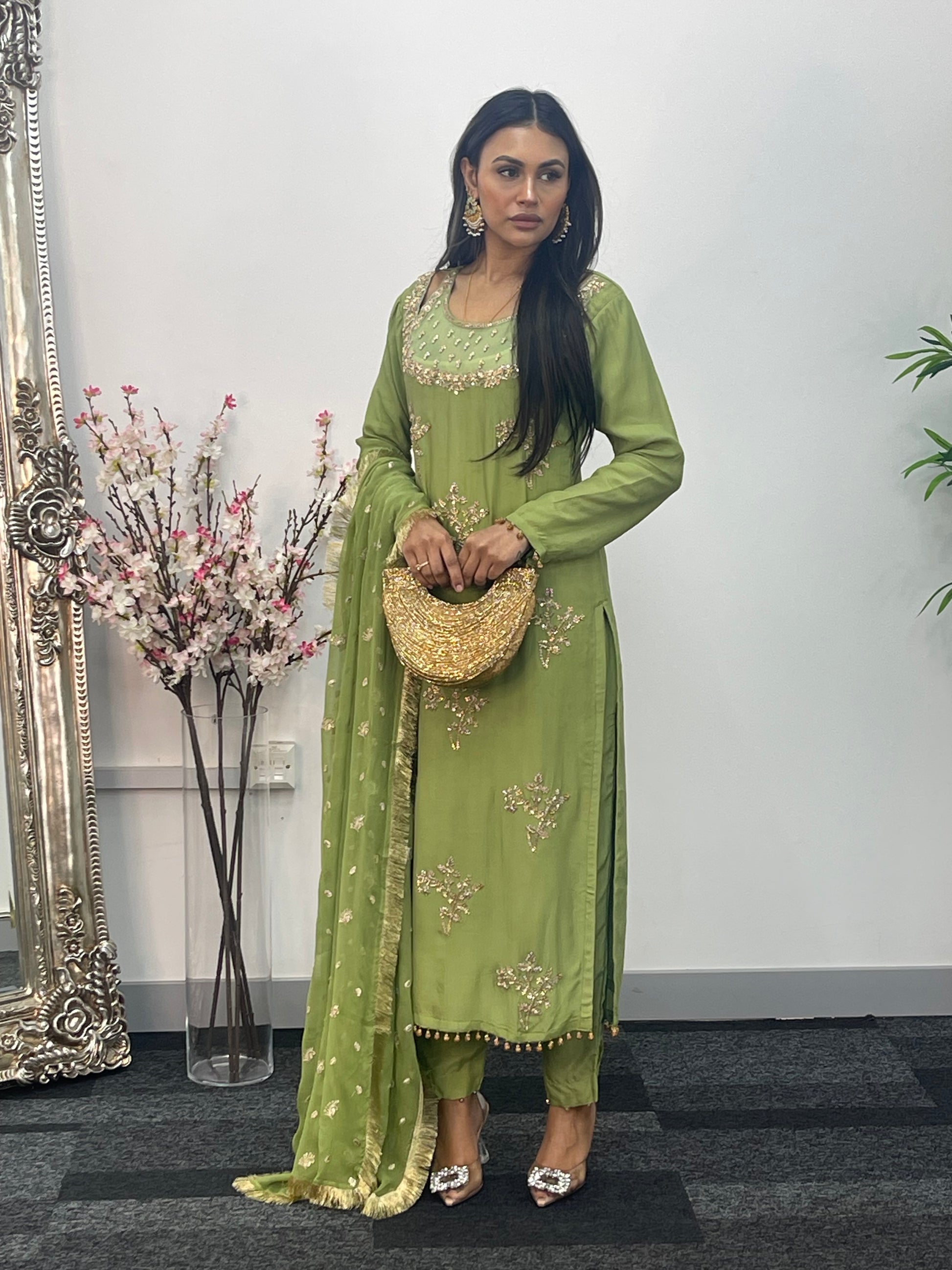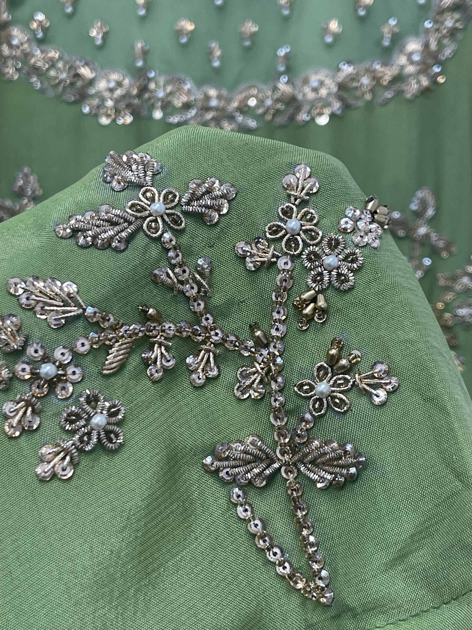 It is complemented by an elegant chiffon dupatta adorned with kiran lace along all four edges.