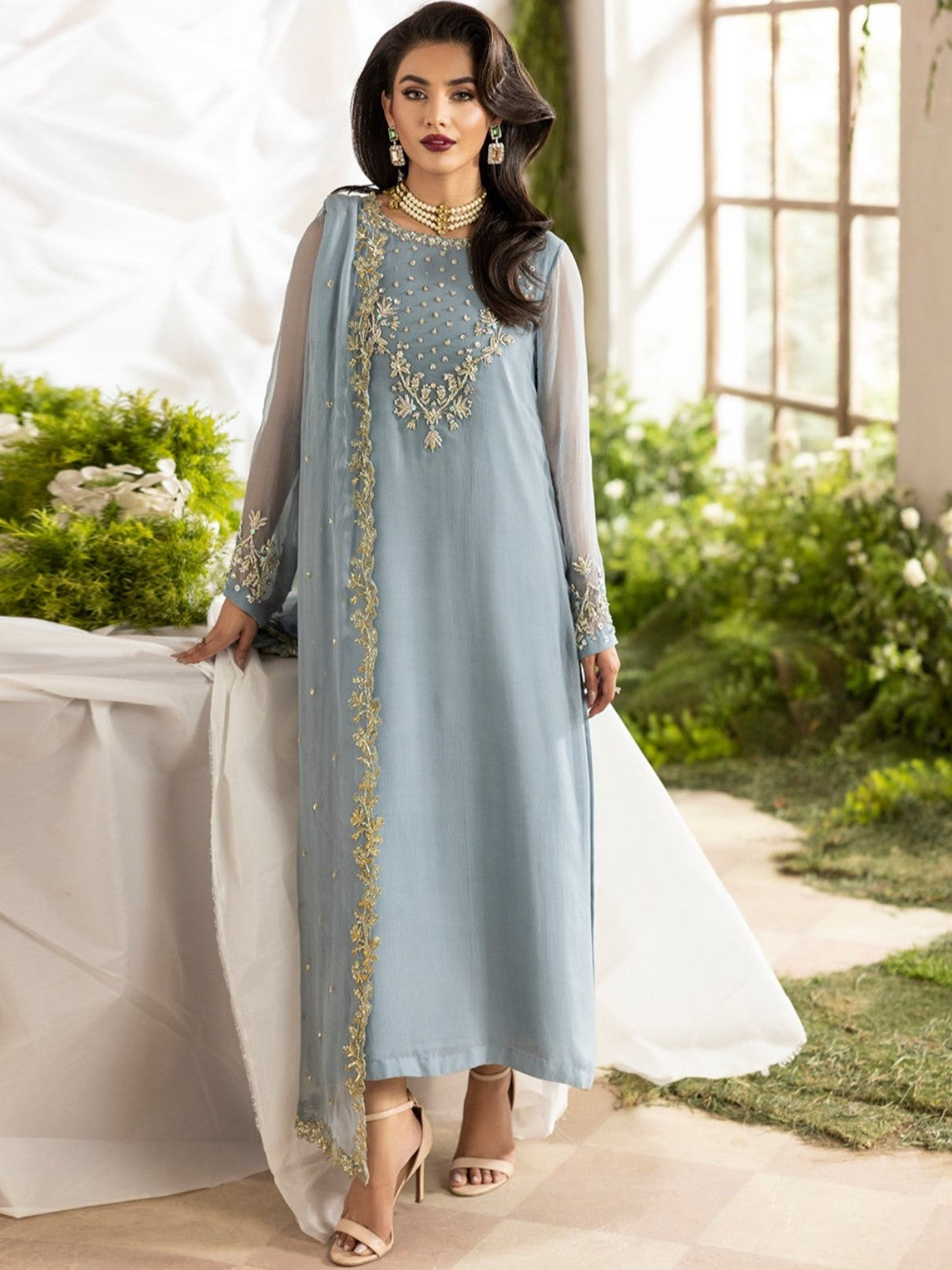 The look is completed with a beautiful extra-long dupatta adorned with embriodery, making it the perfect choice for any special occasion.