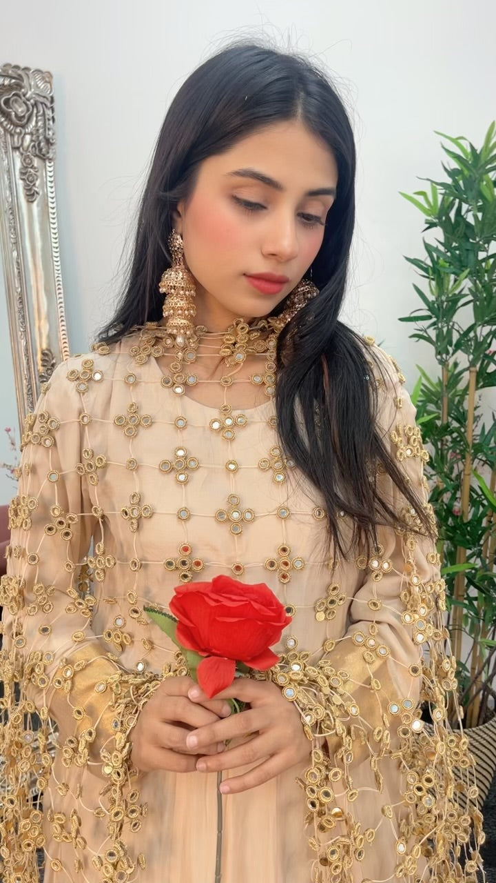 The dupatta comes paired with a double-flared maxi dress, finished with a rich gold lappa on the ghera, and includes kenken underneath for added volume and drama.